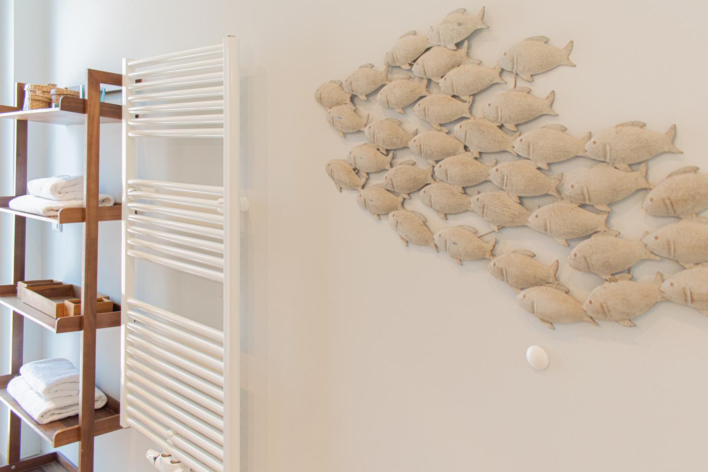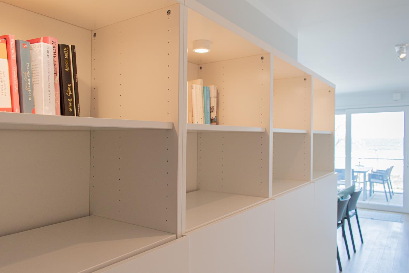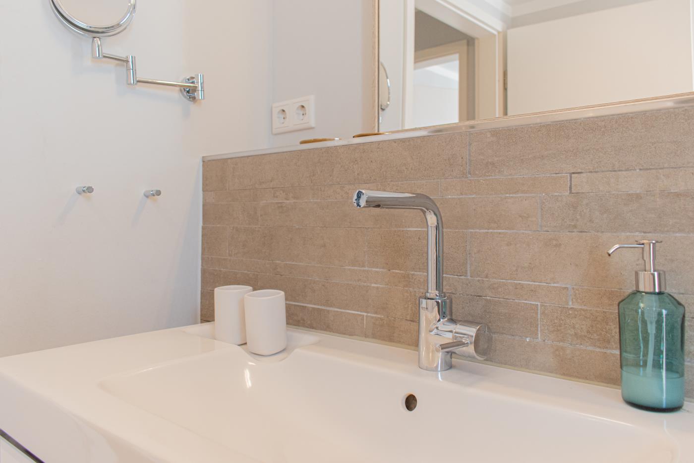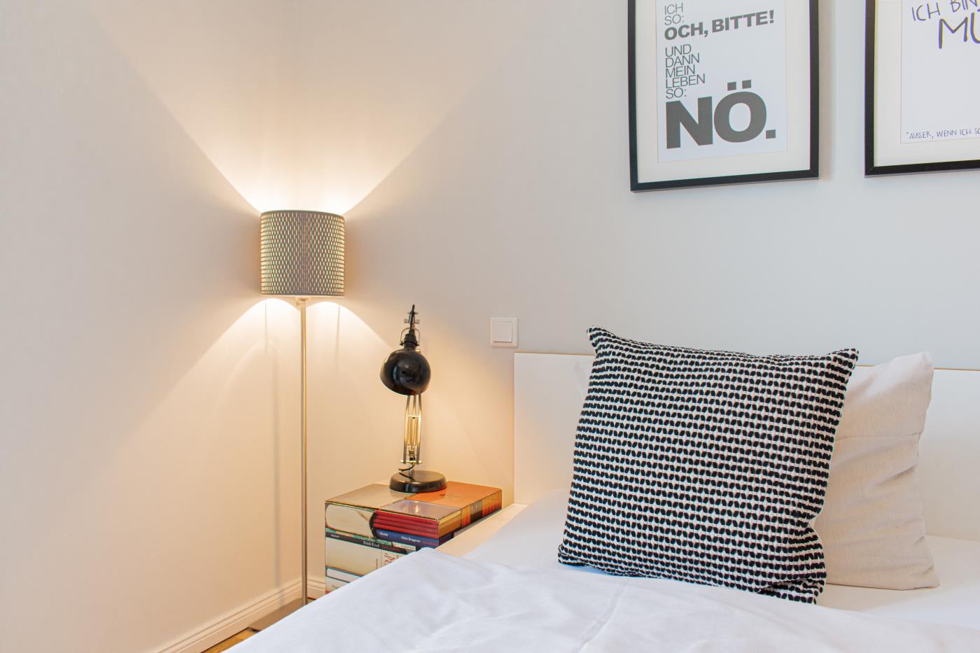 Drei Zimmer bieten Platz für bis zu vier Personen. Beide Schlafzimmer sind mit bequemen Doppelbetten (1,80 er Breite - durchgehende Matratze) ausgestattet. Die offene Küche ist komplett ausgestattet und lässt keine Wünsche offen. Bodentiefe Fenster im Wohnzimmer sorgen den ganzen Tag für eine helle und freundliche Atmosphäre. Vom Wohnzimmer aus gelangt man auf den großzügigen, möblierten Balkon von dem man einen traumhaften Meerblick genießen darf. Zwei Gartenliegen laden zum relaxen ein. Das moderne Badezimmer ist mit einer Regendusche und einem WC ausgestattet. Außerdem gibt es noch ein Gäste-WC in dem sich auch die Waschmaschine und der Trockner befinden. Eine Fußbodenheizung in der ganzen Wohnung rundet das vielfältige Angebot ab.
