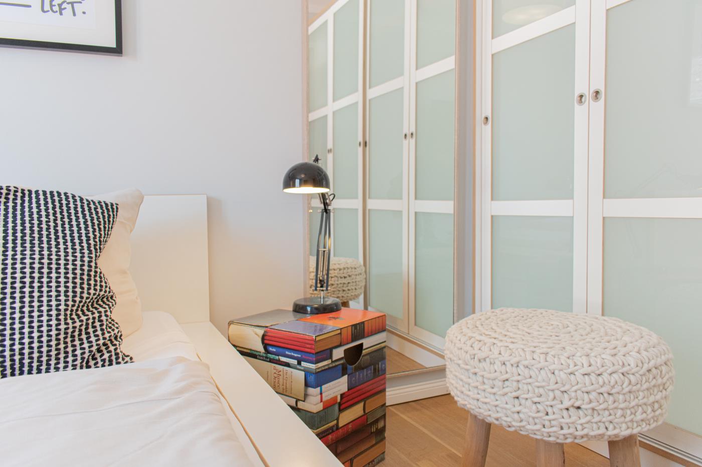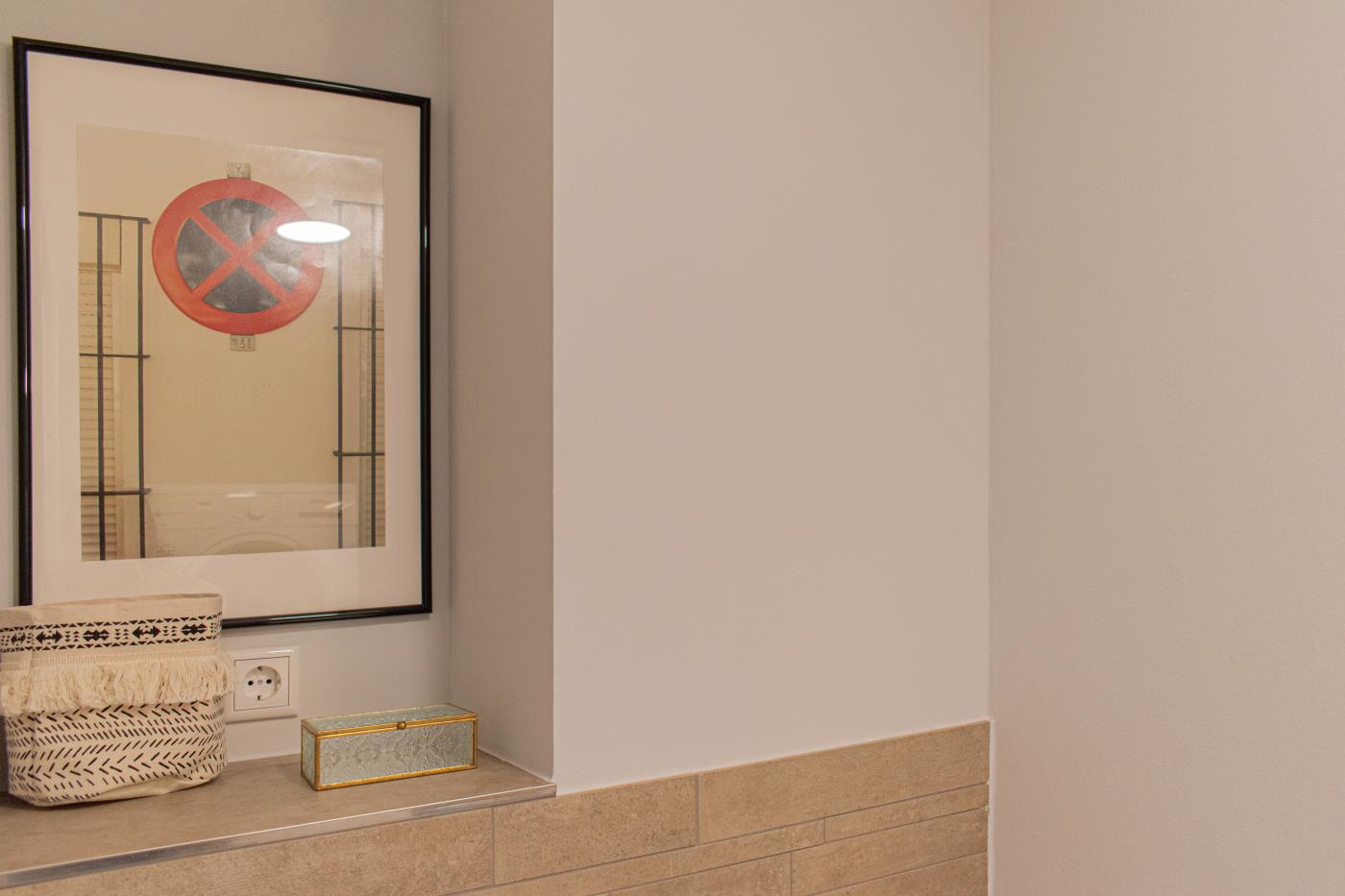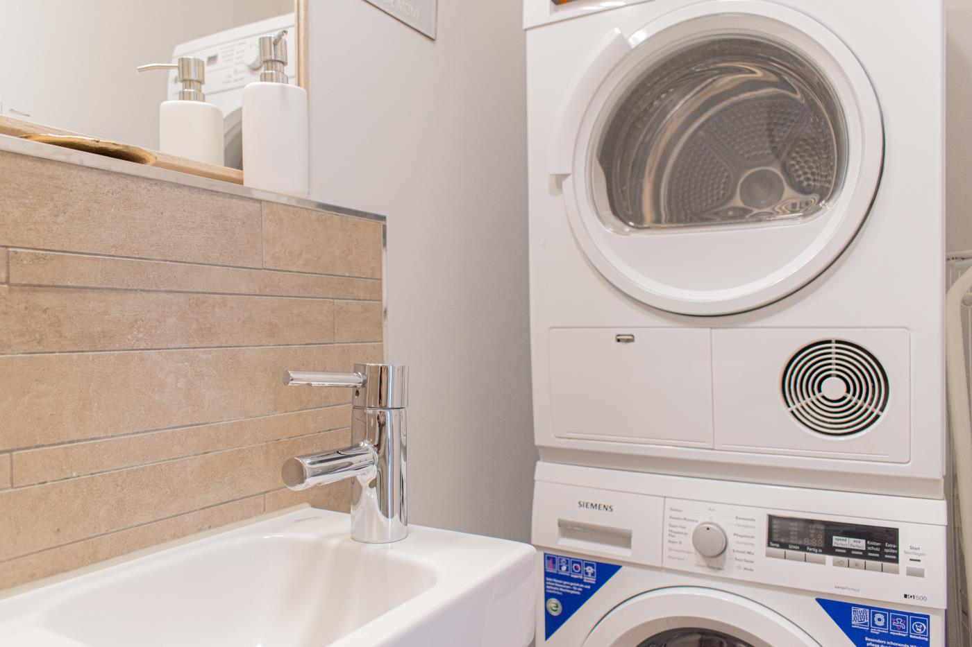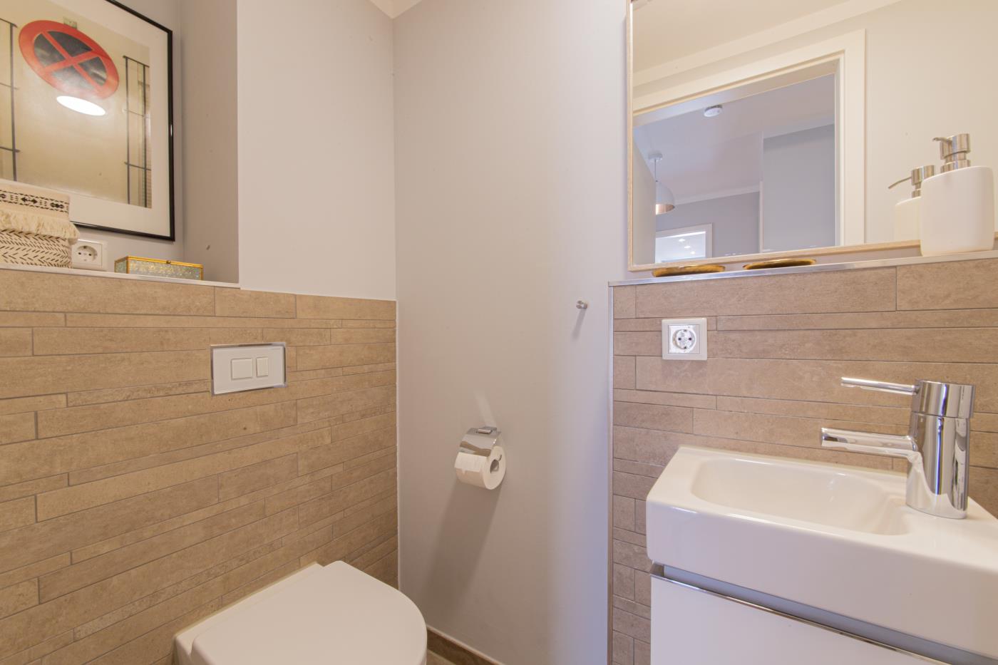 Drei Zimmer bieten Platz für bis zu vier Personen. Beide Schlafzimmer sind mit bequemen Doppelbetten (1,80 er Breite - durchgehende Matratze) ausgestattet. Die offene Küche ist komplett ausgestattet und lässt keine Wünsche offen. Bodentiefe Fenster im Wohnzimmer sorgen den ganzen Tag für eine helle und freundliche Atmosphäre. Vom Wohnzimmer aus gelangt man auf den großzügigen, möblierten Balkon von dem man einen traumhaften Meerblick genießen darf. Zwei Gartenliegen laden zum relaxen ein. Das moderne Badezimmer ist mit einer Regendusche und einem WC ausgestattet. Außerdem gibt es noch ein Gäste-WC in dem sich auch die Waschmaschine und der Trockner befinden. Eine Fußbodenheizung in der ganzen Wohnung rundet das vielfältige Angebot ab.