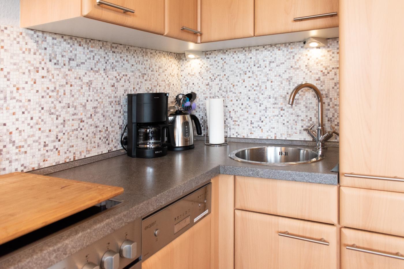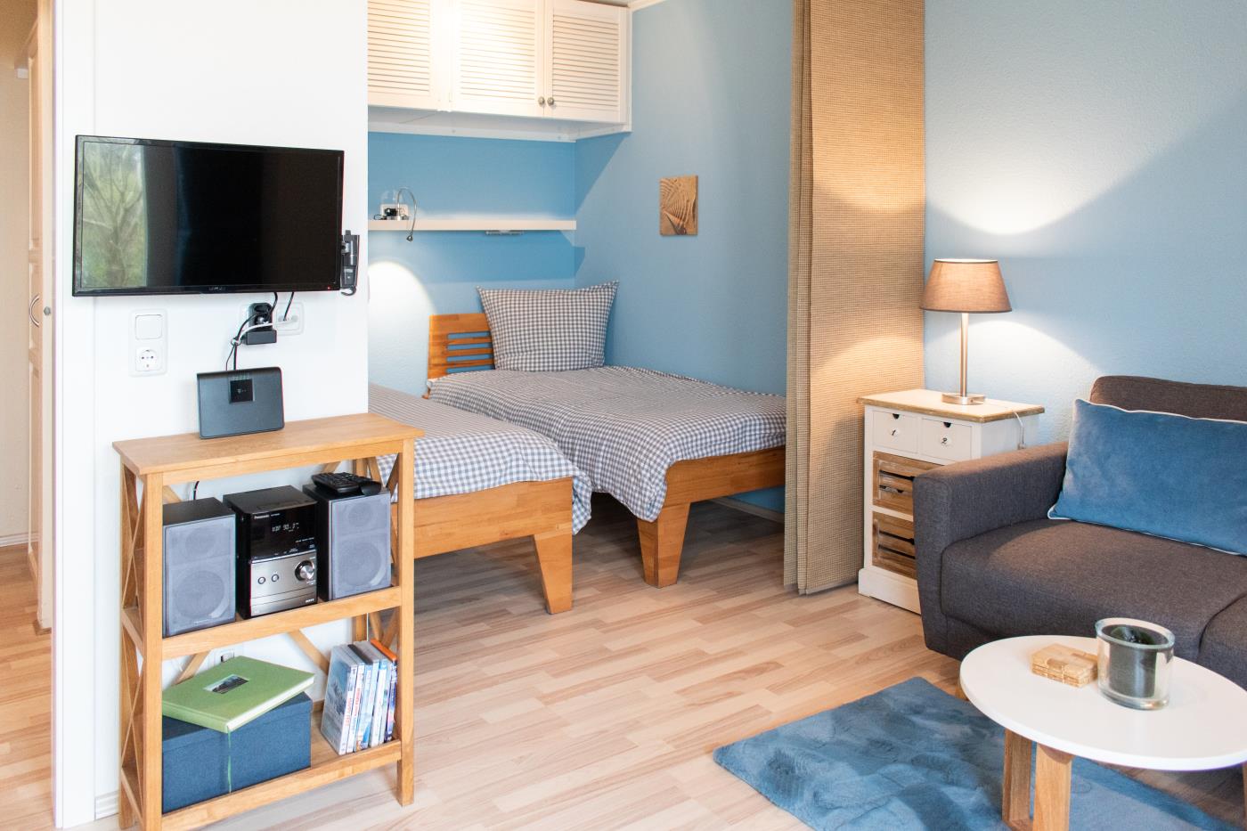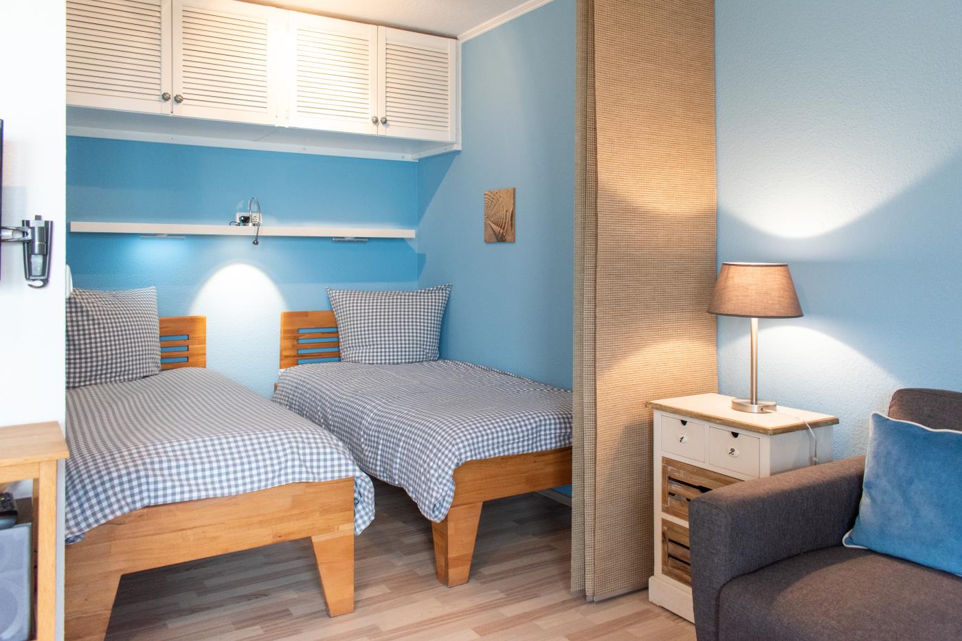 Das stilvolle Einzimmerappartement mit Terrasse und offener Küche bietet Platz für bis zu zwei Gäste. Der Wohn- und Schlafbereich ist mit zwei komfortablen Einzelbetten ausgestattet, die bei Bedarf zu einem Doppelbett zusammengestellt werden können. Mithilfe eines Raumtrenners lässt sich eine gemütliche Schlafnische schaffen. Ein Kleiderschrank befindet sich praktisch im Flurbereich. Die offene Küche ist vollständig ausgestattet und erfüllt alle Wünsche für den täglichen Bedarf. Große Fenster sorgen den ganzen Tag über für eine helle, freundliche Atmosphäre und führen direkt auf die großzügige, möblierte Terrasse mit südlicher Ausrichtung. Das moderne Badezimmer verfügt über eine Dusche und ein WC. Elektrische Rollläden ermöglichen eine vollständige Abdunkelung der Wohnung und sorgen für optimalen Wohn- und Schlafkomfort.