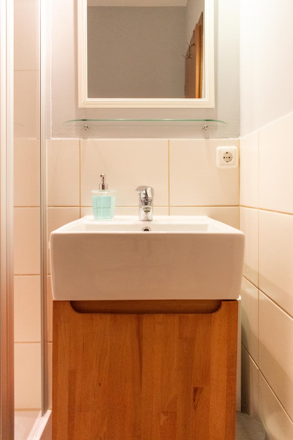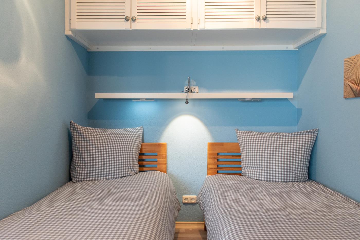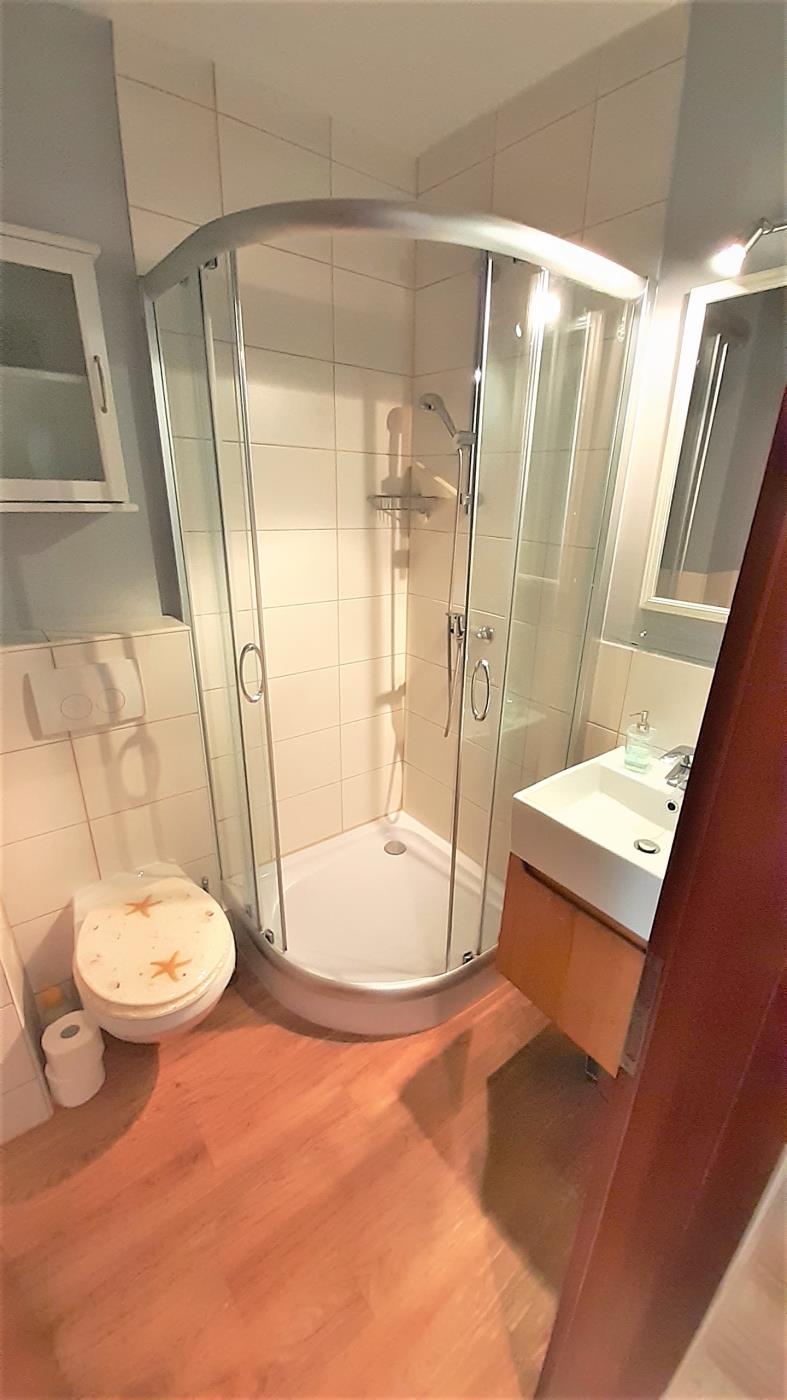 Das stilvolle Einzimmerappartement mit Terrasse und offener Küche bietet Platz für bis zu zwei Gäste. Der Wohn- und Schlafbereich ist mit zwei komfortablen Einzelbetten ausgestattet, die bei Bedarf zu einem Doppelbett zusammengestellt werden können. Mithilfe eines Raumtrenners lässt sich eine gemütliche Schlafnische schaffen. Ein Kleiderschrank befindet sich praktisch im Flurbereich. Die offene Küche ist vollständig ausgestattet und erfüllt alle Wünsche für den täglichen Bedarf. Große Fenster sorgen den ganzen Tag über für eine helle, freundliche Atmosphäre und führen direkt auf die großzügige, möblierte Terrasse mit südlicher Ausrichtung. Das moderne Badezimmer verfügt über eine Dusche und ein WC. Elektrische Rollläden ermöglichen eine vollständige Abdunkelung der Wohnung und sorgen für optimalen Wohn- und Schlafkomfort.