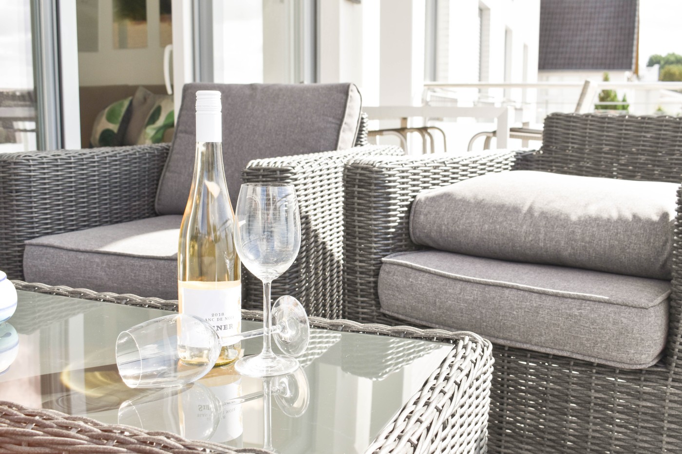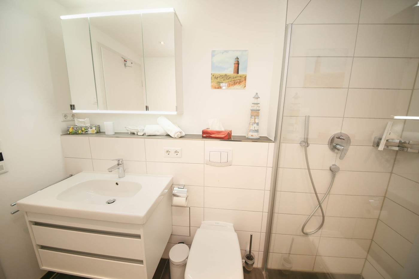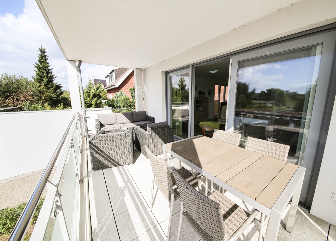 Der lichtdurchflutete und moderne Wohnraum ist geschickt aufgeteilt: Die offene Küche grenzt direkt an den Essplatz, sodass man auch im Urlaub gemeinsam kulinarische Highlights zaubern kann. Direkt an der Fensterfront befindet sich die große Couchecke mit einem gemütlichen TV-Sessel. Von hier gelangen Sie auf den Balkon mit Essplatz und Loungemöbeln zum Relaxen. Dank der Ausrichtung nach Westen lässt sich hier von mittags bis abends die Sonne genießen. Ebenso auf dieser Etage befindet sich eines der beiden Schlafzimmer, welches mit einem bequemen Doppelbett (1,80er Breite) und einem geräumigen Kleiderschrank ausgestattet ist. Die hochwertigen Matratzen der Marke Irisette sorgen für einen besonders erholsamen Schlaf. Das Badezimmer glänzt mit einer ebenerdigen Rainfalldusche und einem Handtuchheizkörper. Im unteren Bereich der Wohnung befindet sich ein weiteres Badezimmer, welches dem oberen Bad in Nichts nachsteht. Zusätzlich gibt es hier eine Waschmaschine, die den Familienurlaub perfekt macht! Das zweite Schlafzimmer verfügt über ein Schrankbett, welches dank der hohen Qualität den Komfort eines normalen Bettes verspricht. Zudem lassen sich beide Schlafzimmer durch Rollläden verdunkeln. Außerdem haben Sie hier Zugang zu der windgeschützten Terrasse, die mit einer Rasenfläche umgeben ist. Diese eignet sich hervorragend für Kinder zum Toben und Spielen.