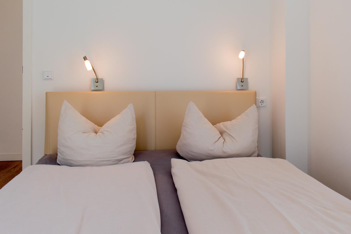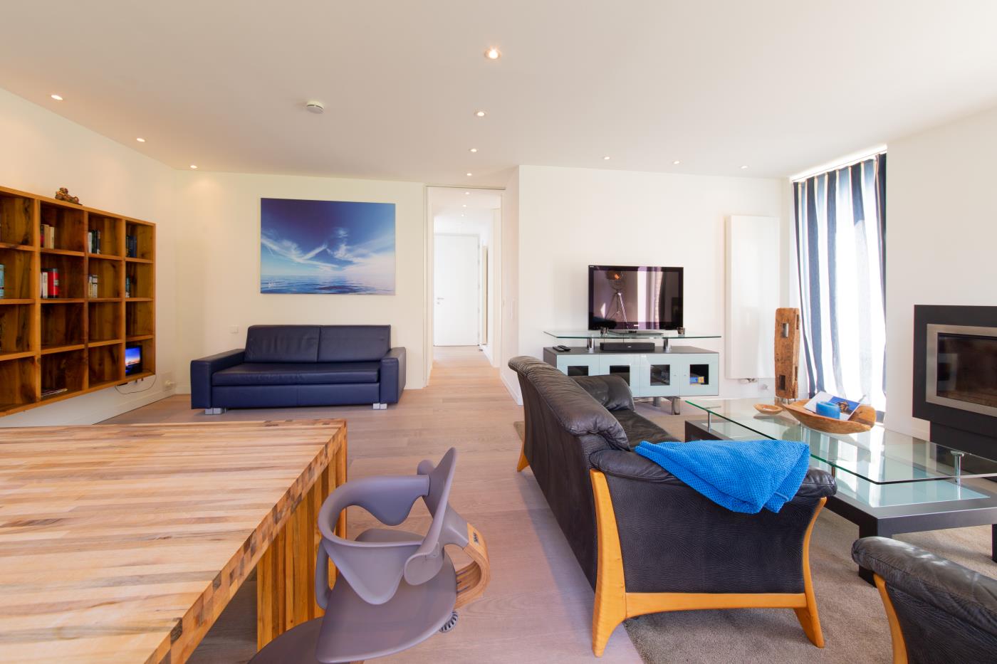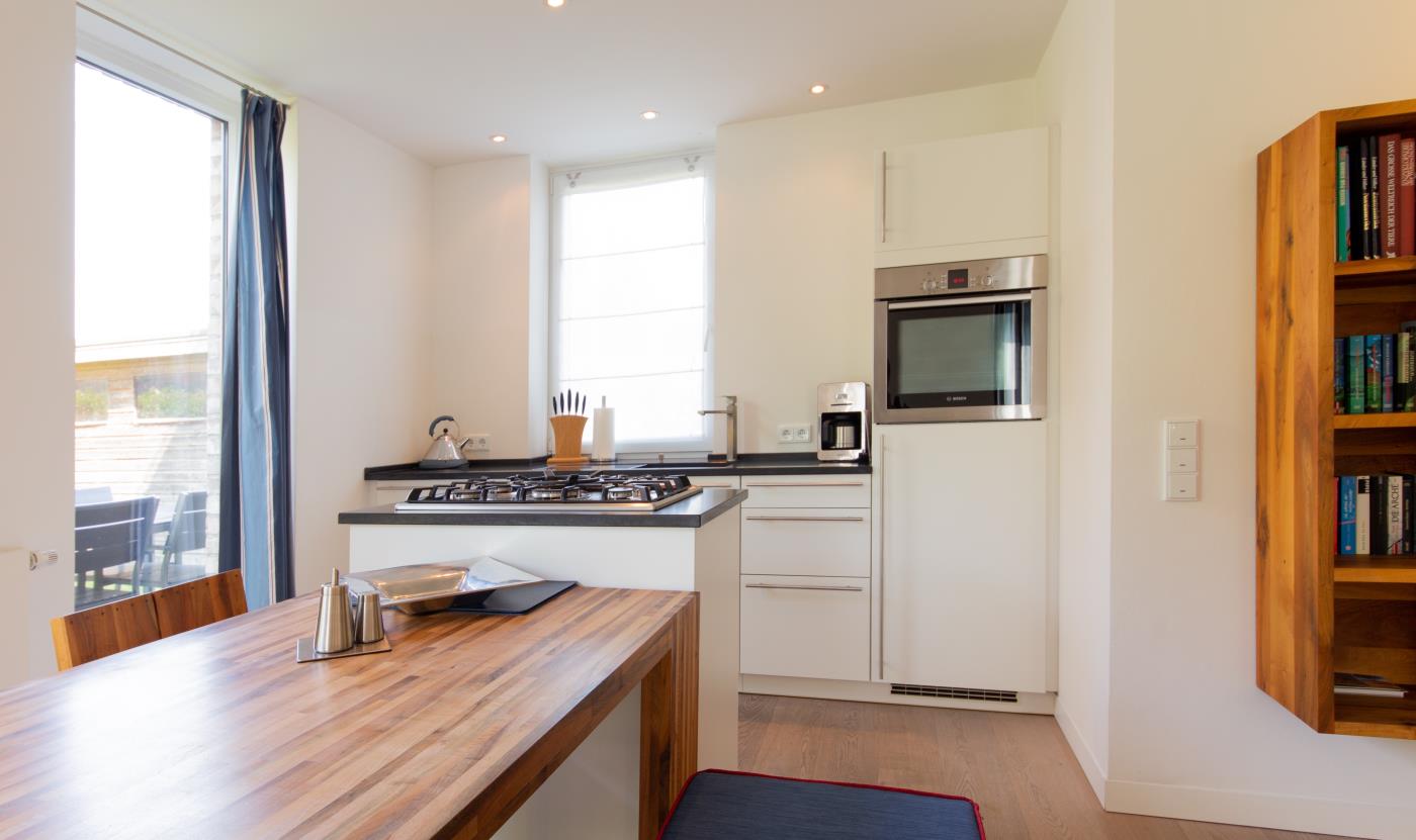 Die lichtdurchflutete Ferienwohnung wurde gekonnt und geschmackvoll eingerichtet. Helle Farben sowie das schlichte und stilvolle Design mit Highlights in frischen Blau- und Aquamarintönen sorgen für einen besonderen und individuellen Charakter. In der gesamten Wohnung wurde hochwertiges Eichenparkett verlegt und die Fußbodenheizung schafft eine wohlige Atmosphäre. Die Fenster können durch Gardinen verdunkelt werden.