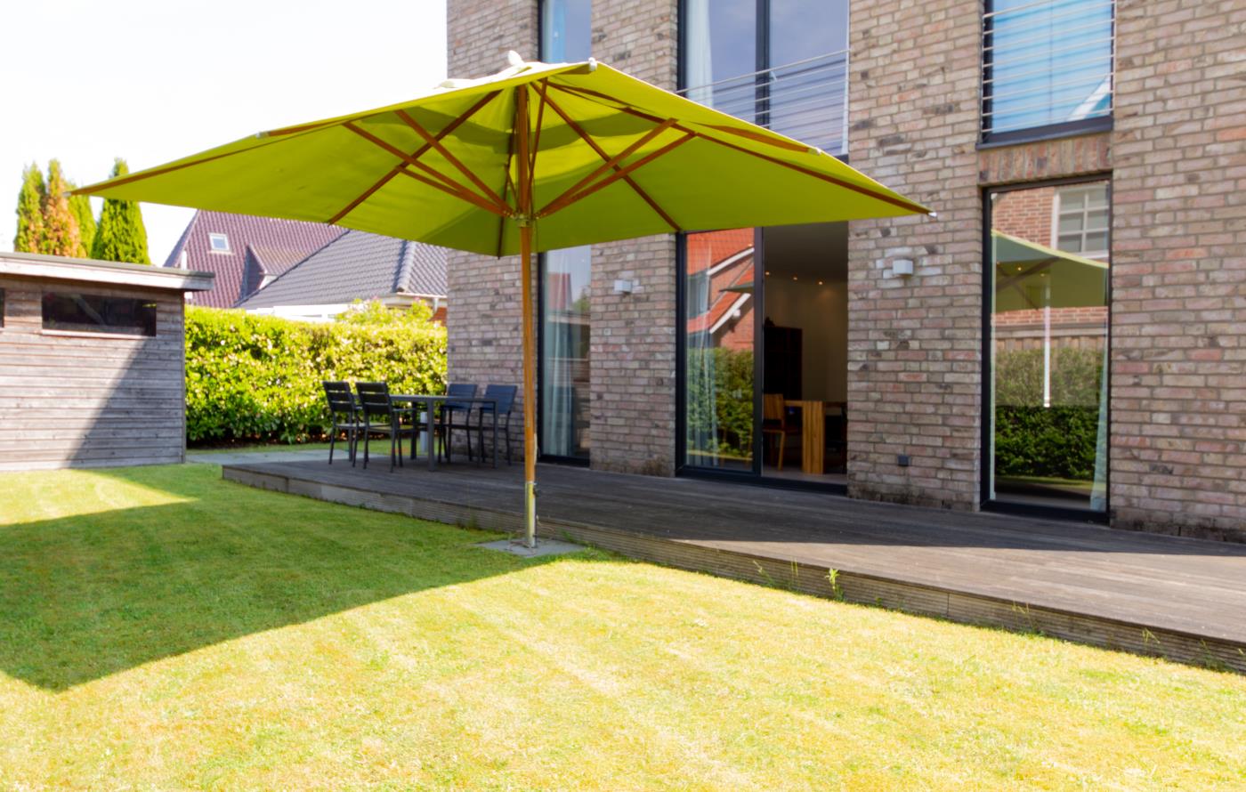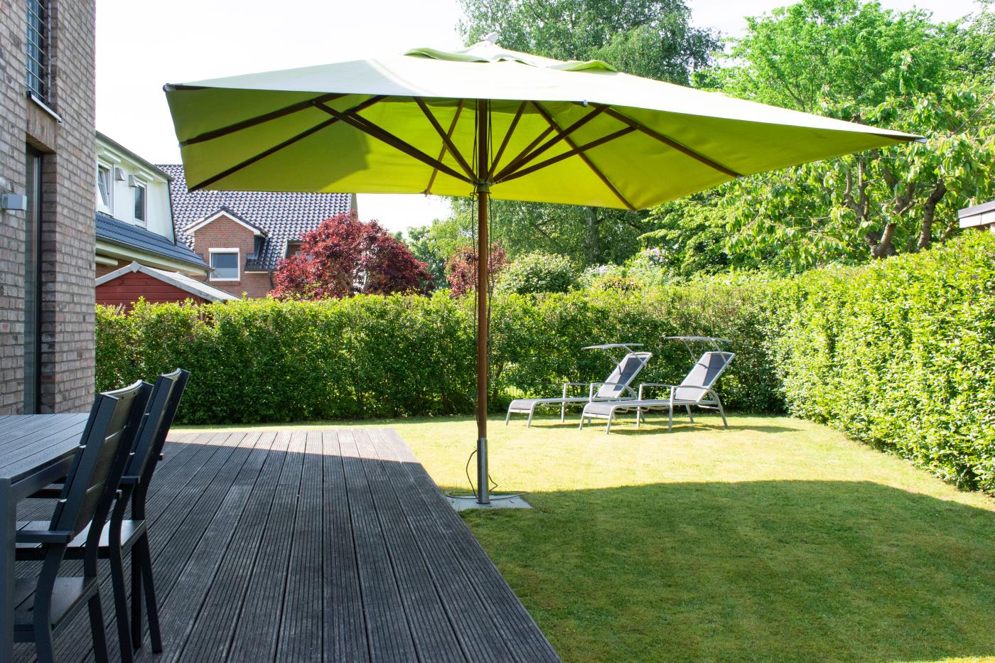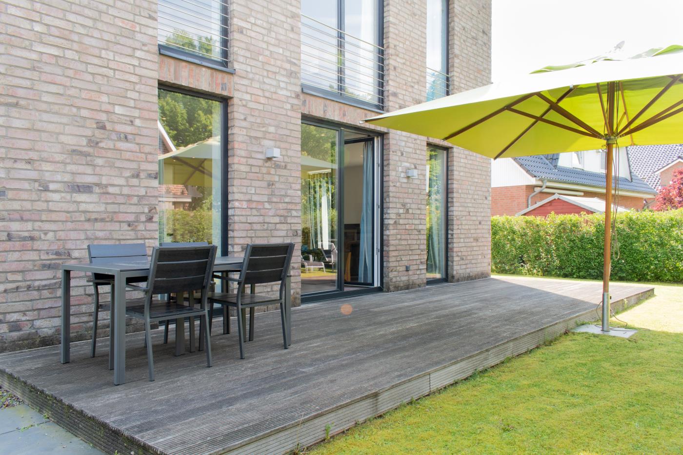 Die Ferienwohnung empfängt Sie mit einem großzügigen und Eingangsbereich. Das Schlafzimmer linker Hand ist mit einem Doppelbett (1,60er Breite), einem großen Kleiderschrank mit Schiebetüren und einem Flat-TV ausgestattet. Gegenüberliegend befindet sich das Badezimmer, welches elegant in Schwarz gehalten ist. Hier wird Ihr Wellnessherz dank der Badewanne und der Walk-In-Dusche mit Rain Shower Duschkopf höherschlagen. Der lichtdurchflutete Wohnbereich ist geschickt aufgeteilt: die gemütliche Ledercouchecke ist rund um den Flat-TV und Kamin platziert. Die separate Schlafcouch bietet mit 1,50 Meter Breite Platz für zwei weitere Gäste. Der große Esstisch grenzt direkt an die offene Küche mit Kochinsel an. Der absolute Kracher ist der Gasherd mit Wokbrenner, hier kommt jeder Hobbychefkoch voll auf seine Kosten. Vom Wohnraum gelangen Sie auf die Terrasse mit Essplatz, Sonnenliegen und einem Sonnenschirm, welche Richtung Westen ausgerichtet ist. Der große Garten eignet sich hervorragend zum Spielen und Sonne genießen.