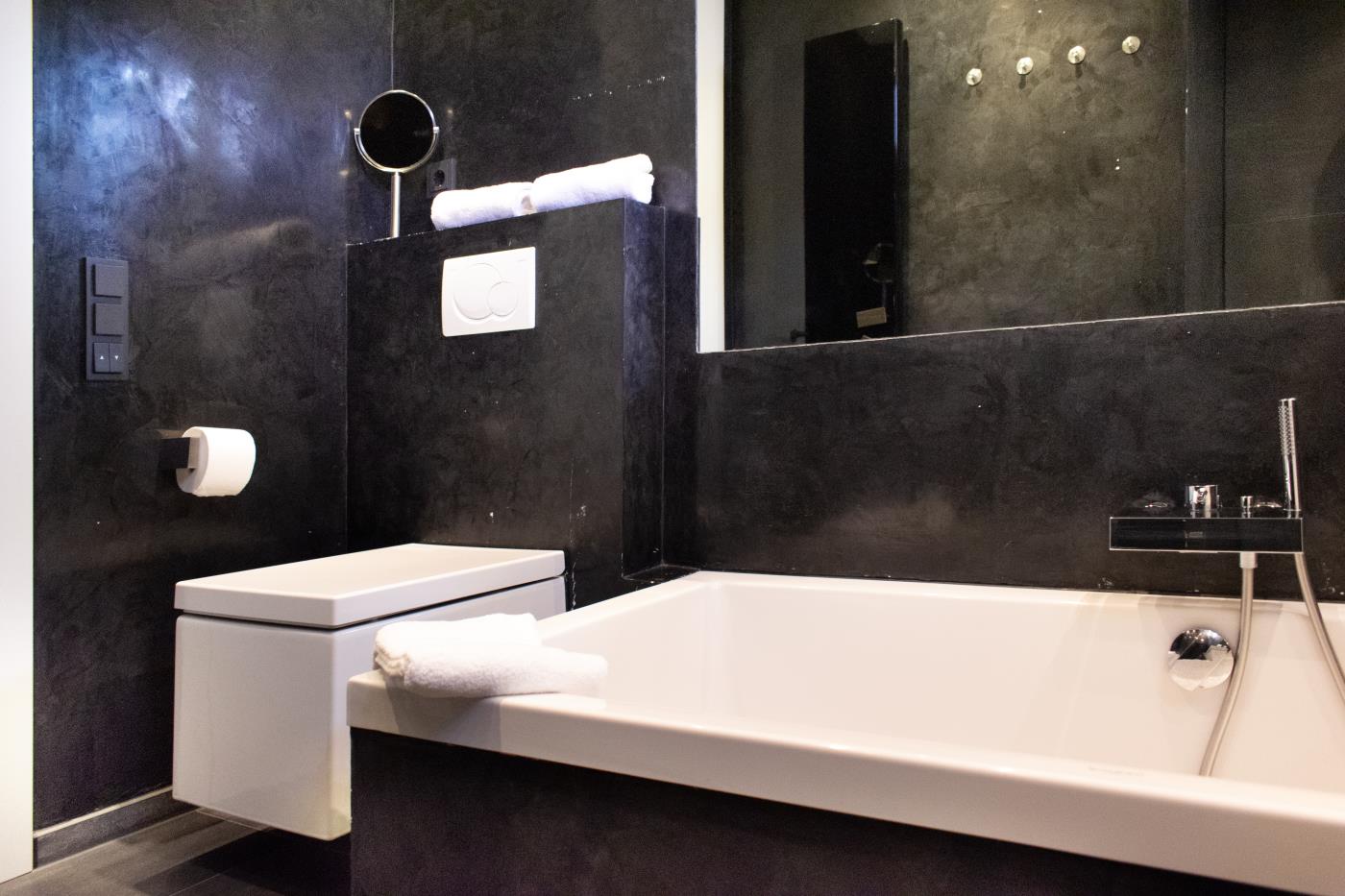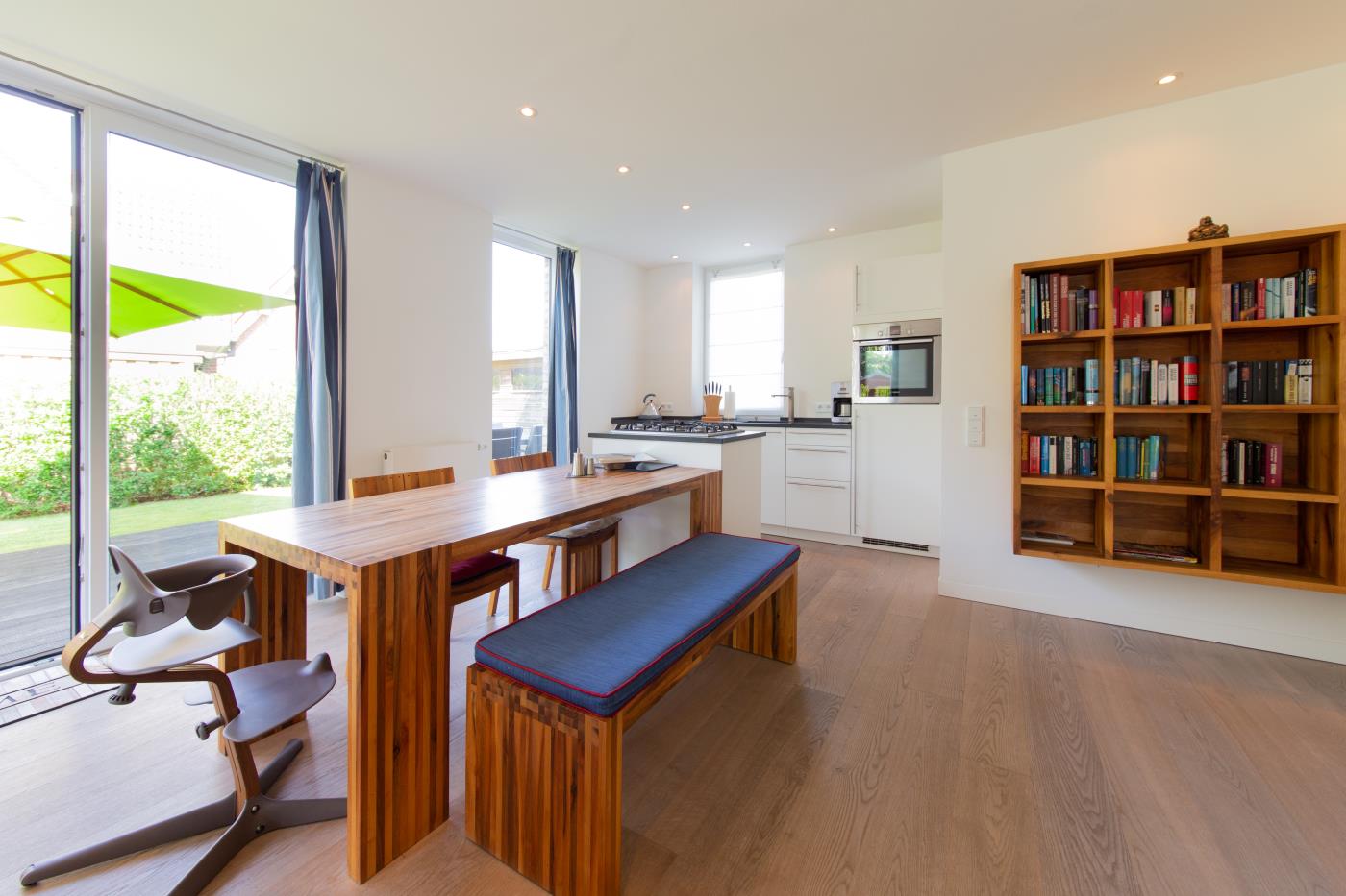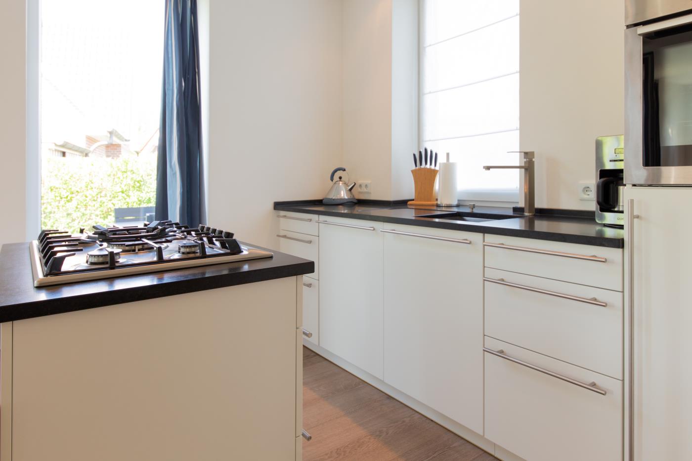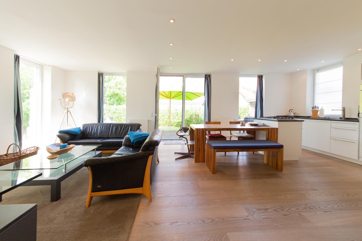 Die Ferienwohnung empfängt Sie mit einem großzügigen und Eingangsbereich. Das Schlafzimmer linker Hand ist mit einem Doppelbett (1,60er Breite), einem großen Kleiderschrank mit Schiebetüren und einem Flat-TV ausgestattet. Gegenüberliegend befindet sich das Badezimmer, welches elegant in Schwarz gehalten ist. Hier wird Ihr Wellnessherz dank der Badewanne und der Walk-In-Dusche mit Rain Shower Duschkopf höherschlagen. Der lichtdurchflutete Wohnbereich ist geschickt aufgeteilt: die gemütliche Ledercouchecke ist rund um den Flat-TV und Kamin platziert. Die separate Schlafcouch bietet mit 1,50 Meter Breite Platz für zwei weitere Gäste. Der große Esstisch grenzt direkt an die offene Küche mit Kochinsel an. Der absolute Kracher ist der Gasherd mit Wokbrenner, hier kommt jeder Hobbychefkoch voll auf seine Kosten. Vom Wohnraum gelangen Sie auf die Terrasse mit Essplatz, Sonnenliegen und einem Sonnenschirm, welche Richtung Westen ausgerichtet ist. Der große Garten eignet sich hervorragend zum Spielen und Sonne genießen.