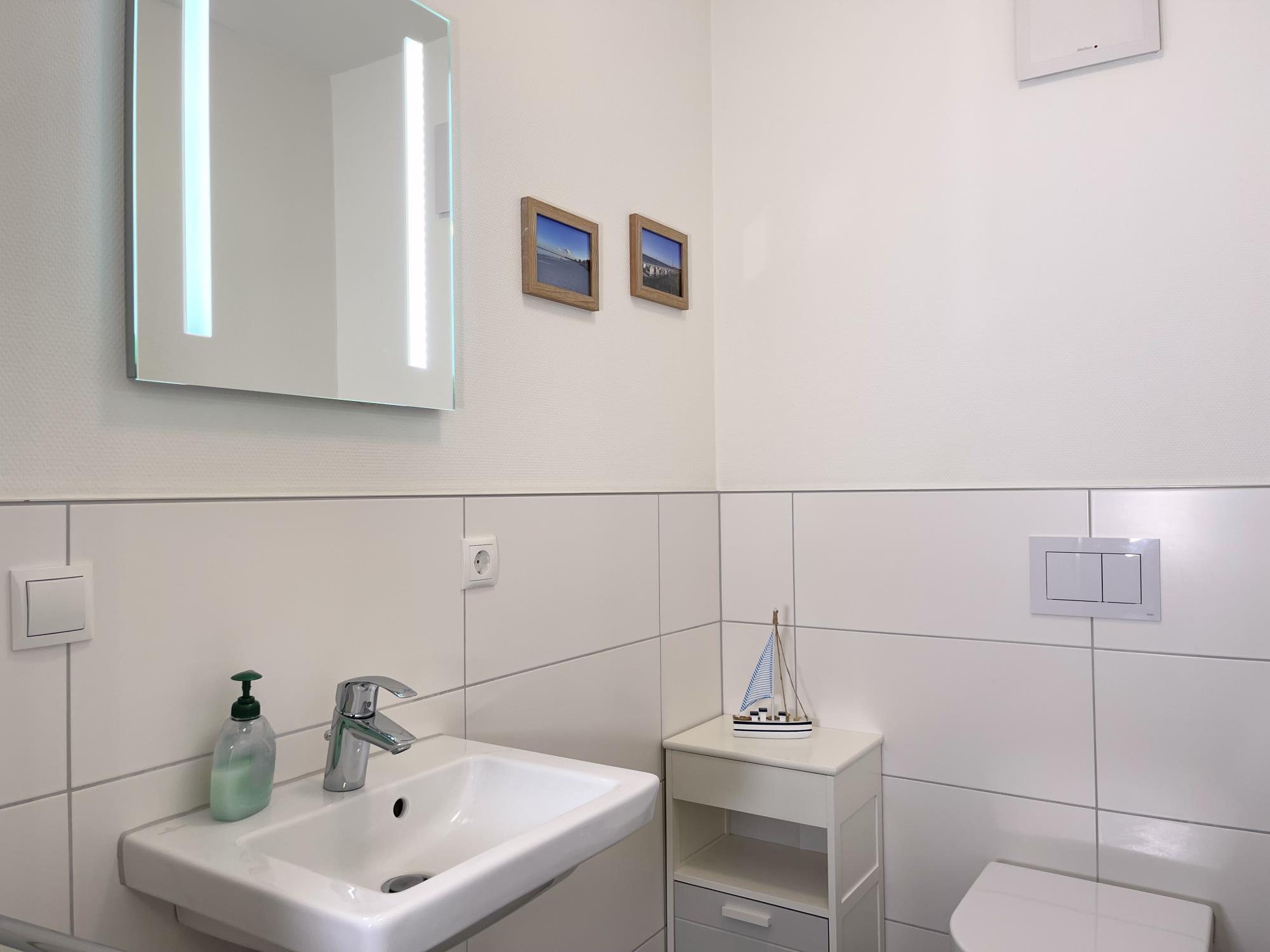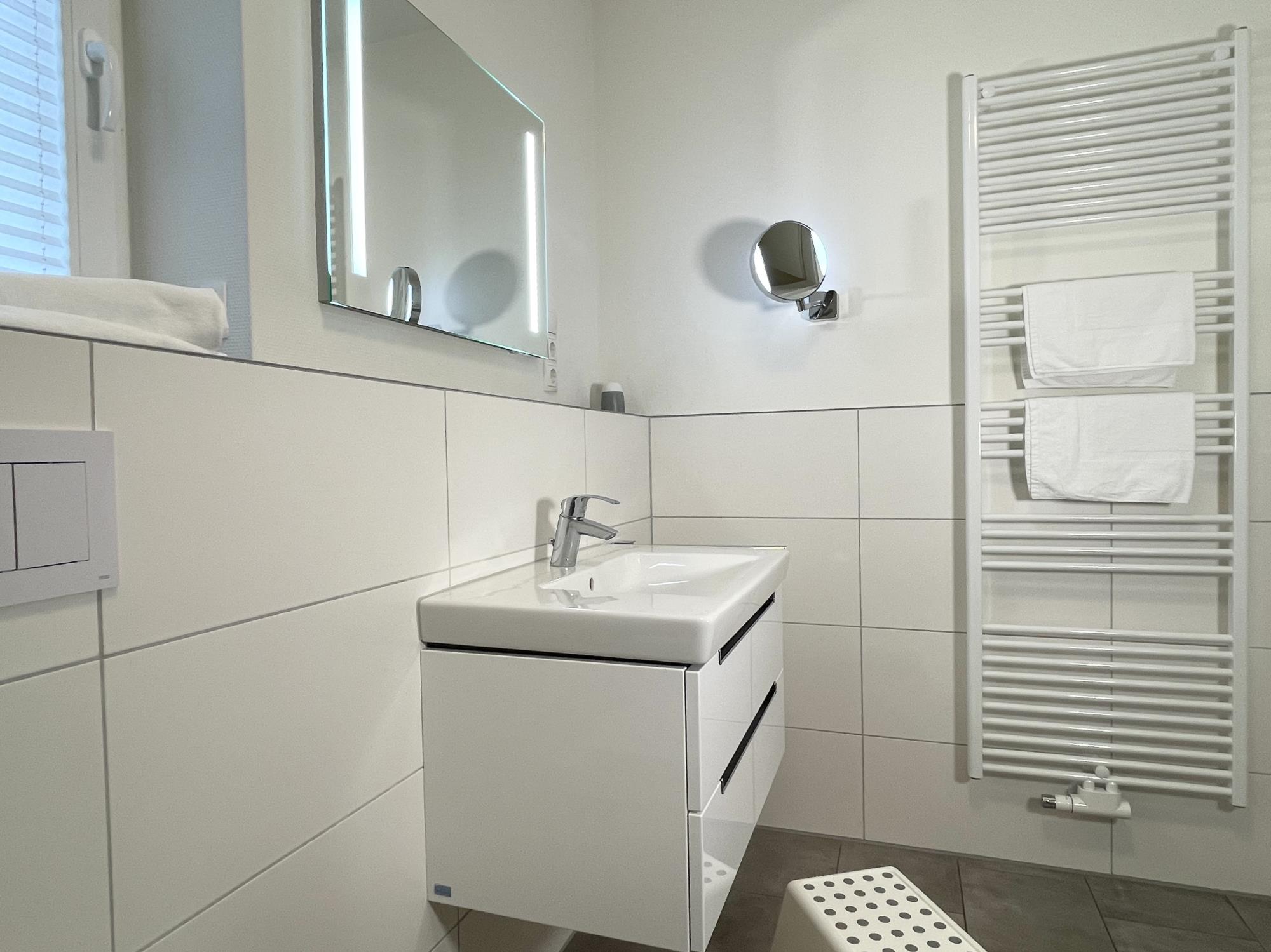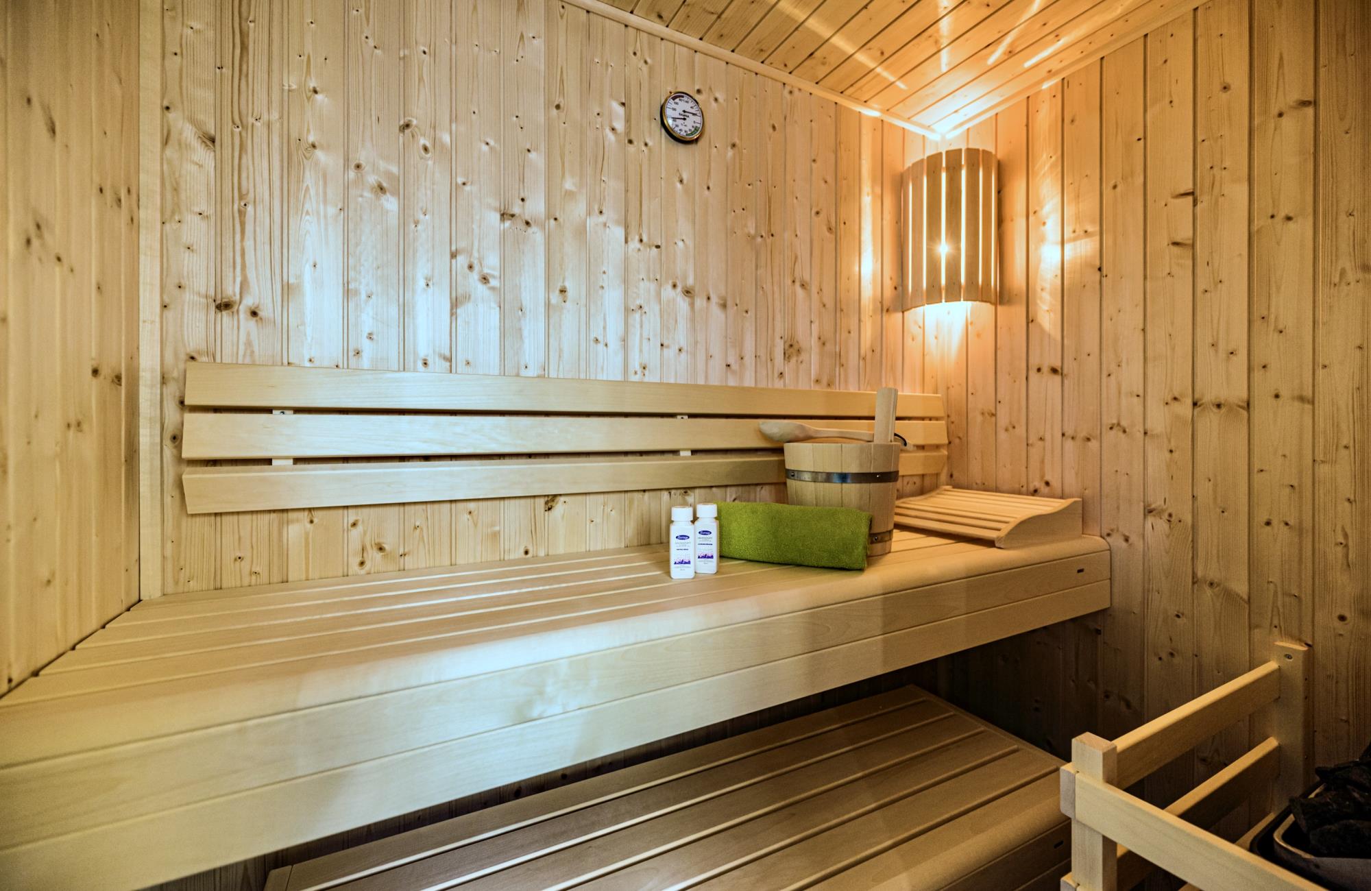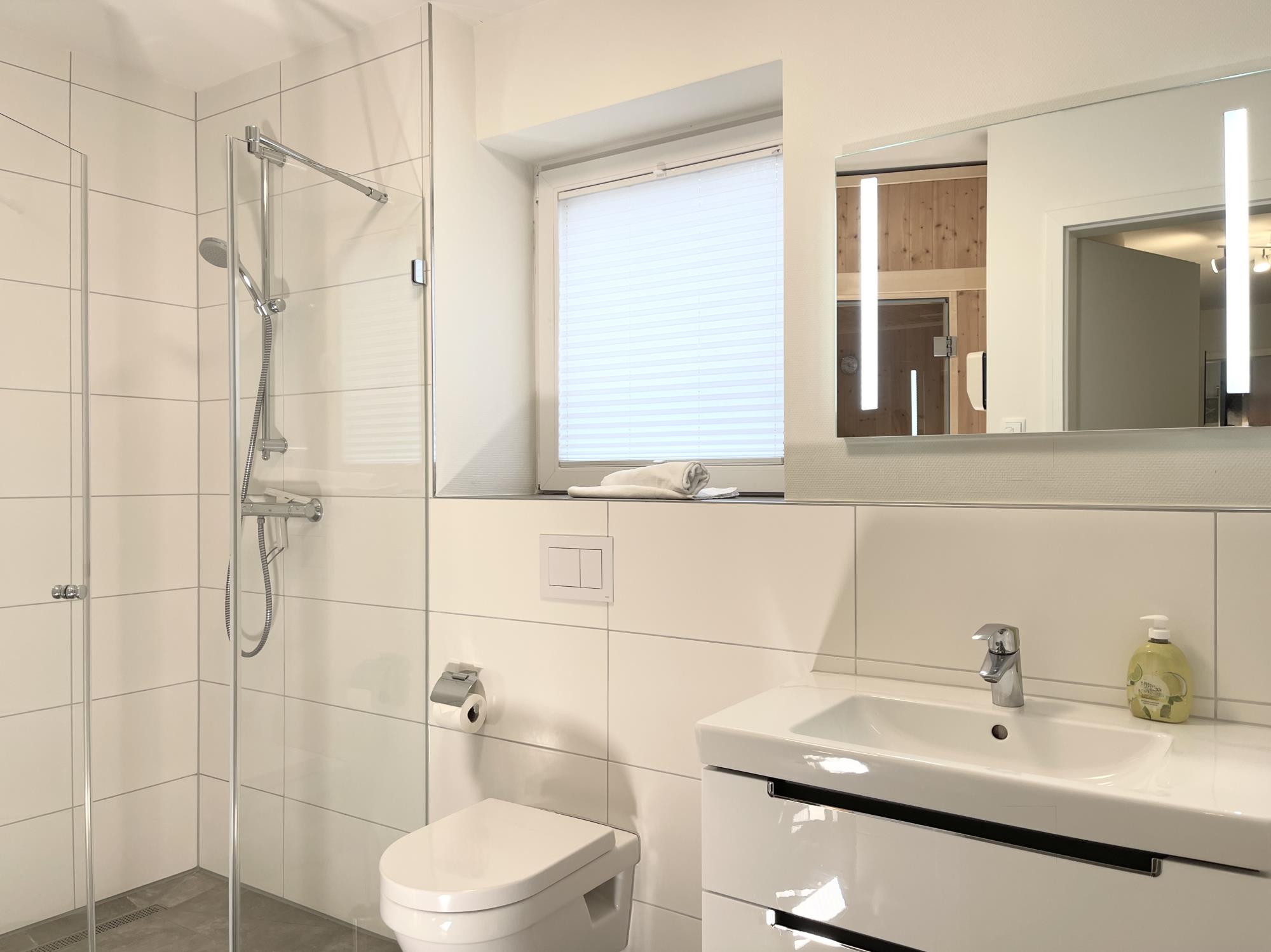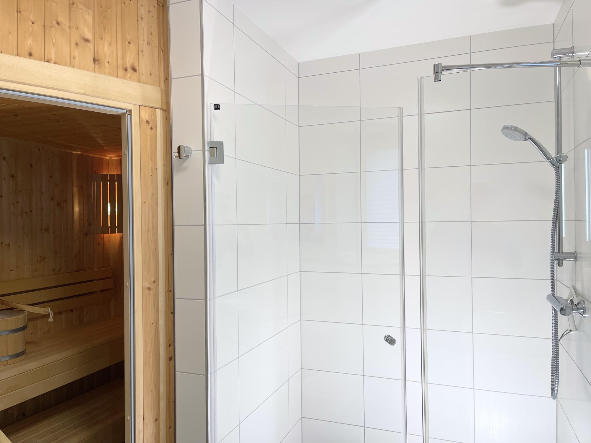 • private Sauna im geräumigen Bad, bodengleiche Dusche & zusätzliches Gäste-WC