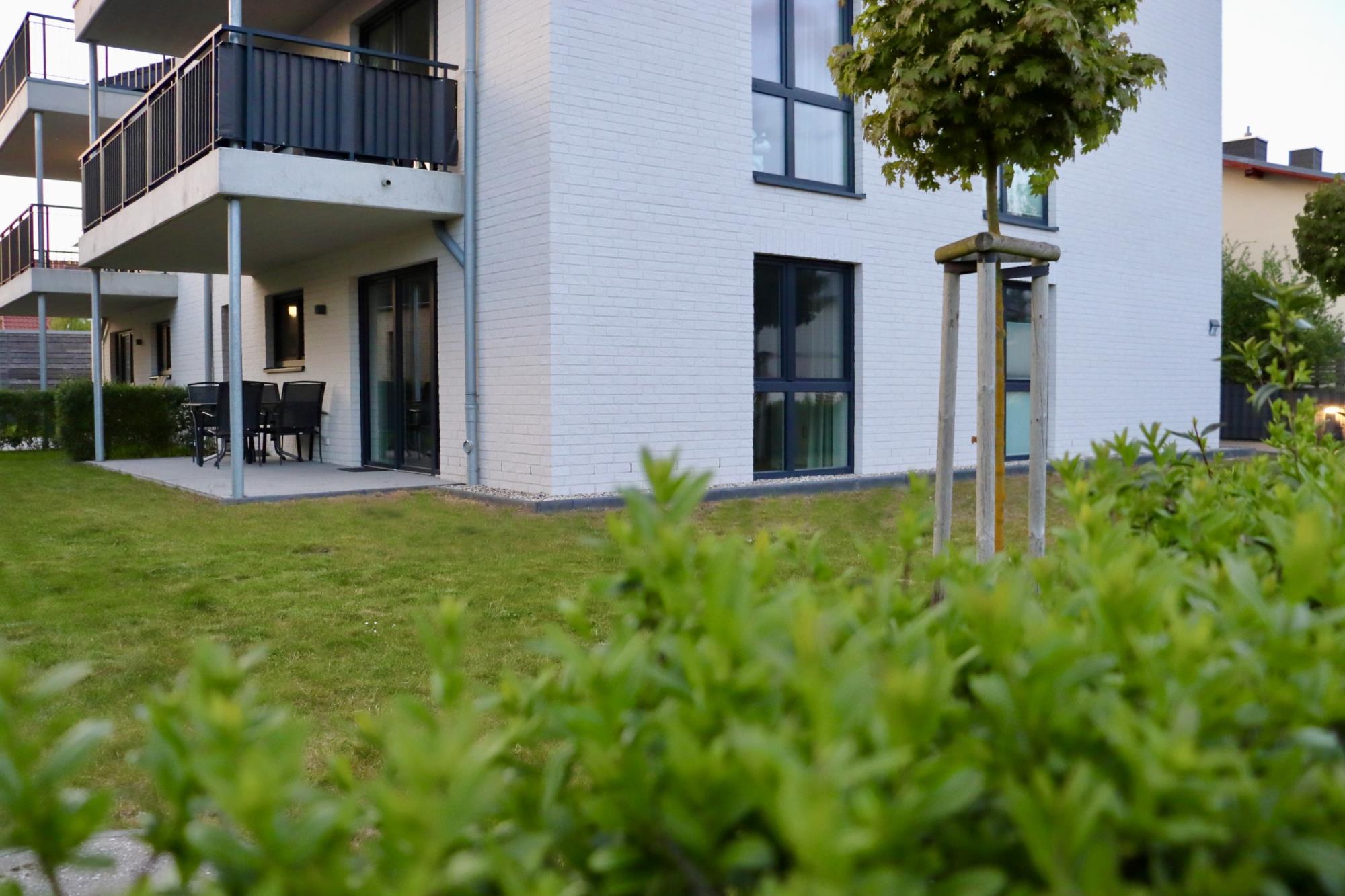 • Terrasse mit eigenem Garten, Sonnenschirm und Gartenmöbeln