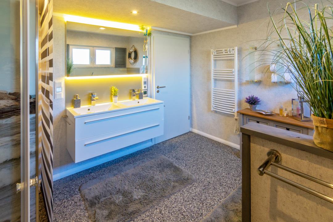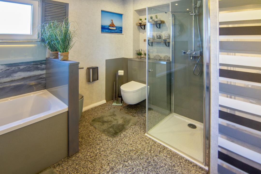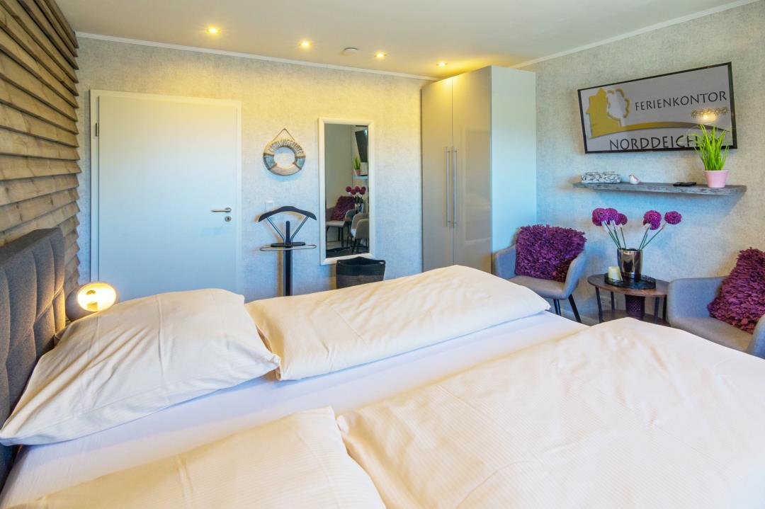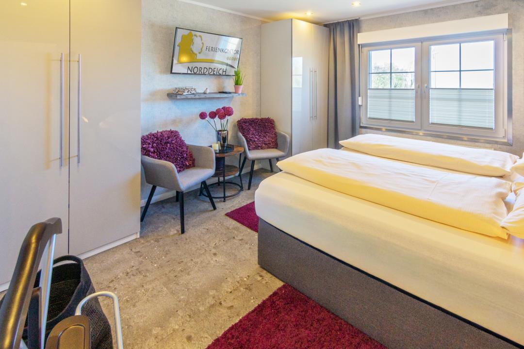 Das separate Schlafzimmer mit komfortablem Doppelbett bietet beste Voraussetzungen für erholsame Nächte. Ein modernes Badezimmer ergänzt den Wohnkomfort harmonisch. Zusätzlich lädt ein Außenbereich mit Terrasse bzw. Sitzmöglichkeit im Garten dazu ein, die frische Nordseeluft zu genießen und den Tag entspannt ausklingen zu lassen.