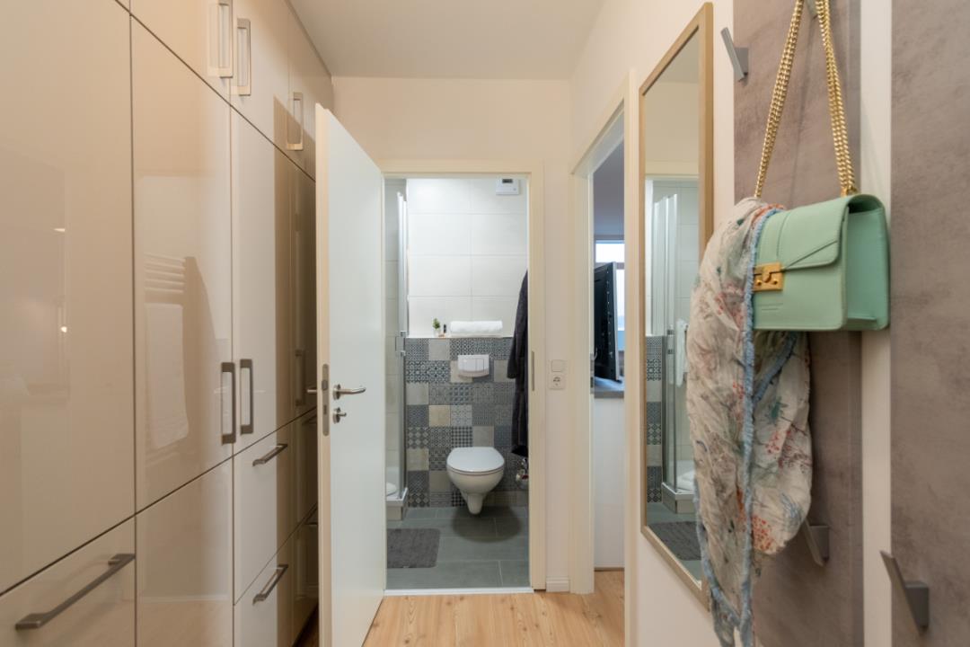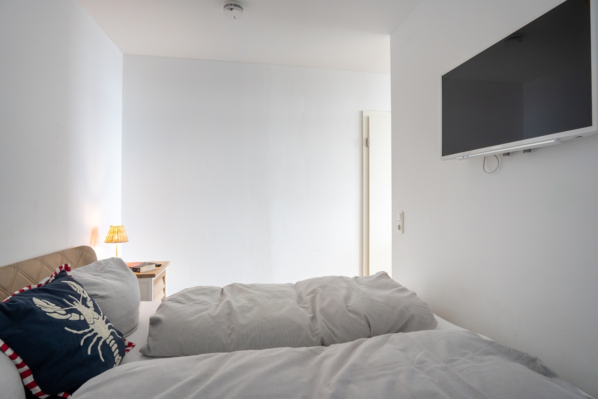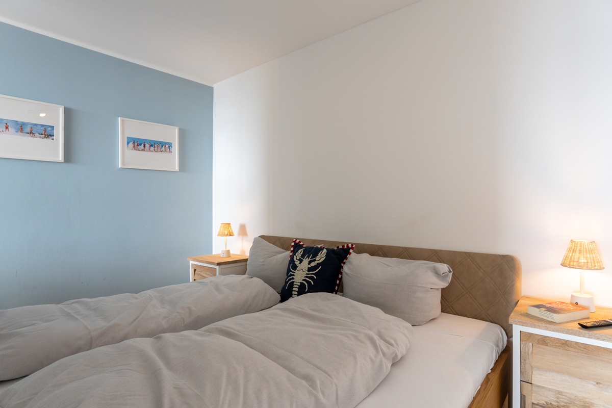Das separate Kinderzimmer ist mit einem Einzelbett ausgestattet, das auch für Erwachsene geeignet ist. Das moderne Bad verfügt über eine Dusche mit Glastrennwand und niedrigem Einstieg.