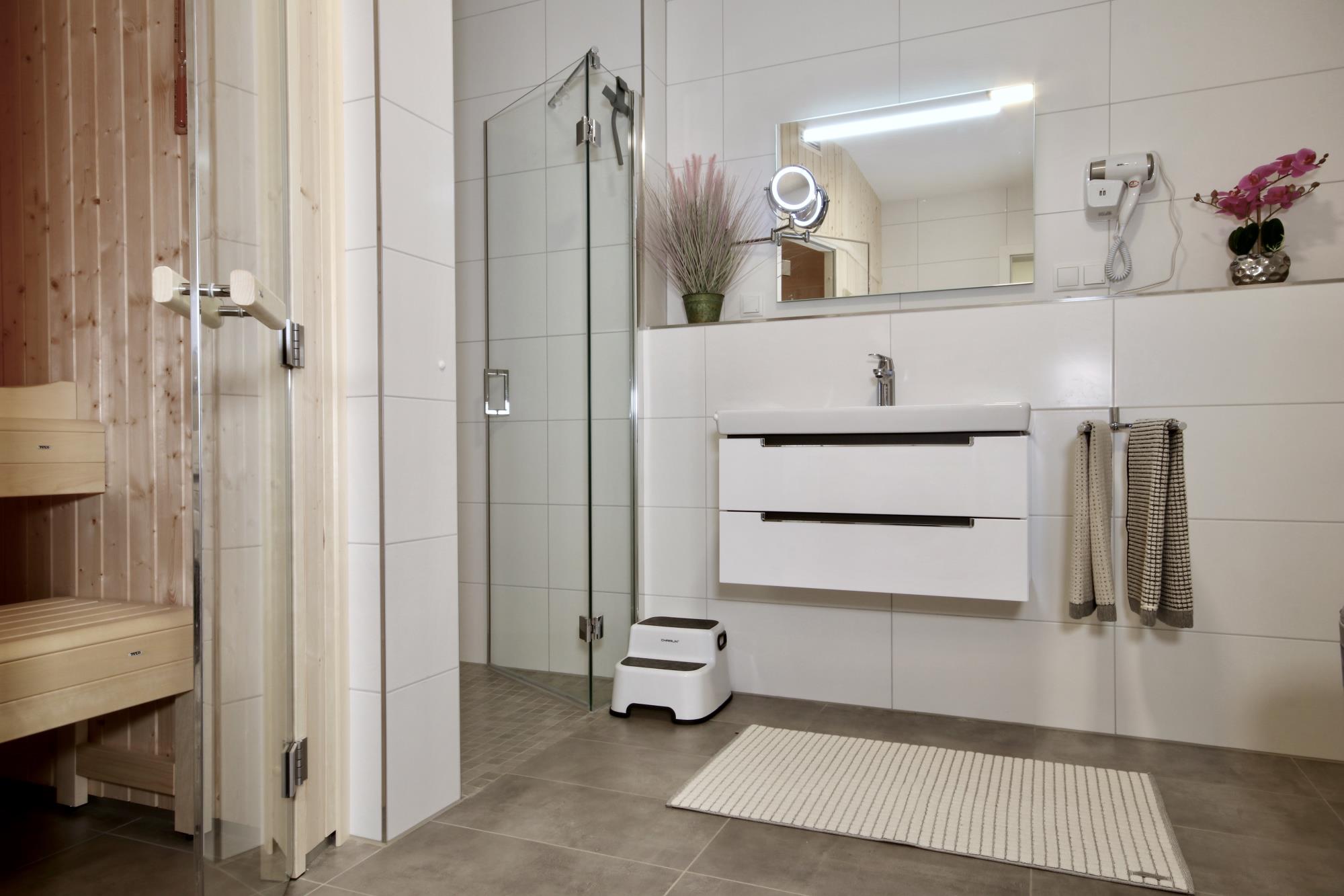 Ein weiteres Highlight der Wohnung ist das Bad, mit privater Sauna, bodengleichem Duschbereich und Handtuchheizung.
