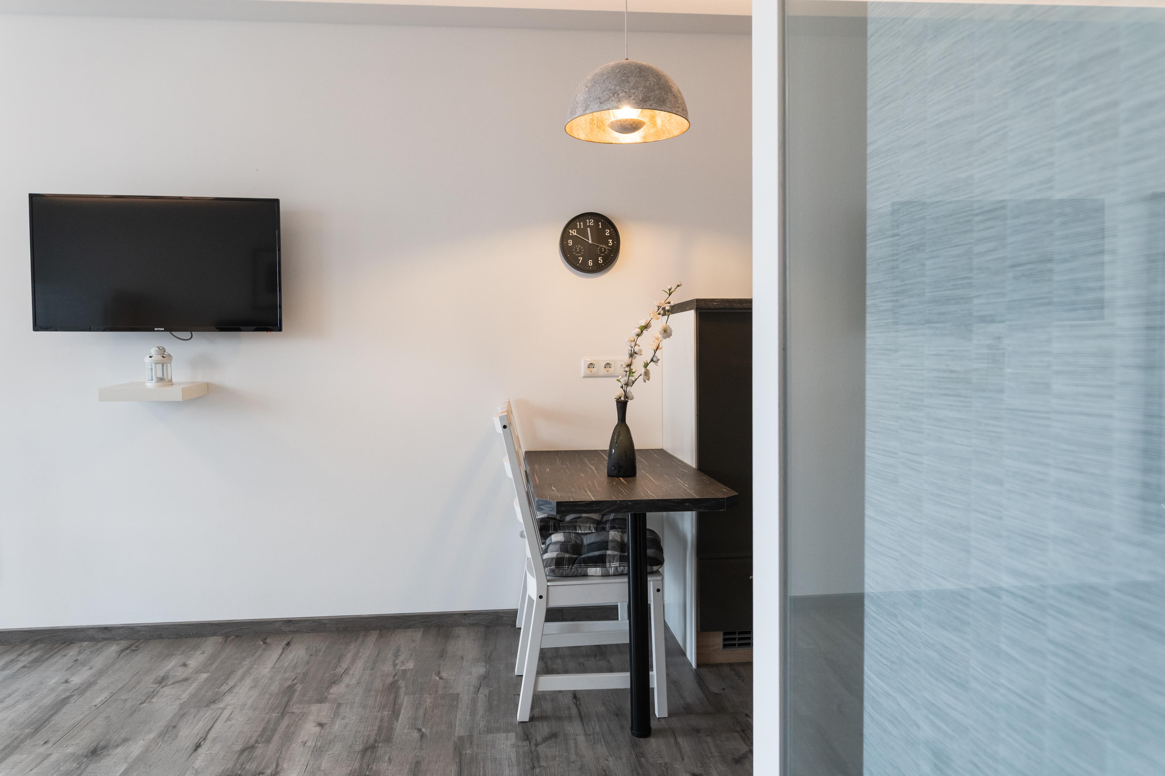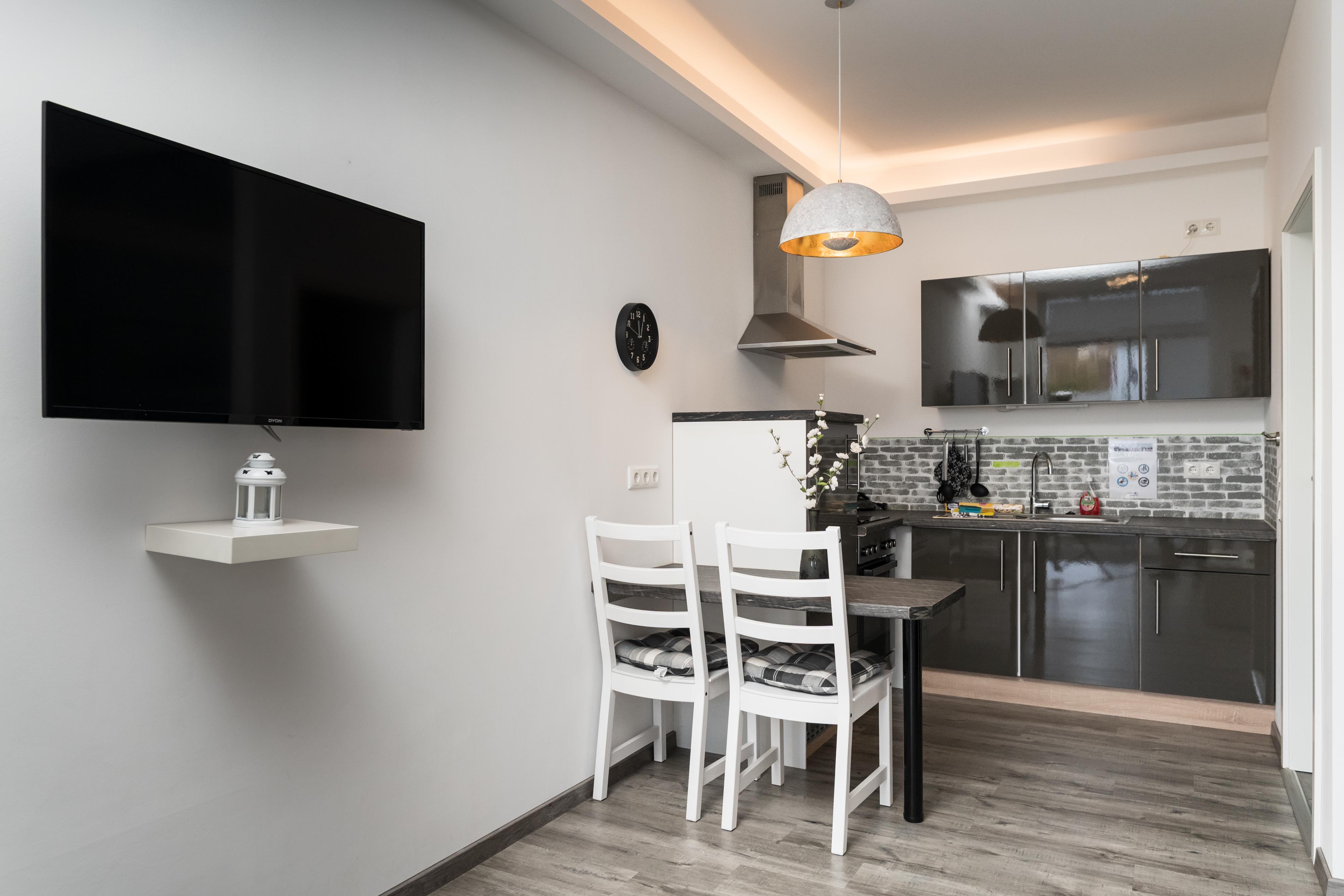 Das Apartment Black&White ist mit einem Doppelbett (180x200) ausgestattet. Die Küche hat einen Herd inklusive Backofen, Dunstabzug, Kaffeemaschine, Kühlschrank mit Gefrierfach, Pfannen, Kochtöpfe und Geschirr.