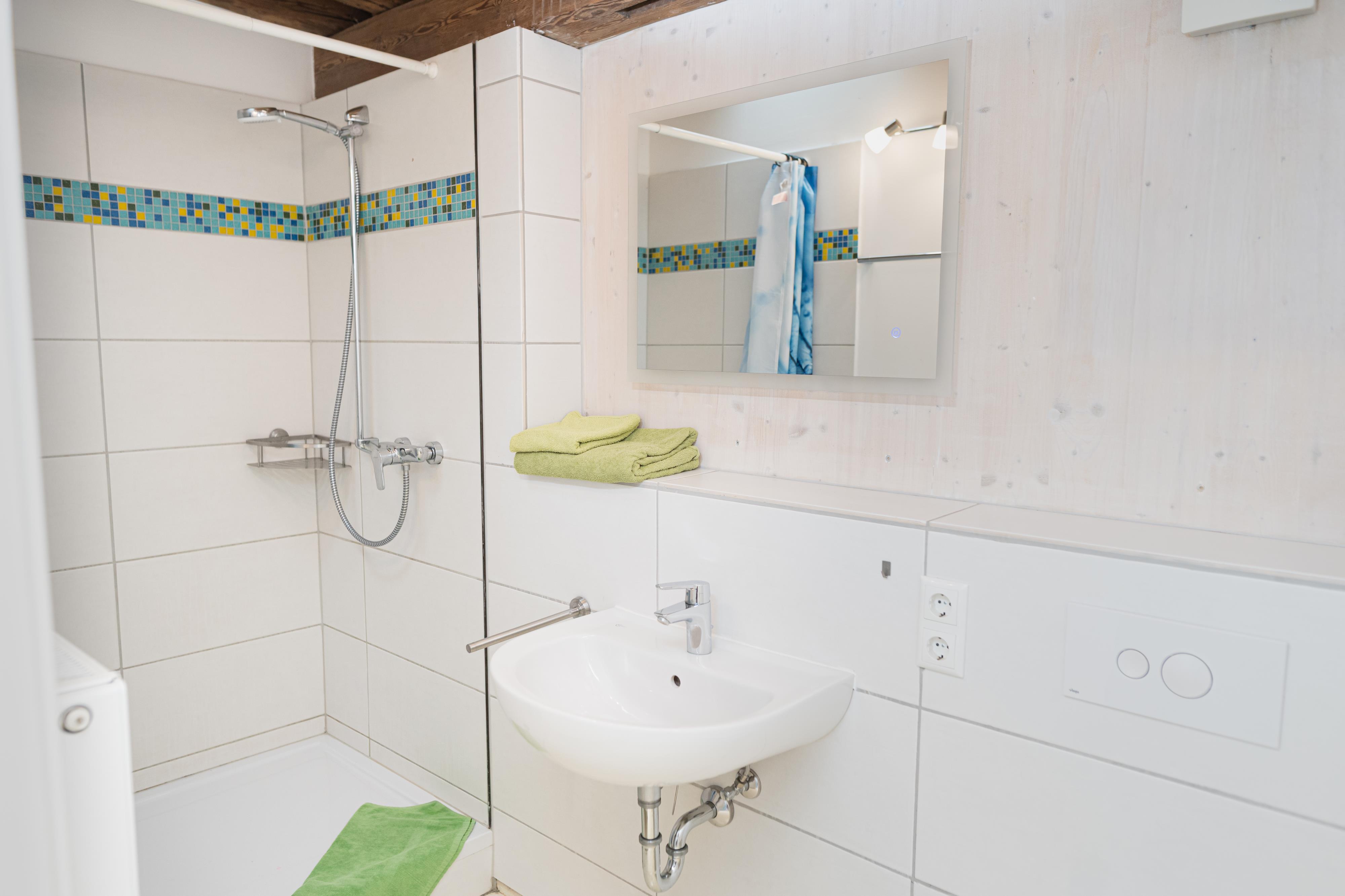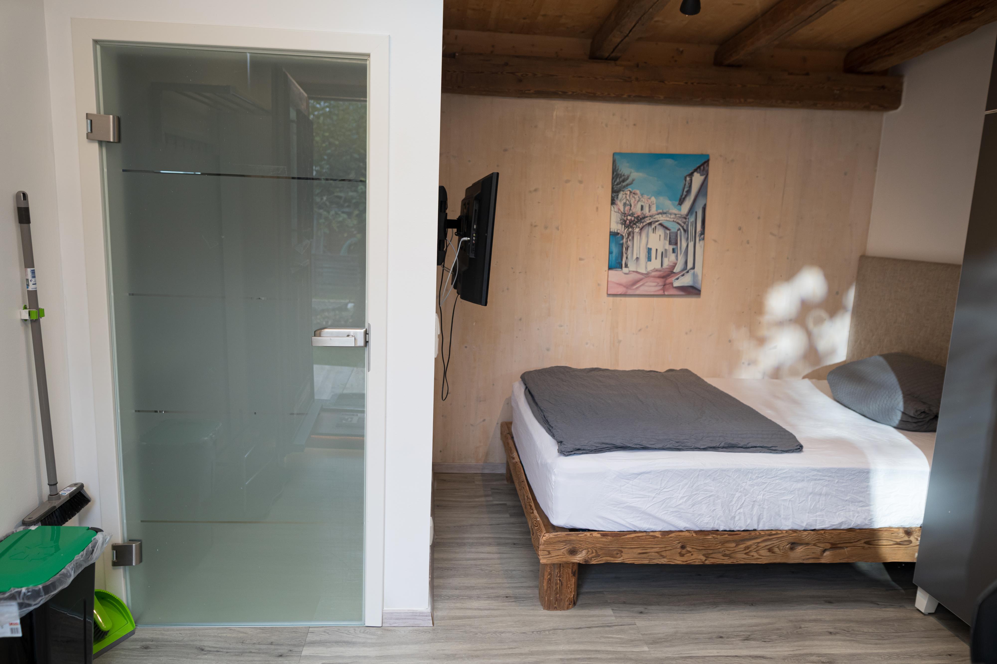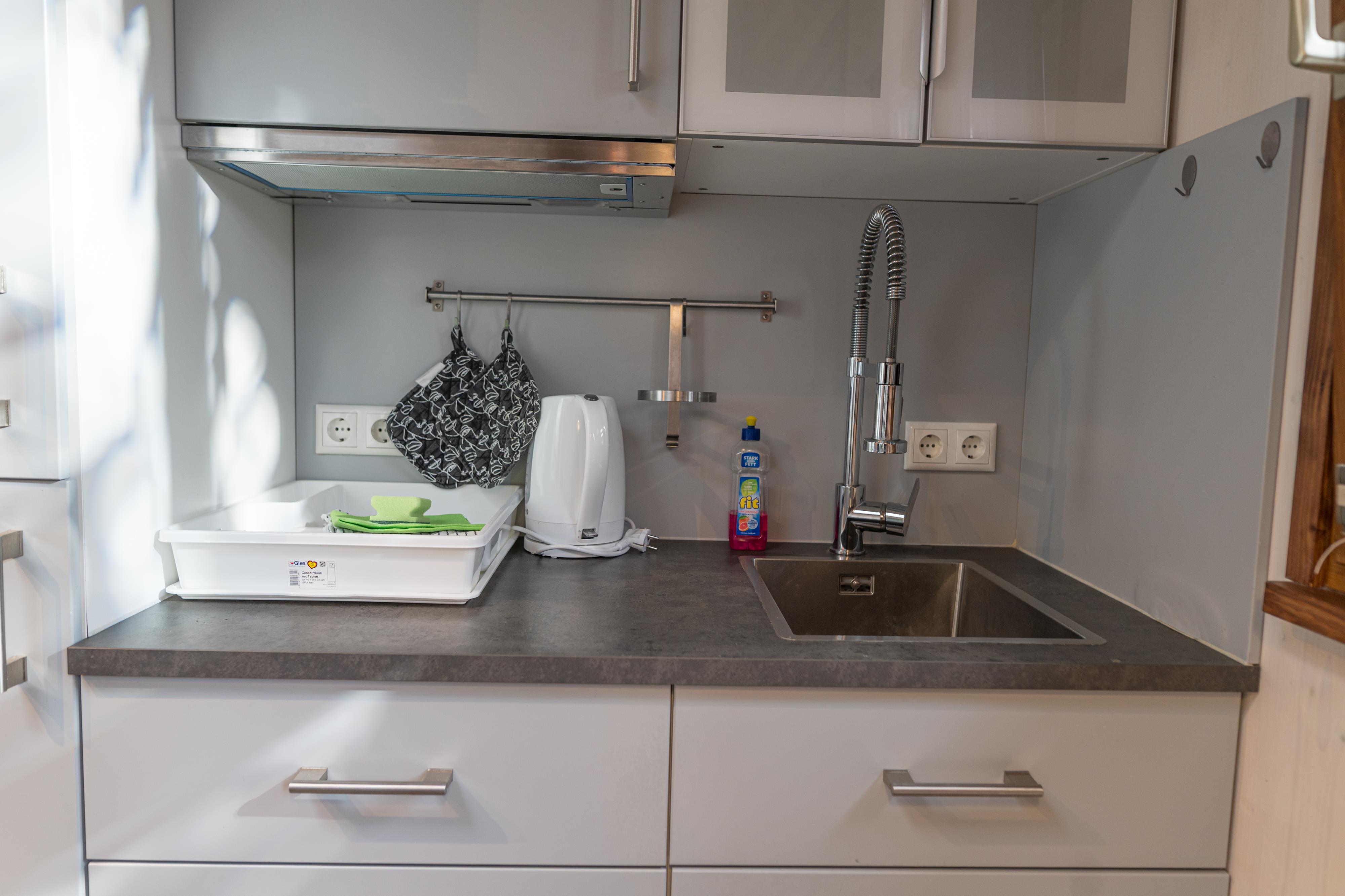Ausstattung: klein Küchenzeile mit transportablen Herdplatten, eine Mikrowelle, Kaffeemaschine, Kühlschrank mit Gefrierfach, Pfannen, Kochtöpfe und Geschirr. Bad mit Dusche, WC, Föhn und Handtuchheizung. Nichtraucherwohnung.