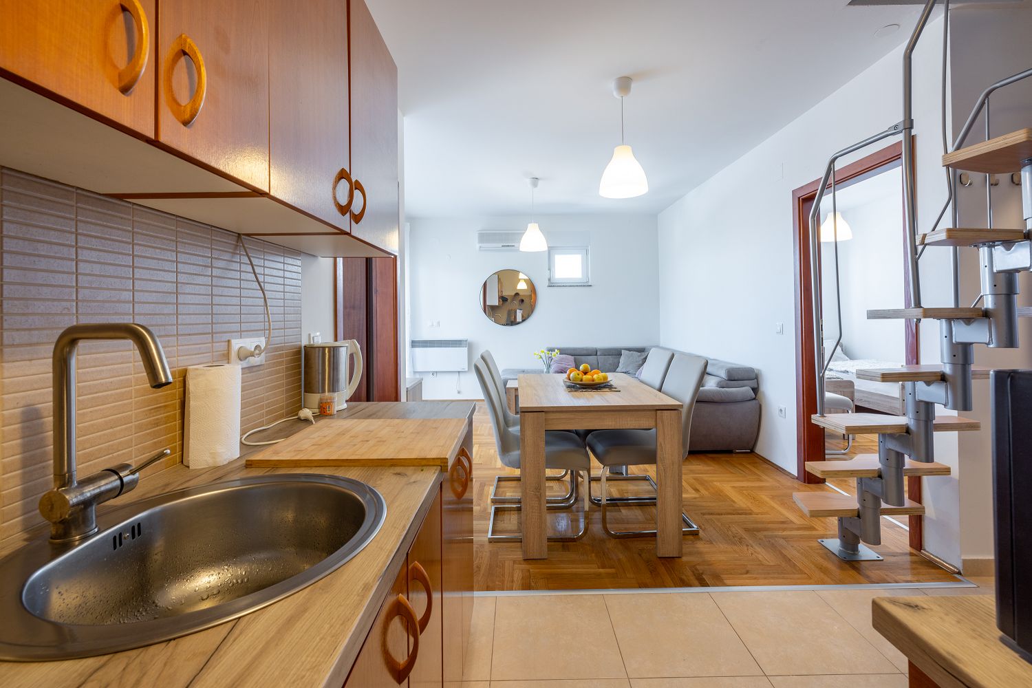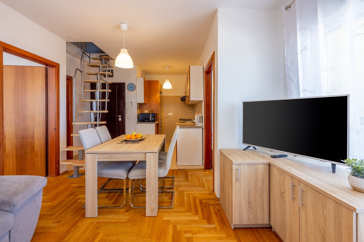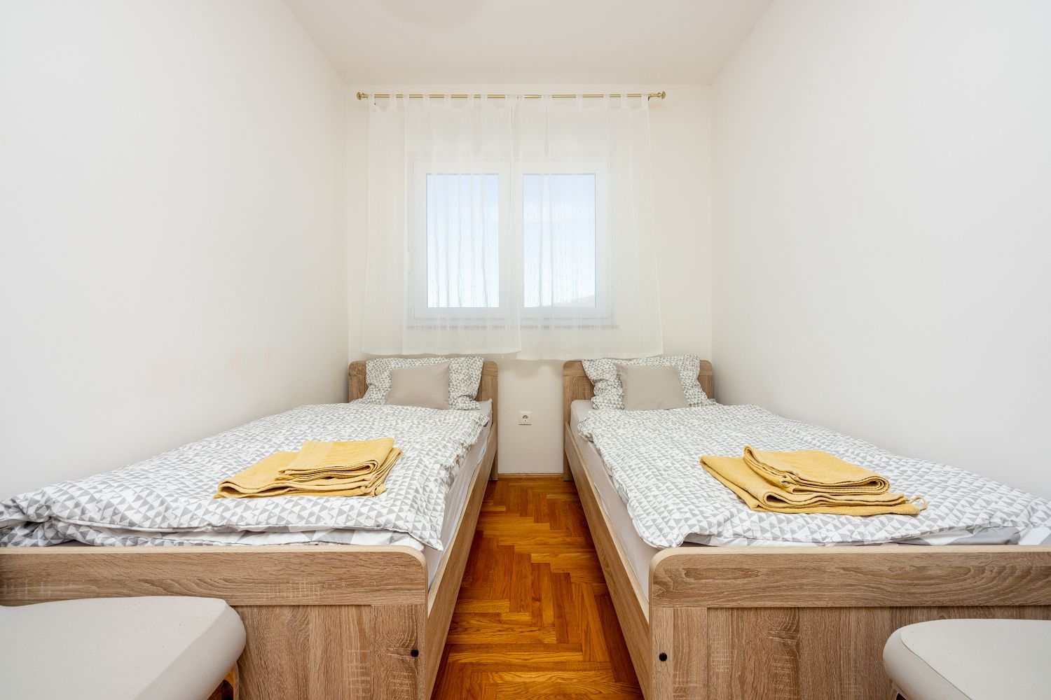 Diese Ferienwohnung liegt in einer ruhigen Wohnsiedlung oberhalb des Zentrums von Jadranovo. Sie besteht aus einer Wohnküche mit Essbereich, zwei Schlafzimmern und einem Badezimmer. Vom Objekt bis zum Strand sind es 720 Meter und die Entfernung zum Zentrum beträgt 300 Meter. Das nächstgelegenste Lebensmittelgeschäft befindet sich 300 Meter von der Ferienimmobilie entfernt. In 300 Metern ist das umliegende Restaurant zu erreichen.