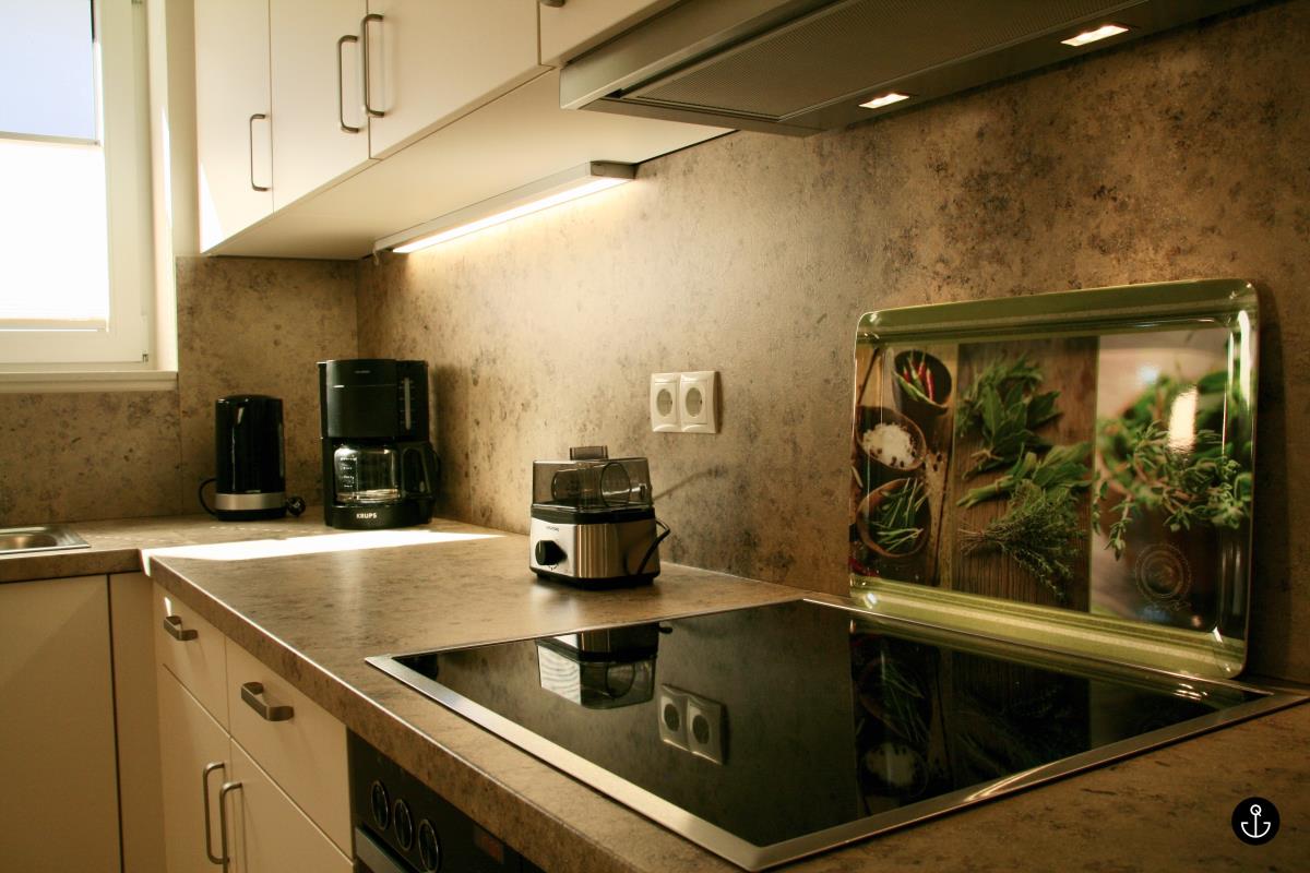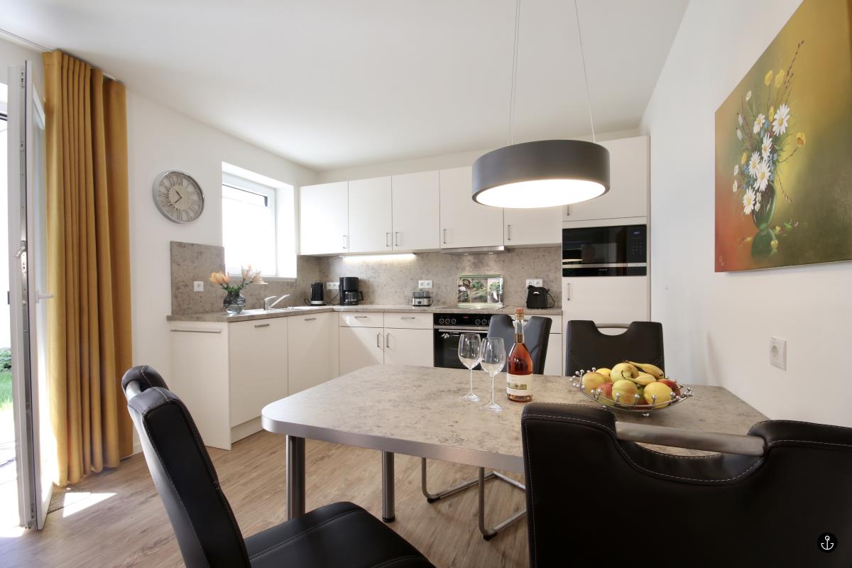 Der Mittelpunkt der Wohnung ist der große Wohn-/Essbereich mit offener Küche. Hier wurde wirklich an alles für einen perfekten Aufenthalt gedacht, vom Nespresso-Kapselautomat inkl. Milchaufschäumer bis hin zur Heißluftfritteuse. Der Wohnbereich lädt über eine Eckcouch mit Relaxsessel wunderbar zum Entspannen ein, wobei als besonderes Highlight ein Gaskamin für eine gemütliche Atmosphäre an kälteren Abenden sorgt. WLAN, Internet-Radio und ein großer Smart-TV sind hier natürlich Standard.