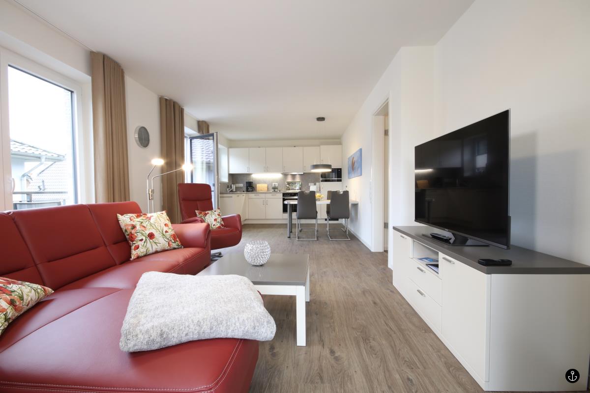 Das behaglich eingerichtete Wohnzimmer verfügt über eine Eckcouch mit Relaxsessel und einem großen internetfähigen Fernseher. Der leicht bedienbare Gaskamin sorgt für eine gemütliche Atmosphäre.