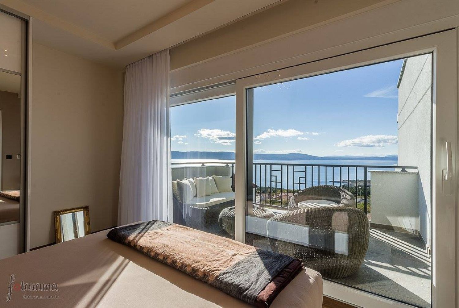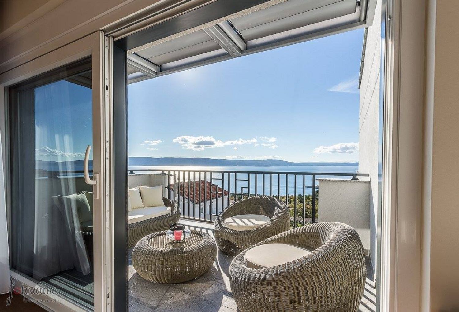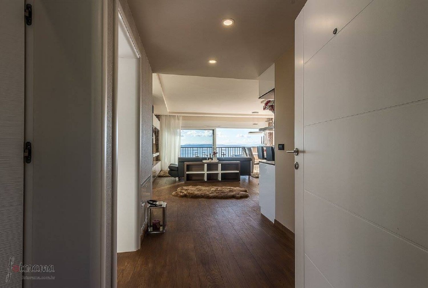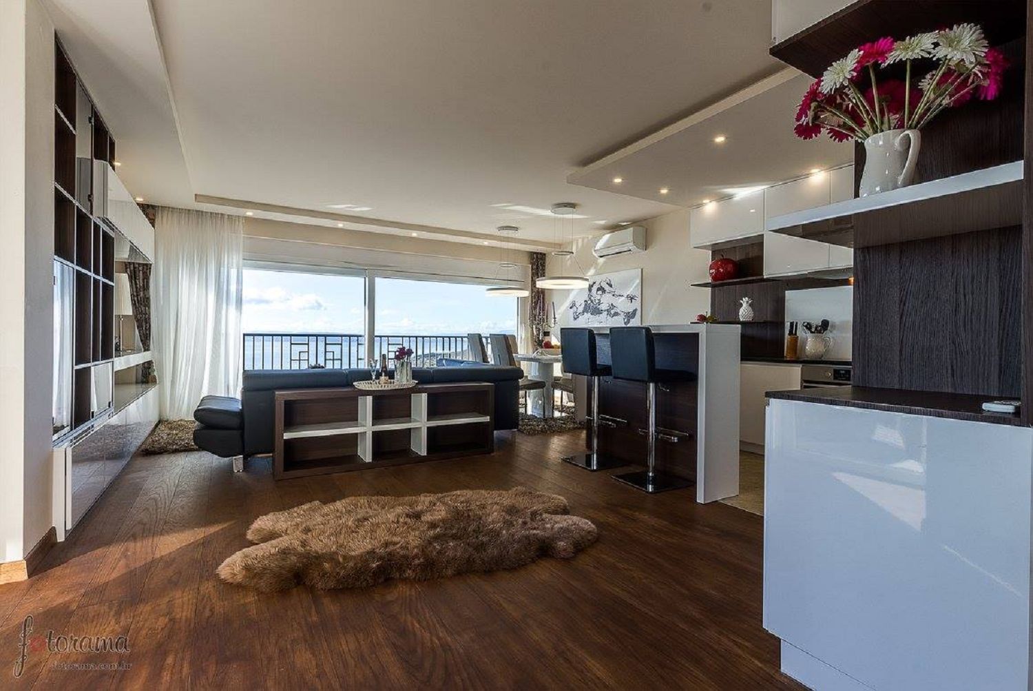 Vom Wohnbereich und einem Schlafzimmer aus hat man Zugang zum möblierten Balkon, der einen traumhaften Meerblick bietet. Im Erdgeschoss können die Gäste den Swimmingpool und die Sonnenliegen frei nutzen. Ein Parkplatz befindet sich in der Garage auf dem Grundstück.