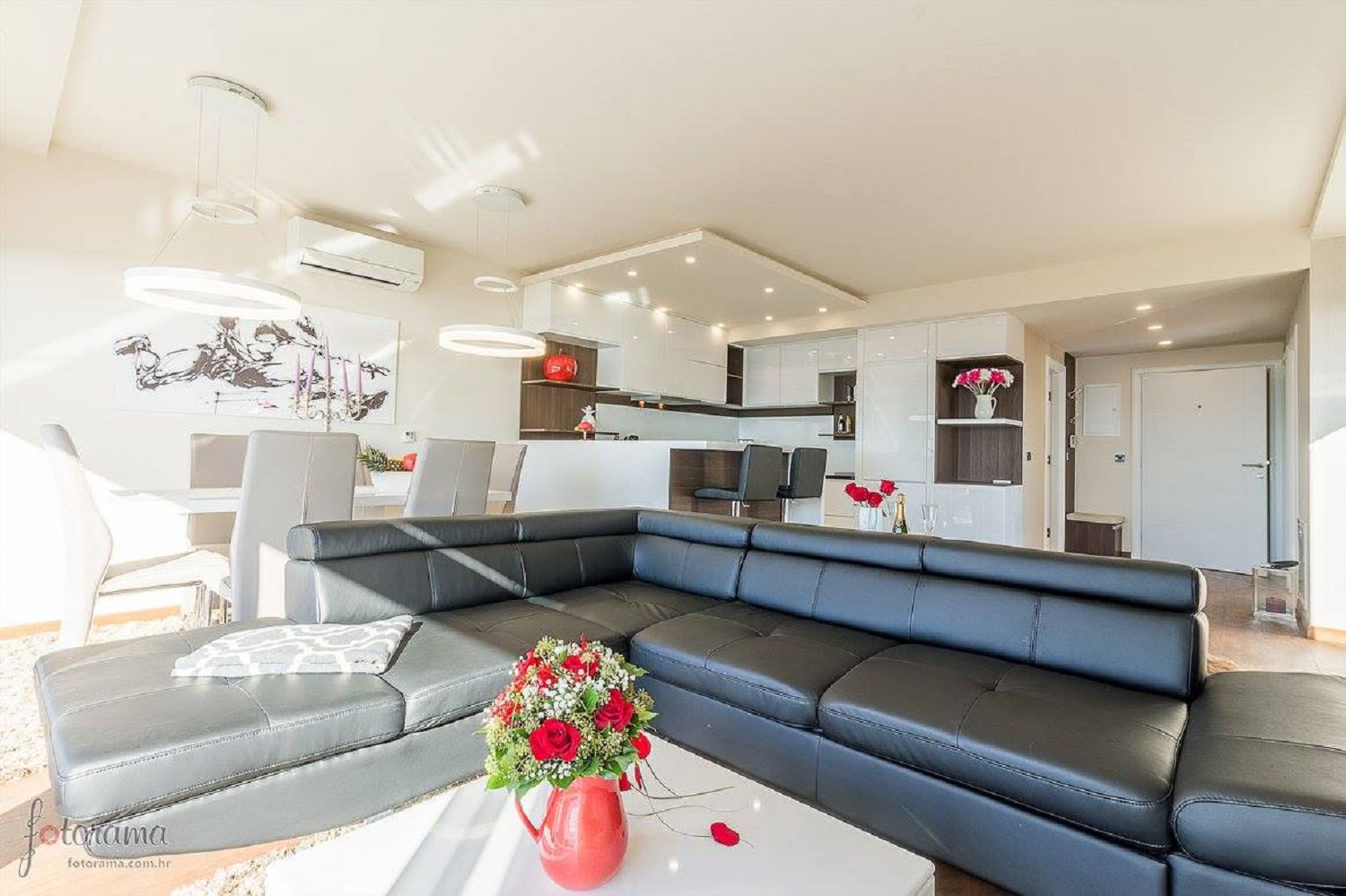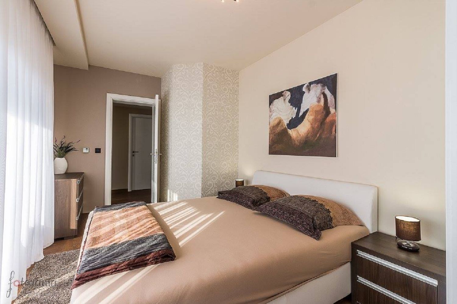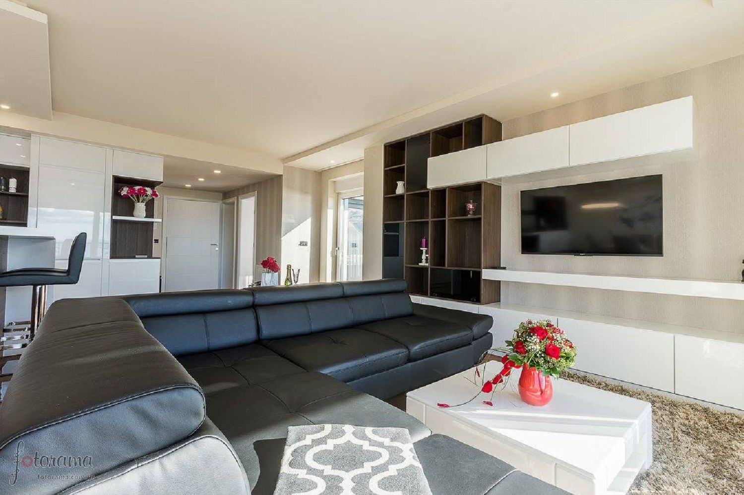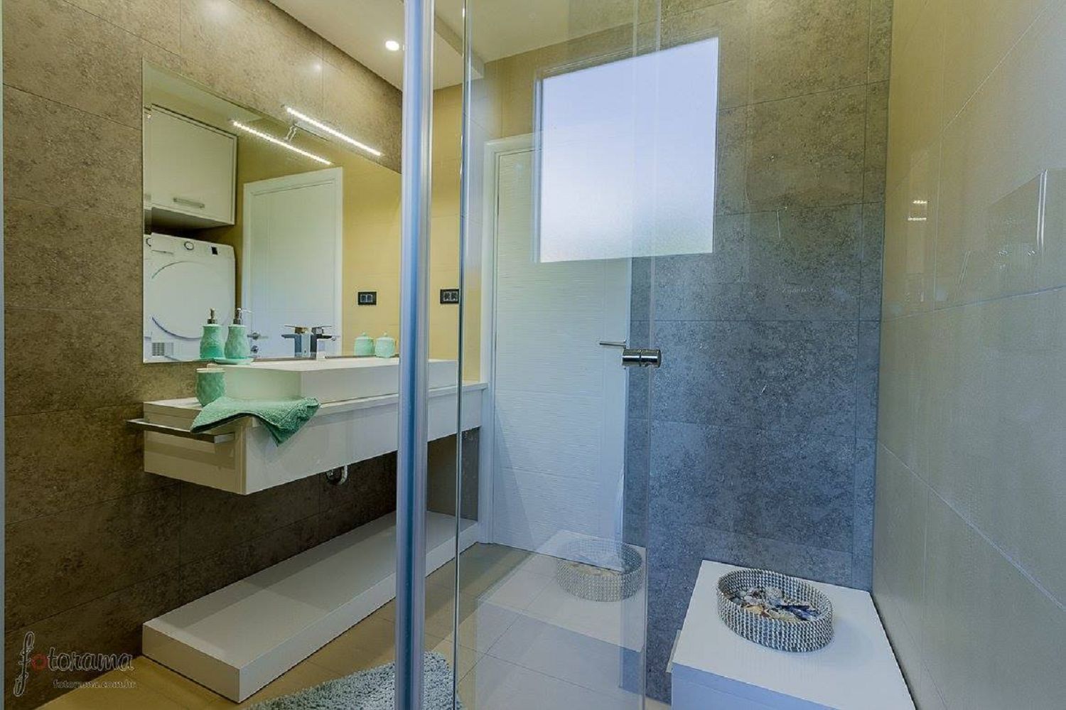 Vom Wohnbereich und einem Schlafzimmer aus hat man Zugang zum möblierten Balkon, der einen traumhaften Meerblick bietet. Im Erdgeschoss können die Gäste den Swimmingpool und die Sonnenliegen frei nutzen. Ein Parkplatz befindet sich in der Garage auf dem Grundstück.