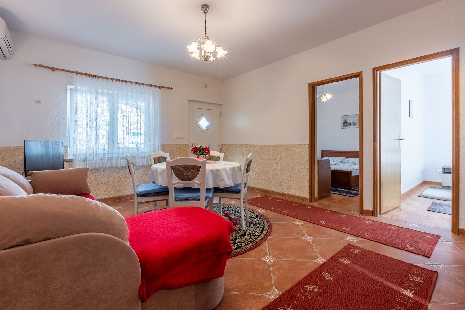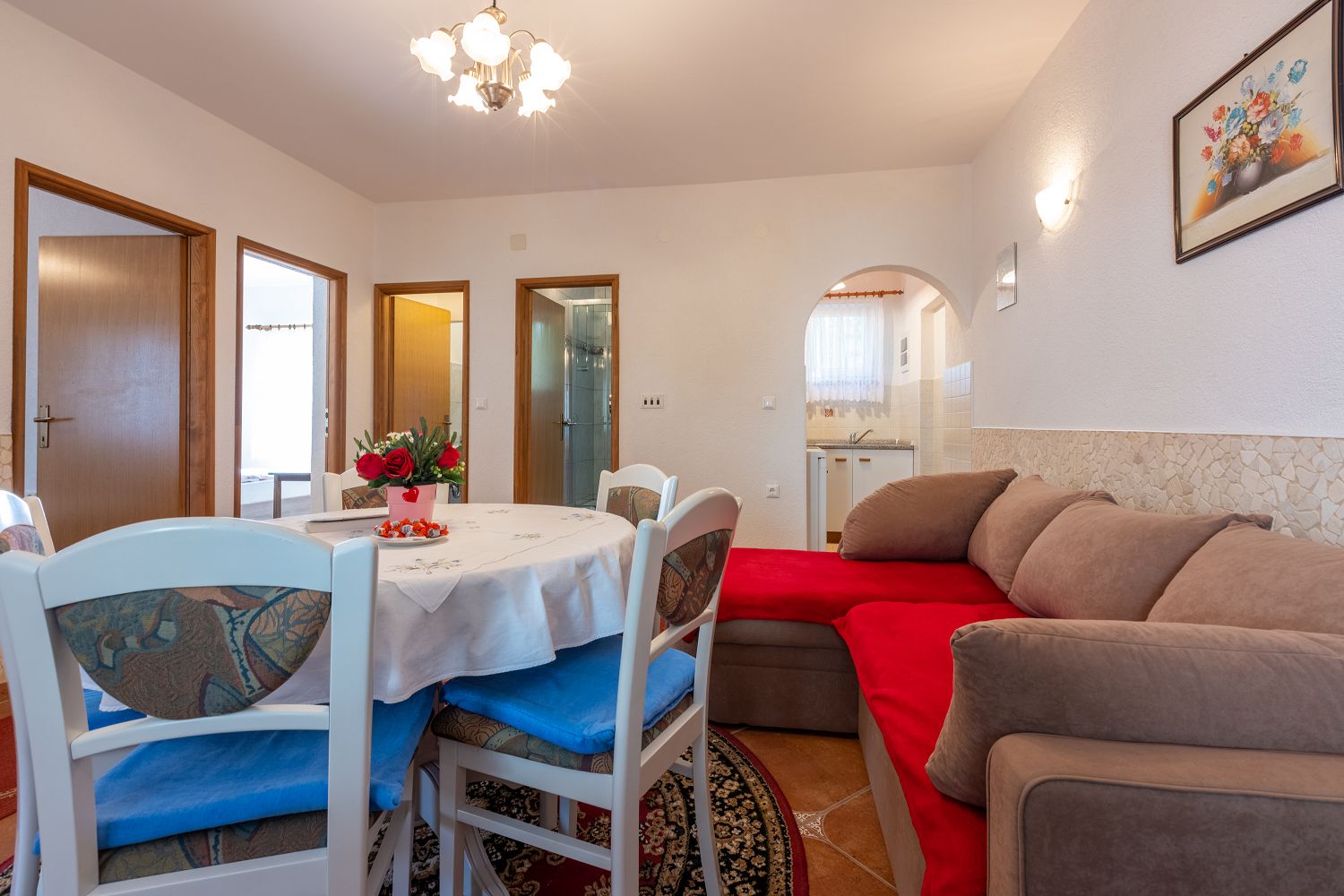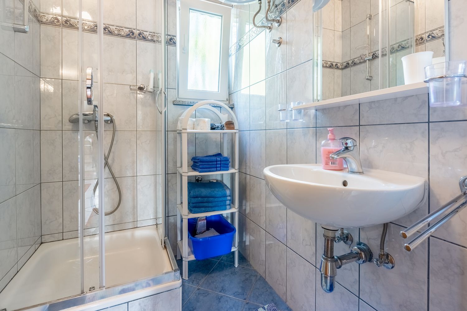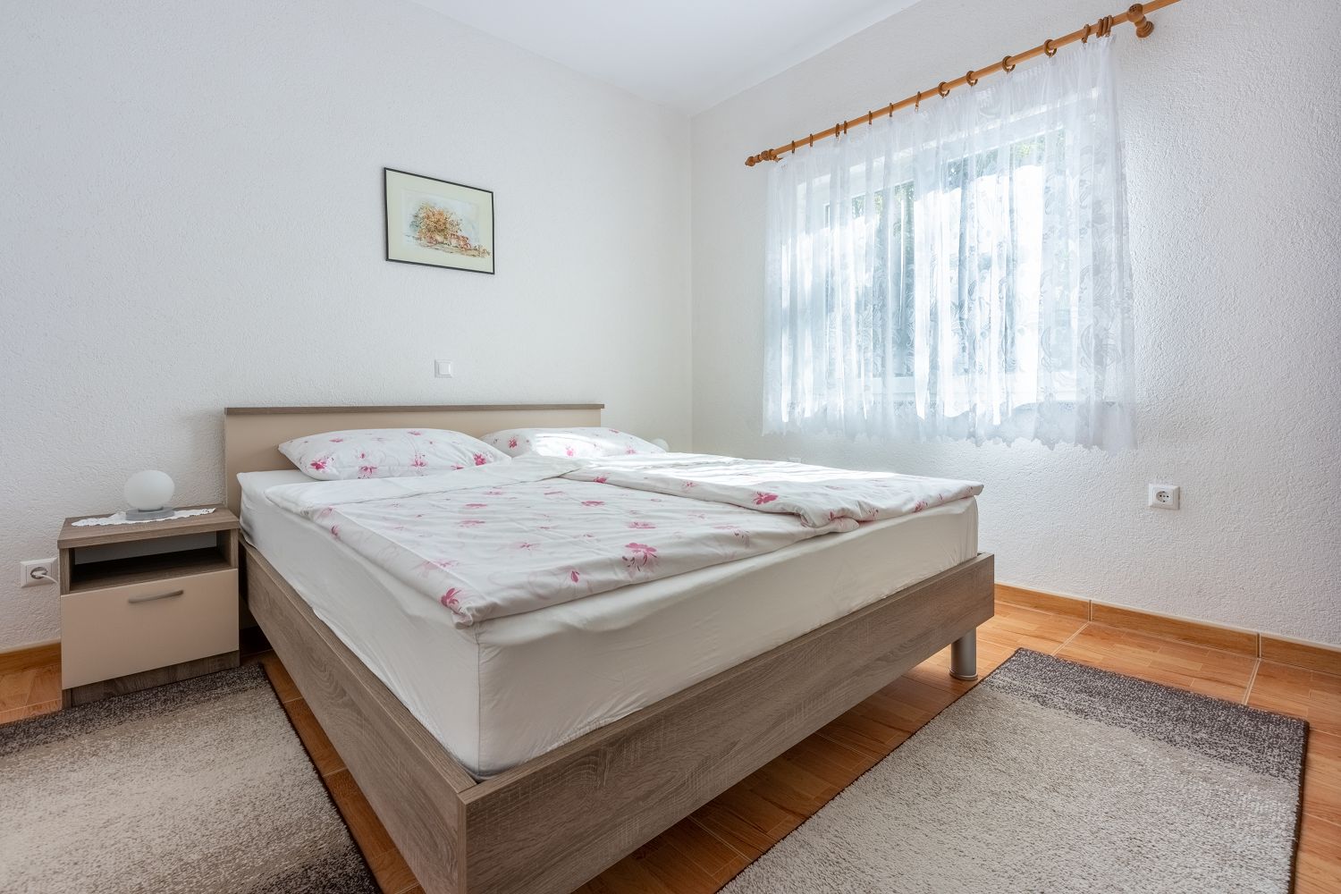 Die 55 m² große Ferienwohnung befindet sich im Erdgeschoss. Sie ist aufgeteilt in ein Wohn- und Esszimmer mit Kochnische, zwei Schlafzimmer mit jeweils einem Doppelbett, ein Badezimmer mit Dusche und eine separate Toilette. Vom Wohnbereich aus gelangt man auf die überdachte, schattige Terrasse.