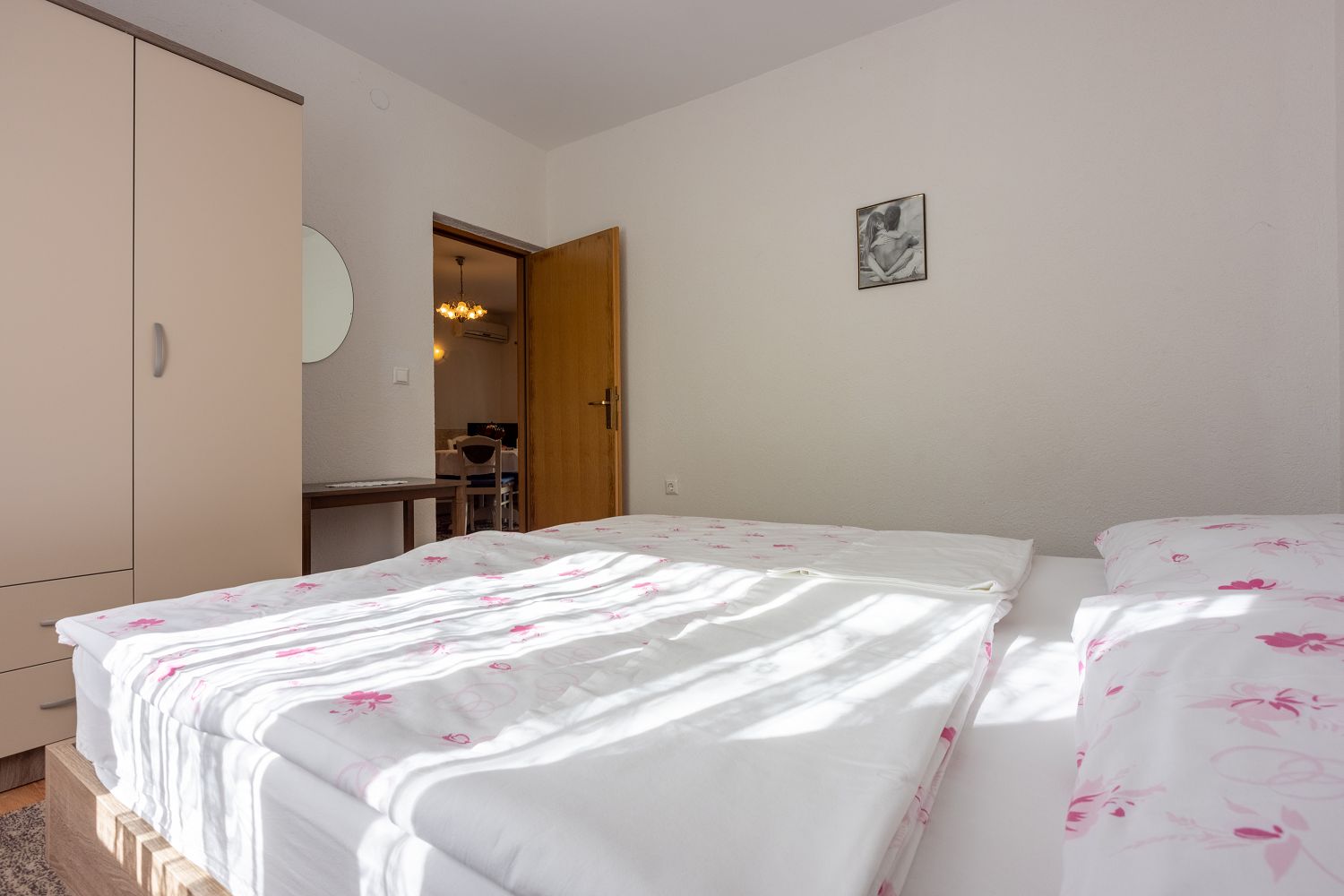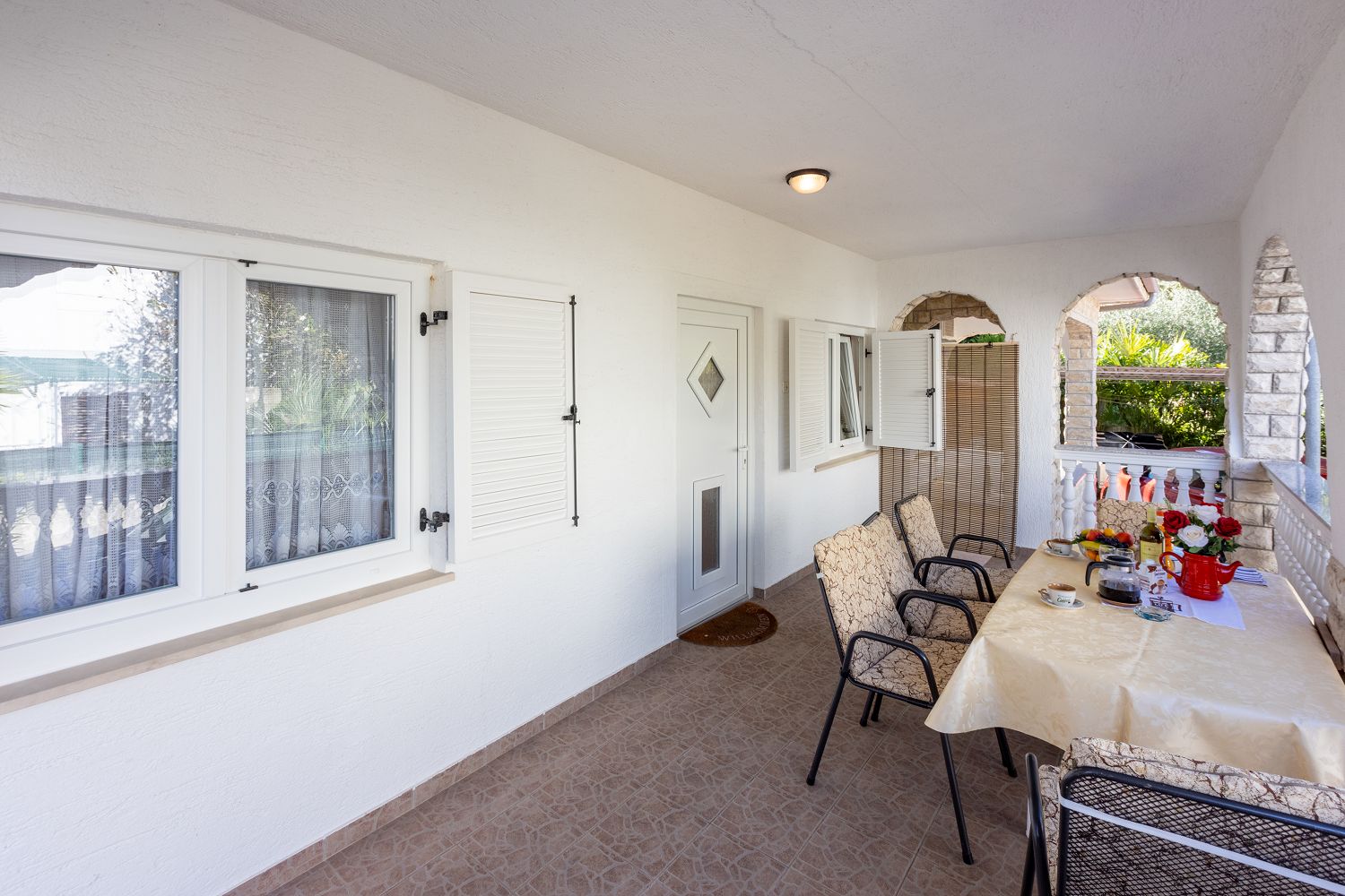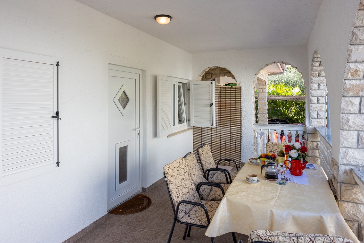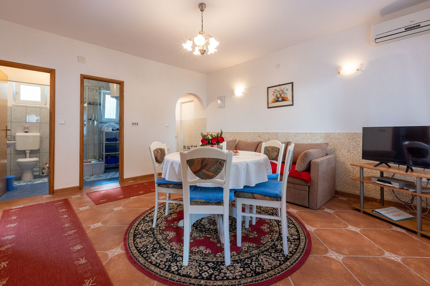 Die 55 m² große Ferienwohnung befindet sich im Erdgeschoss. Sie ist aufgeteilt in ein Wohn- und Esszimmer mit Kochnische, zwei Schlafzimmer mit jeweils einem Doppelbett, ein Badezimmer mit Dusche und eine separate Toilette. Vom Wohnbereich aus gelangt man auf die überdachte, schattige Terrasse.