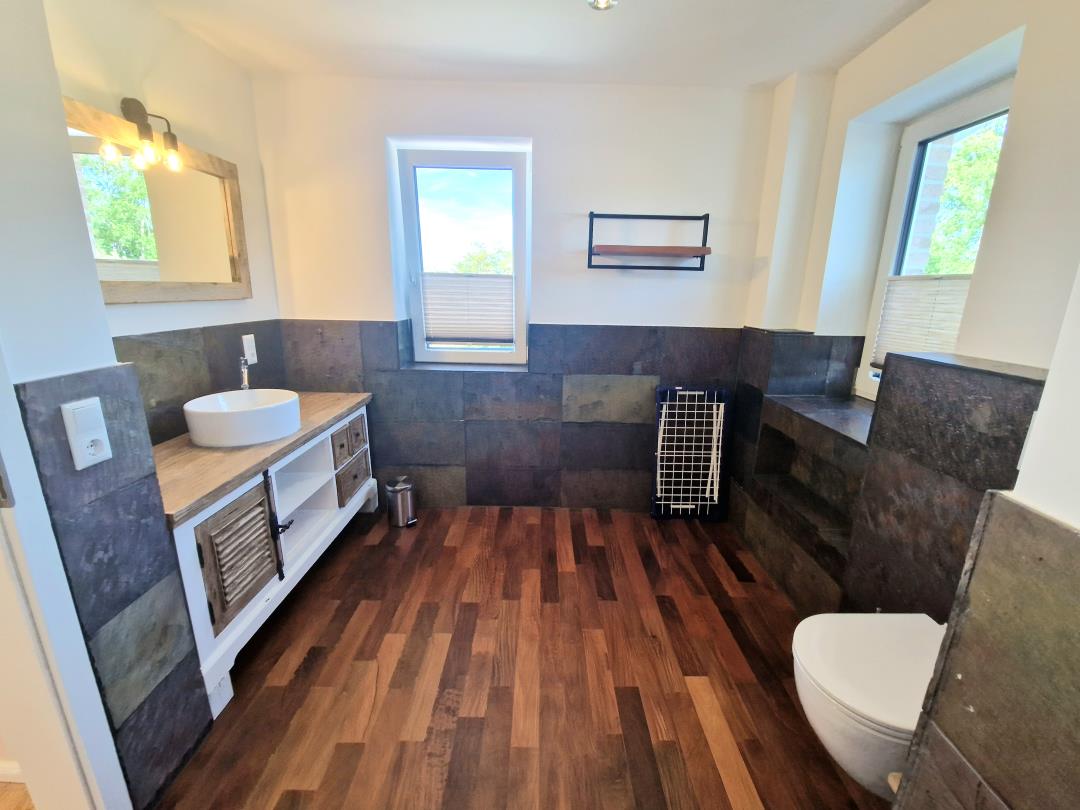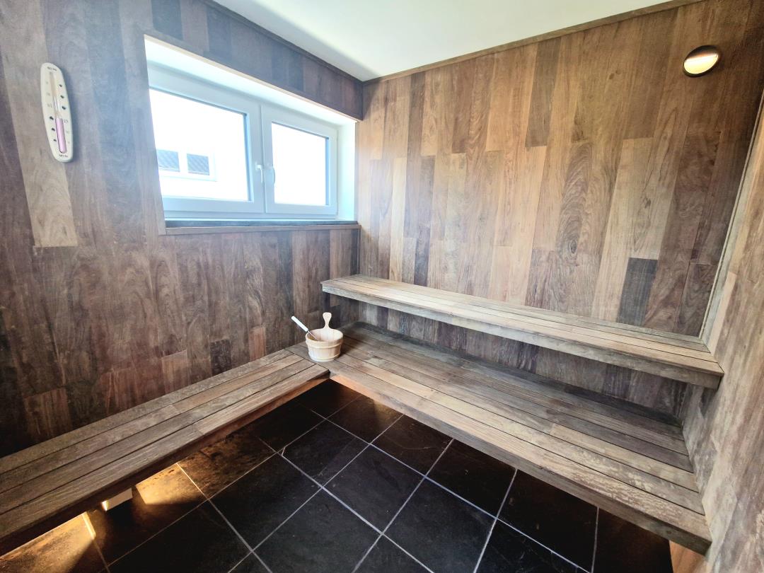 Ein besonderes Highlight der Wohnung ist die Sauna, in der Sie sich nach einem ereignisreichen Tag wunderbar entspannen können. Der Kaminofen im Wohnbereich schafft eine behagliche Atmosphäre und lädt zu gemütlichen Abenden ein. Der Wohnbereich selbst ist offen gestaltet und bietet ausreichend Platz zum Entspannen und Verweilen.