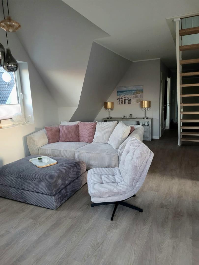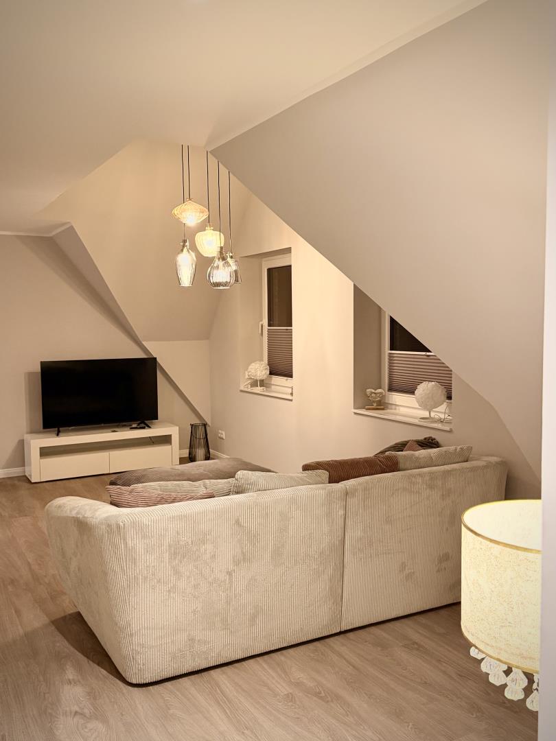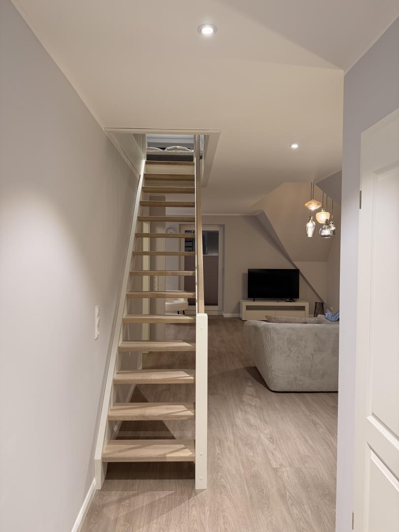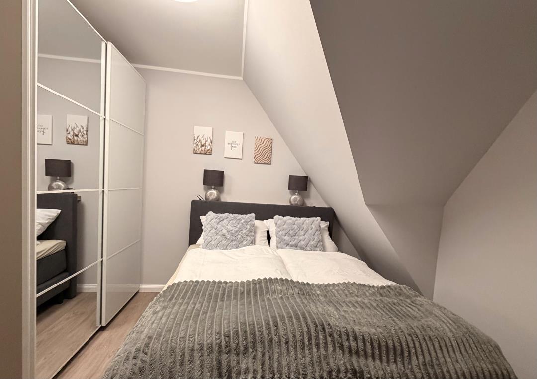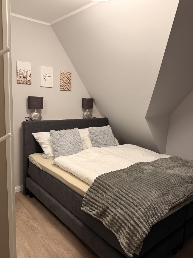 Die Ferienwohnung verfügt über zwei Schlafzimmer mit Boxspringbetten, eines davon im gemütlichen Spitzboden. Beide Zimmer sind mit modernen Smart-TVs ausgestattet, sodass Sie auch an verregneten Tagen für Unterhaltung bestens gerüstet sind. Das Badezimmer ist mit einer großzügigen, ebenerdigen Dusche ausgestattet und sorgt für ein angenehmes Duscherlebnis.