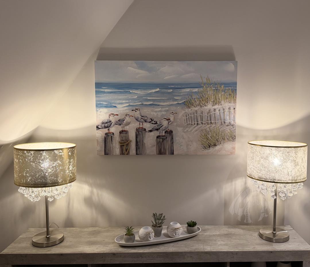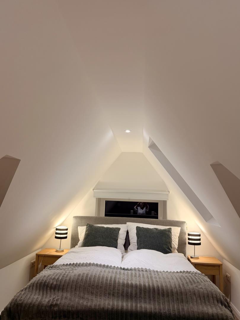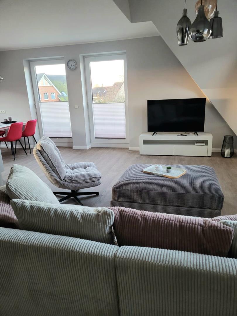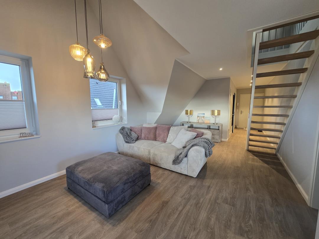 Die Ferienwohnung verfügt über zwei Schlafzimmer mit Boxspringbetten, eines davon im gemütlichen Spitzboden. Beide Zimmer sind mit modernen Smart-TVs ausgestattet, sodass Sie auch an verregneten Tagen für Unterhaltung bestens gerüstet sind. Das Badezimmer ist mit einer großzügigen, ebenerdigen Dusche ausgestattet und sorgt für ein angenehmes Duscherlebnis.
