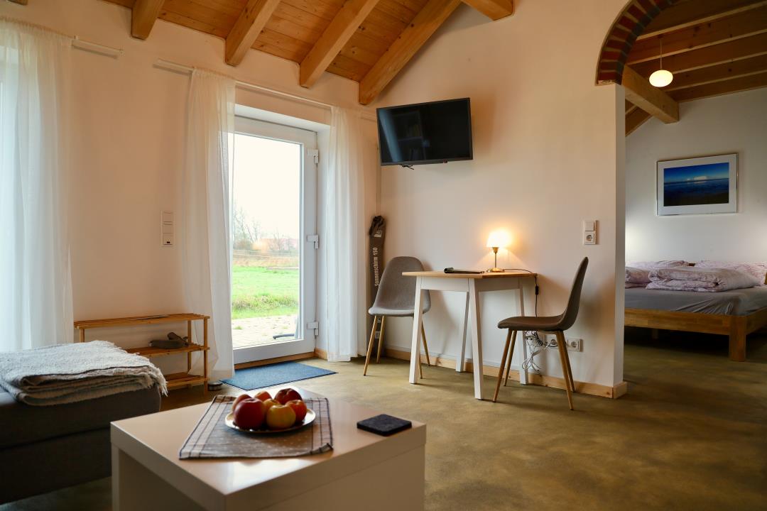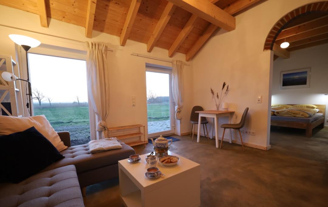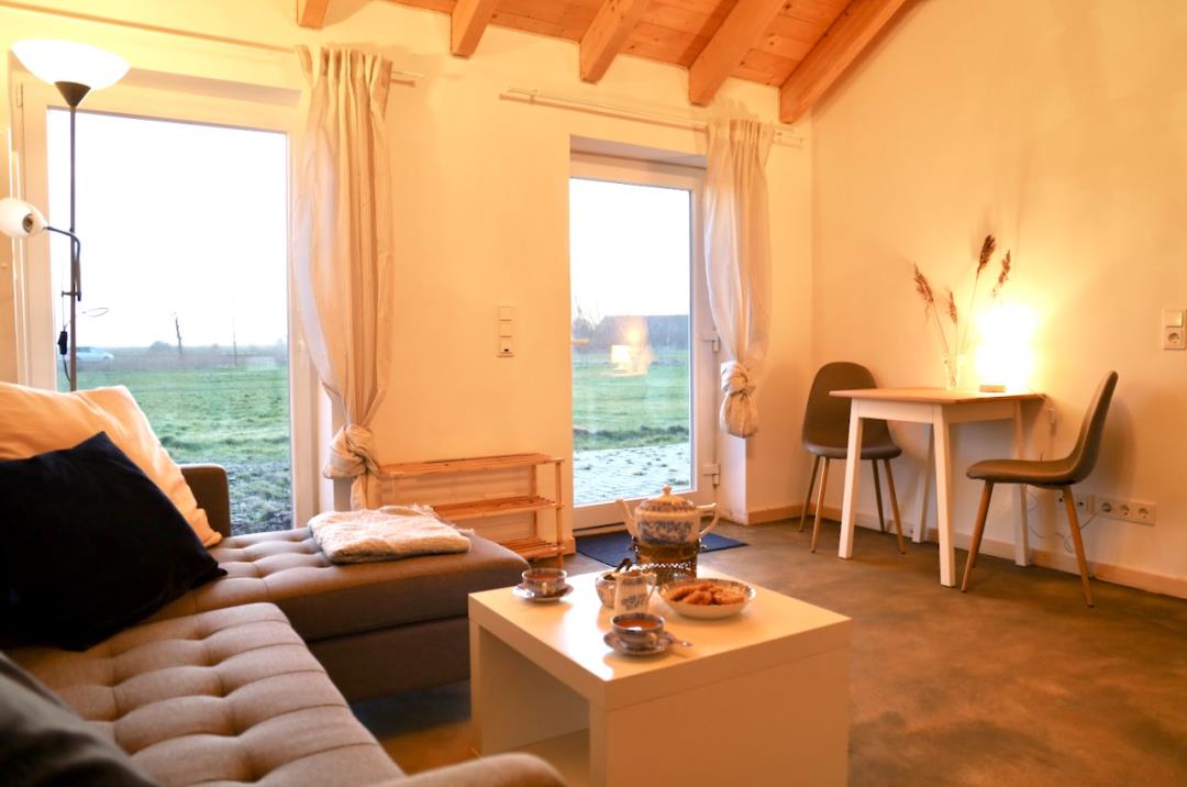 Wir haben mit Sömmertied mit Beginn des Jahres 2024 eine von zwei wunderschönen, Ferienwohnungen für Sie fertiggestellt. Sie ist offen gestaltet, mit großen, bodentiefen Fenstern nach Süden, hat ca 55 qm, bietet viel Bewegungsfreiheit für 1 - 2 Personen. Sie ist hell und lichtdurchflutet und hat eine eigene Sonnenterrasse nach Süden mit eigenen Garten- und Liegestühlen. Wir haben Wert gelegt auf gute, natürliche Materialien, wie unbehandeltes Holz, biologisch gefärbten Sichtestrich, der mit reinem Bienenwachs behandelt wurde, Infrarot-Fußbodenheizung, die sonnenähnliche Strahlungswärme abgibt, keine Staubverwirbelungen erzeugt und so ein wunderbares Raumklima erzeugt, das gut ist für die Atemwege, sowie Kalkputz und Kalkfarben. Und wir verwenden ausschließlich reine Baumwoll-Bettwäsche. Wir haben unsere Lampen mit Halogenbirnen statt LED ausgestattet, weil das unsichtbar flackernde Licht der LED-Beleuchtung nachgewiesenermaßen hohe Gesundheitsrisiken birgt, wie Netzhautablösungen, Migräne, Gehirntumore, Epileptische Anfälle, Herzprobleme u.a., denn das menschliche Auge und das menschliche Gehirn können ein ständiges rasant schnelles Flackern aus hell-dunkel dauerhaft nicht ausgleichen. Das tun wir zusätzlich für Ihre Gesundheit: Hochwertige Wasserfilteranlage in Küche und Bad Hochwertige Wasser-Energetisierung in Küche und Bad Elektrosmog-Entstörung durch eingebaute Kupfergewebe unbehandelte Nadelholzdecken, die die Atemluft verbessern Ausstattung der Wohnung „Sömmertied“: Großer, offen gestalteter Wohnraum, Eßbereich, Schlafraum, großes Bad, TV, WLAN Küche: Halogenlicht In allen Räumen Infrarot-Fußbodenheizung unter dem natürlich behandelten gefärbten Estrich mit eigener Wärmesteuerung pro Raum. Küche: Voll ausgestattete Küche, Ceranfeld mit 4 Kochstellen, vollwertiger Bachofen mit Umluft etc, Vollwertige Spülmaschine, Kühl-Gefrierkombination, Toaster, Senseo-Pad-Kaffemaschine, Wasserkocher, Eierkocher, … Wohnteil: Gemütliches Ecksofa mit Chaiselonge, Kissen, Decken, Sat-TV, Lese-Stehlampe mit Deckenfluter, Vorhänge vor den bodentiefen Fenstern nach Süden, hochwertige Musikanlage Schlafraum: Bequemes, breites Bett mit natürlicher atmungsaktiver Baumwollbettwäsche, Kleiderschrank, bodentiefe Fenster nach Süden mit Plissee und Vorhängen Bad: Bodentiefe, seniorengerechte geräumige Dusche, Auftischwaschbecken, Durchlauferhitzer - Sie können die Wassertemperatur selbst regulieren. Parkplätze auf dem Hof. Nichtraucherwohnung: Im Haus und in der Wohnung gilt absolutes Rauchverbot. Da die Wohnung allergikerfreundlich ist, akzeptieren wir keine Haustiere. Es ist eine seniorengeeignete 2-Personen-Wohnung.