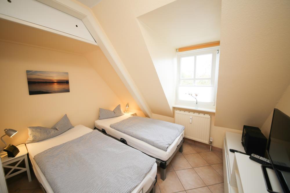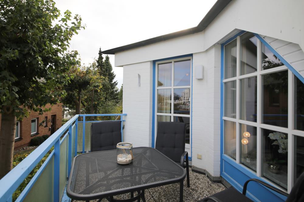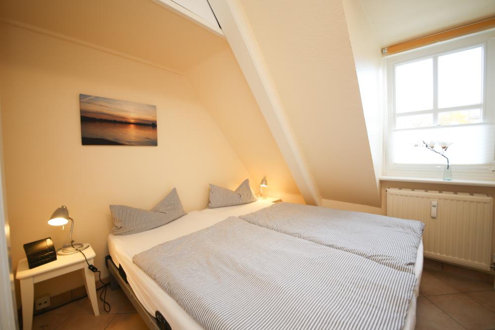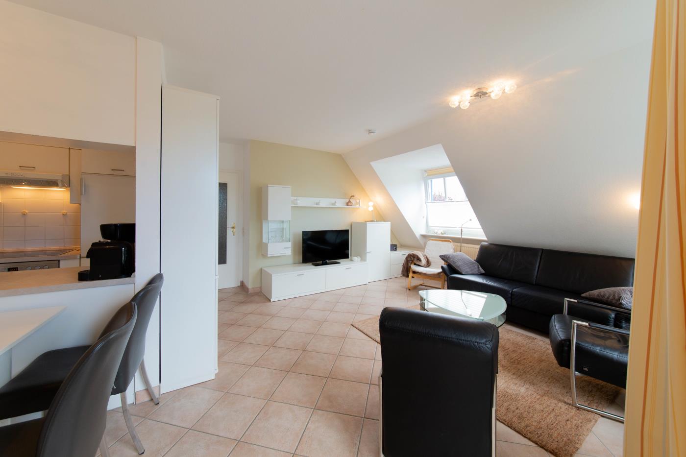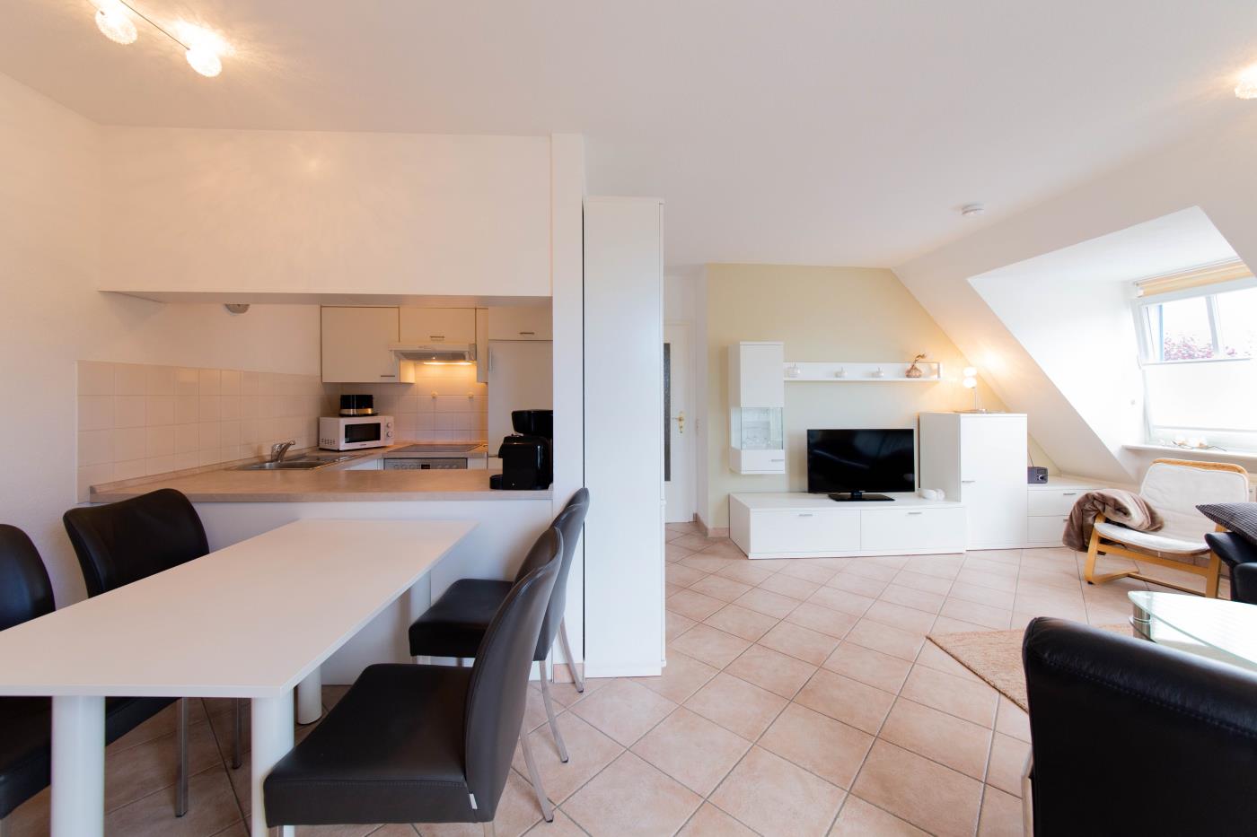 Zwei Zimmer bieten Platz für bis zu vier Personen. Das Wohn- und Esszimmer ist offen gestaltet und dient als gemeinsamer Aufenthaltsort für die ganze Familie. Durch die geschickte Raumaufteilung und die komfortable Schlafcouch lässt sich der Wohnraum im Handumdrehen zu einem Schlafzimmer umfunktionieren. Die angrenzende Küche ist komplett ausgestattet und lässt keine Wünsche offen. Über die Durchreiche erreichen Sie komfortabel den angrenzenden Essplatz. Außerdem gelingen Sie vom Wohnraum auf den nach Osten ausgerichteten Balkon mit gemütlichen Gartenmöbeln. Hier können Sie bereits beim Frühstück die ersten Sonnenstrahlen genießen und vital in den Tag starten. Im separaten Schlafzimmer entsteht durch die Dachschräge eine besonders gemütliche Atmosphäre. Der Clou ist, die beiden Betten (je 0,90er Breite) lassen sich ganz einfach zu einem gemütlichen Doppelbett zusammenschieben. So können Sie den Schlafplatz ganz nach Ihren Gewohnheiten gestalten. Das innenliegende Badezimmer verfügt über eine Waschmaschine, eine große Dusche und einen Handtuchheizkörper.