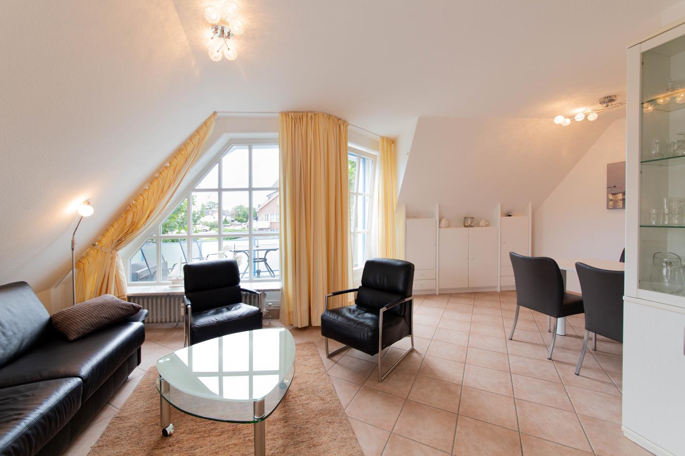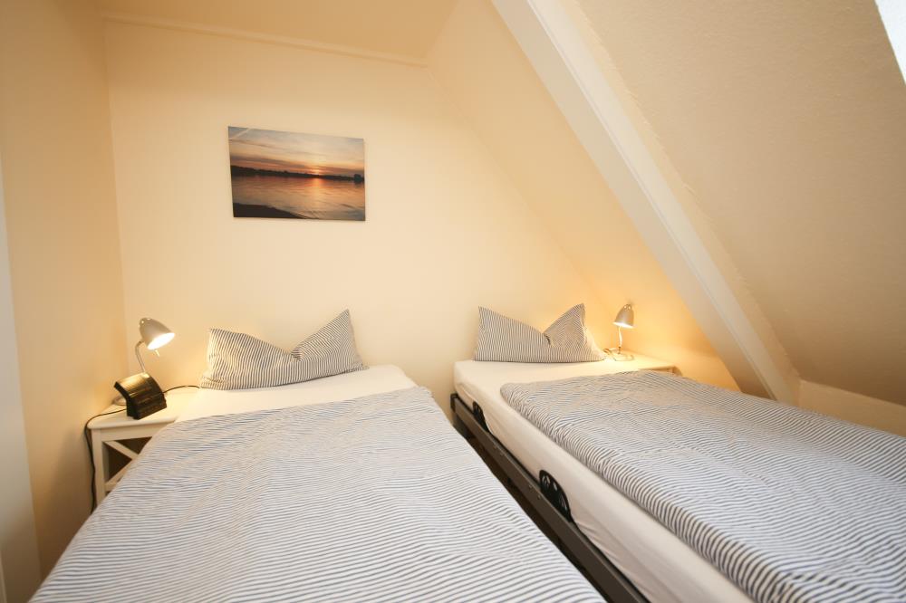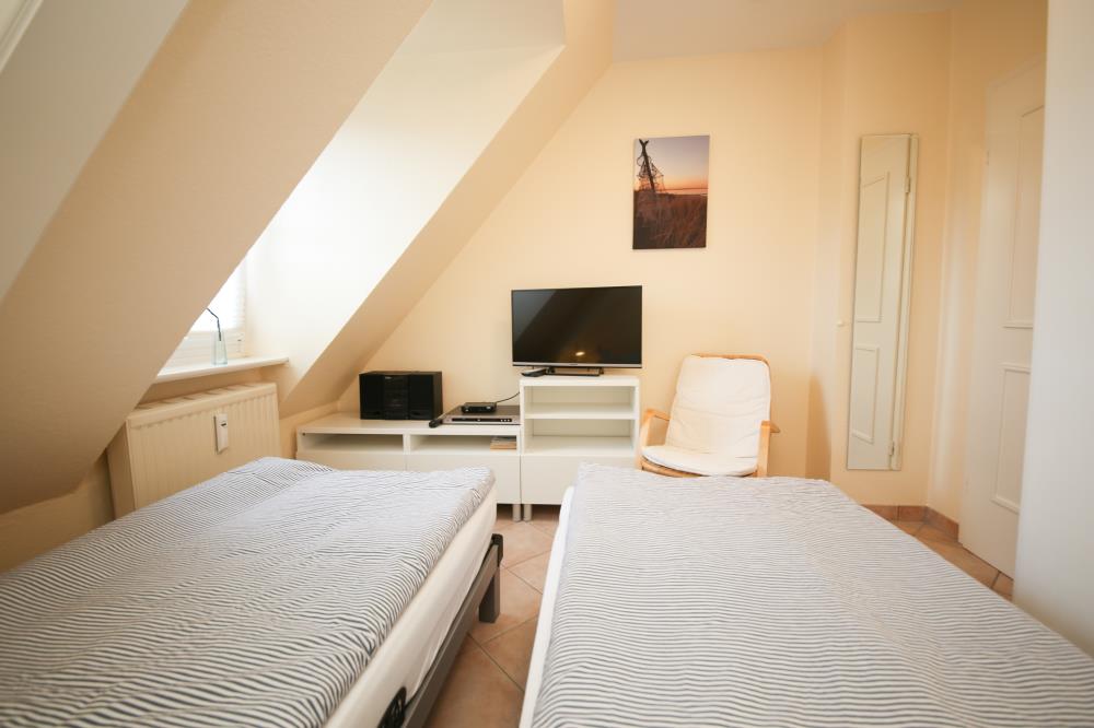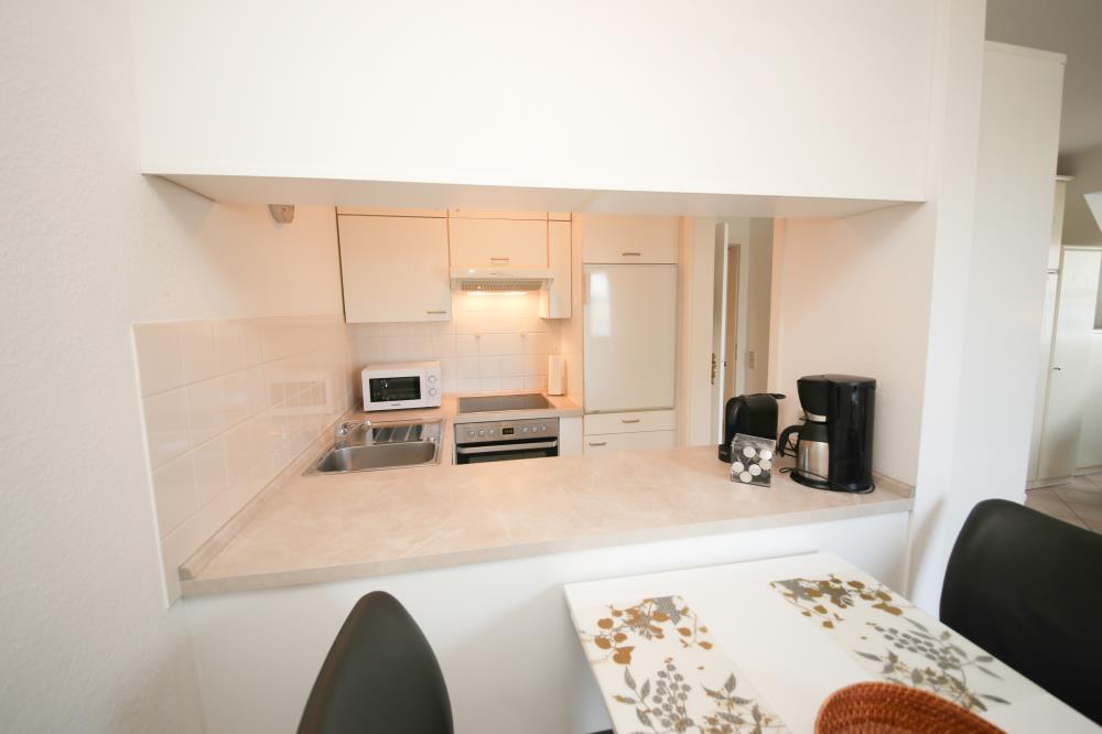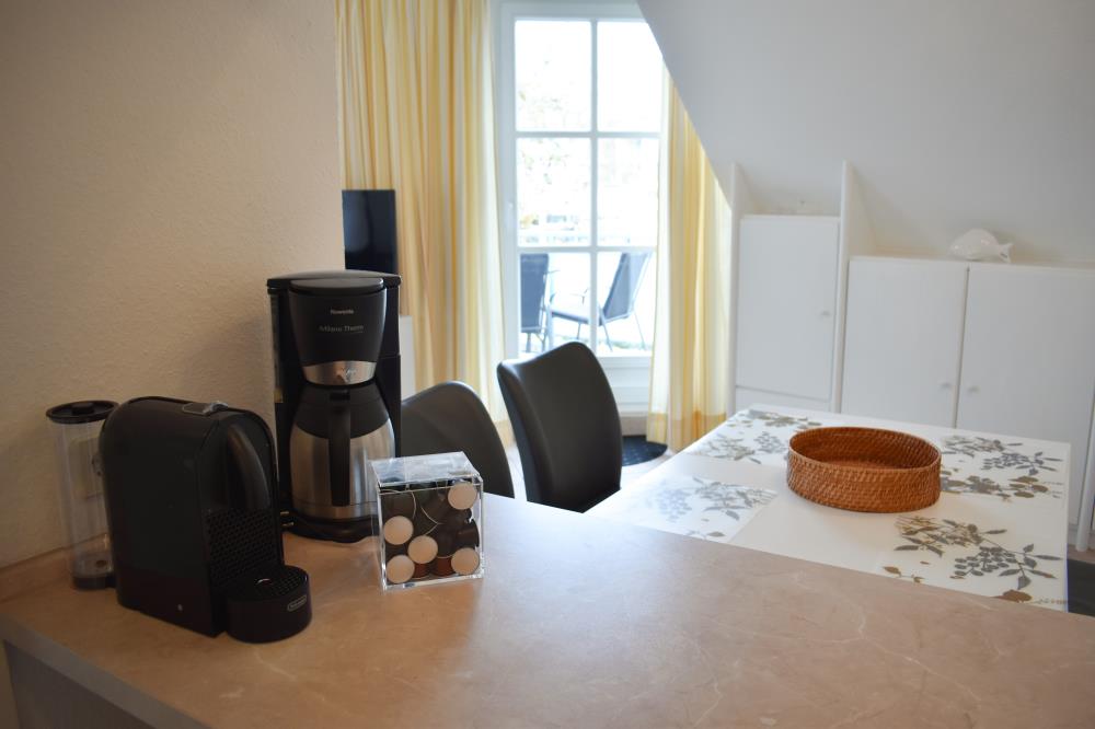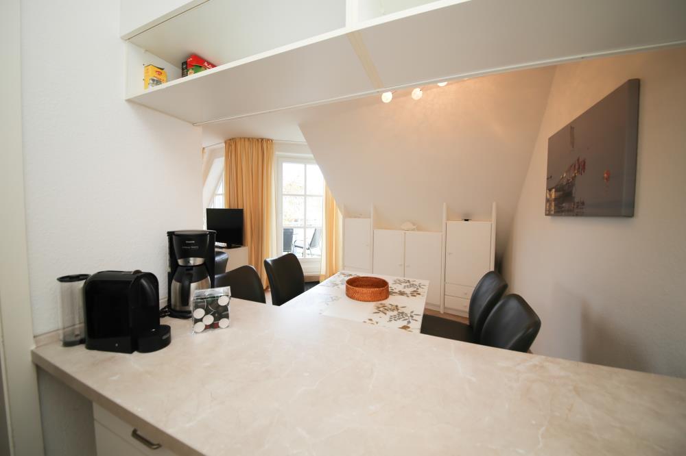 Zwei Zimmer bieten Platz für bis zu vier Personen. Das Wohn- und Esszimmer ist offen gestaltet und dient als gemeinsamer Aufenthaltsort für die ganze Familie. Durch die geschickte Raumaufteilung und die komfortable Schlafcouch lässt sich der Wohnraum im Handumdrehen zu einem Schlafzimmer umfunktionieren. Die angrenzende Küche ist komplett ausgestattet und lässt keine Wünsche offen. Über die Durchreiche erreichen Sie komfortabel den angrenzenden Essplatz. Außerdem gelingen Sie vom Wohnraum auf den nach Osten ausgerichteten Balkon mit gemütlichen Gartenmöbeln. Hier können Sie bereits beim Frühstück die ersten Sonnenstrahlen genießen und vital in den Tag starten. Im separaten Schlafzimmer entsteht durch die Dachschräge eine besonders gemütliche Atmosphäre. Der Clou ist, die beiden Betten (je 0,90er Breite) lassen sich ganz einfach zu einem gemütlichen Doppelbett zusammenschieben. So können Sie den Schlafplatz ganz nach Ihren Gewohnheiten gestalten. Das innenliegende Badezimmer verfügt über eine Waschmaschine, eine große Dusche und einen Handtuchheizkörper.