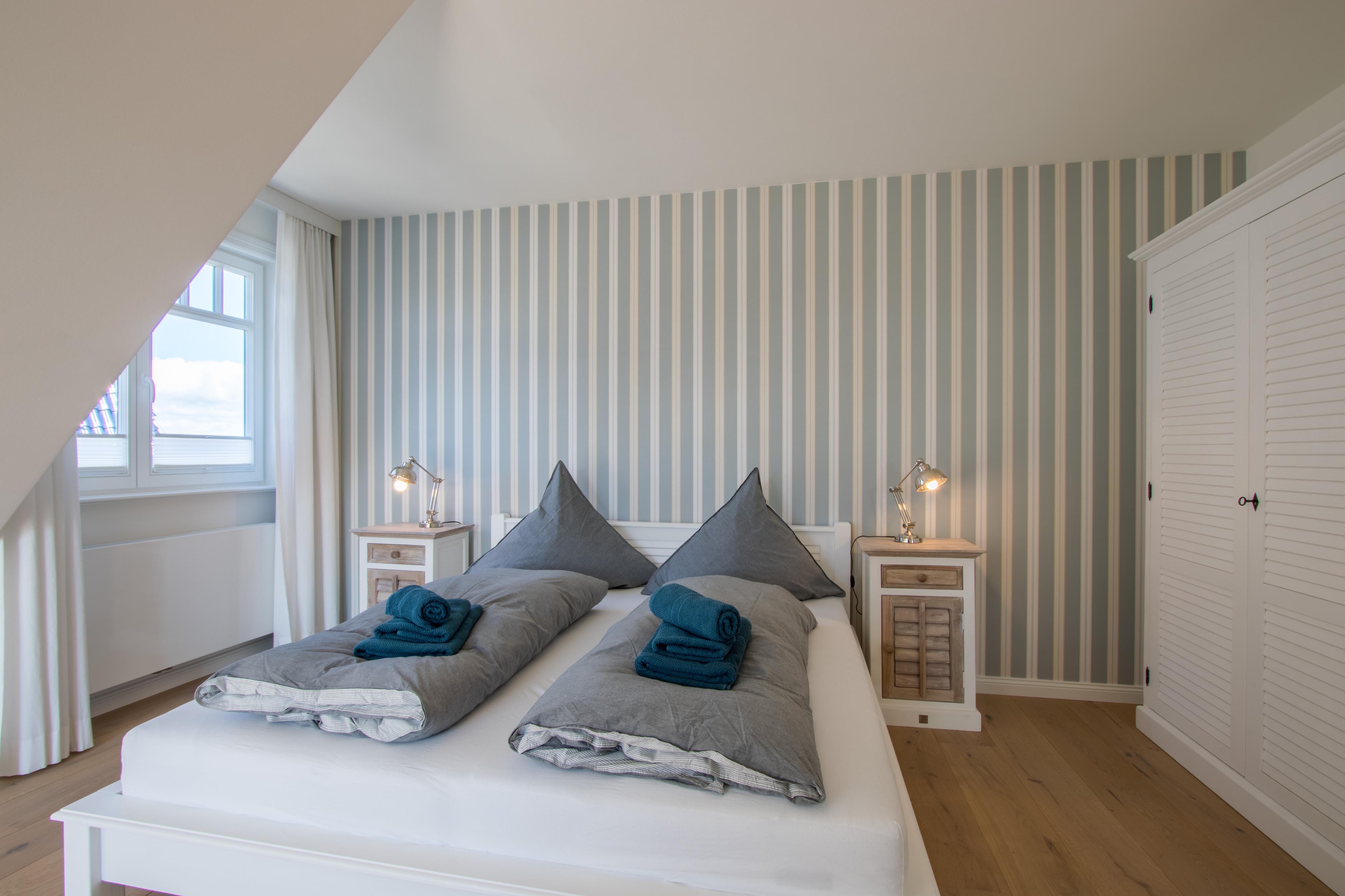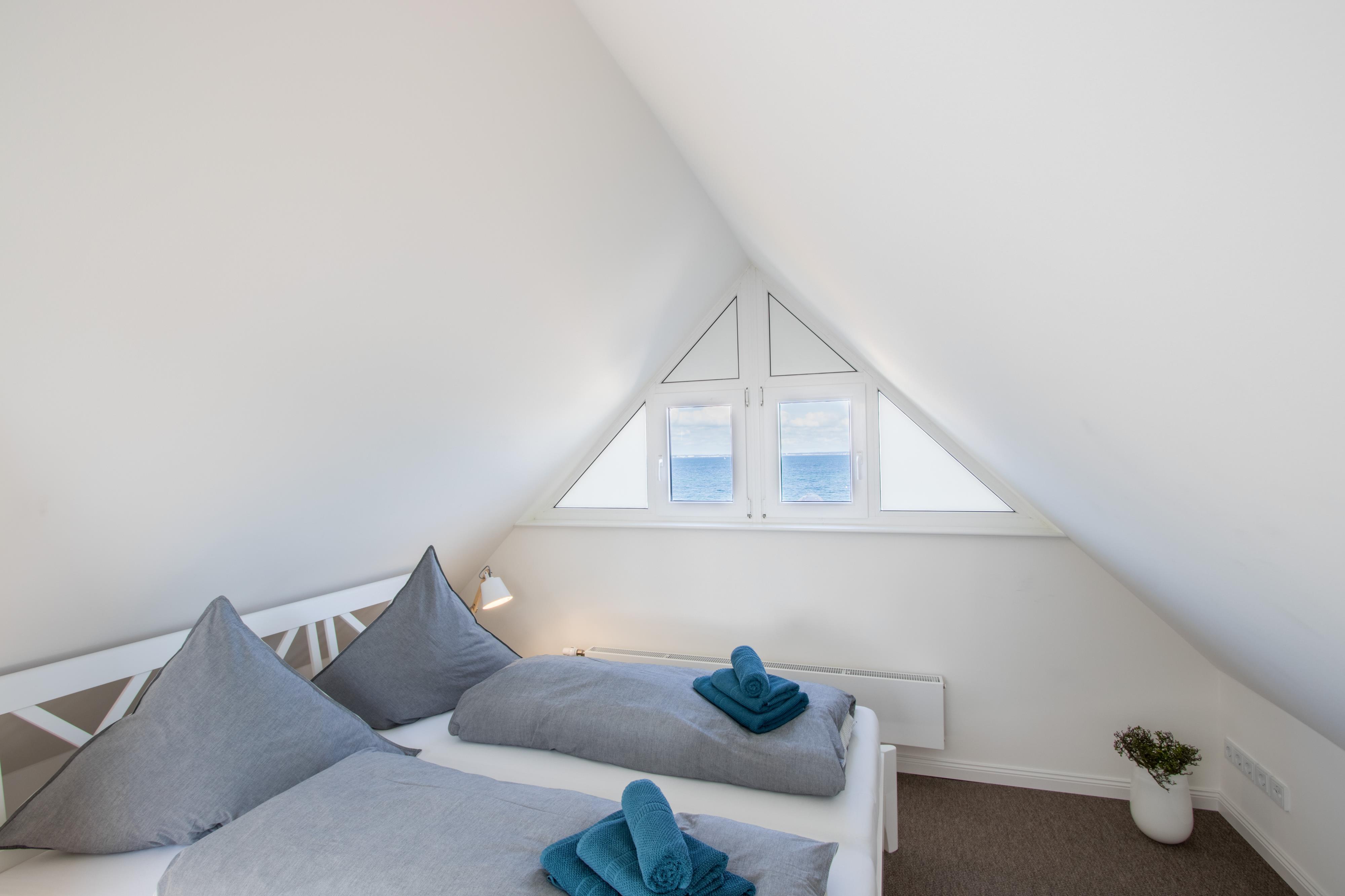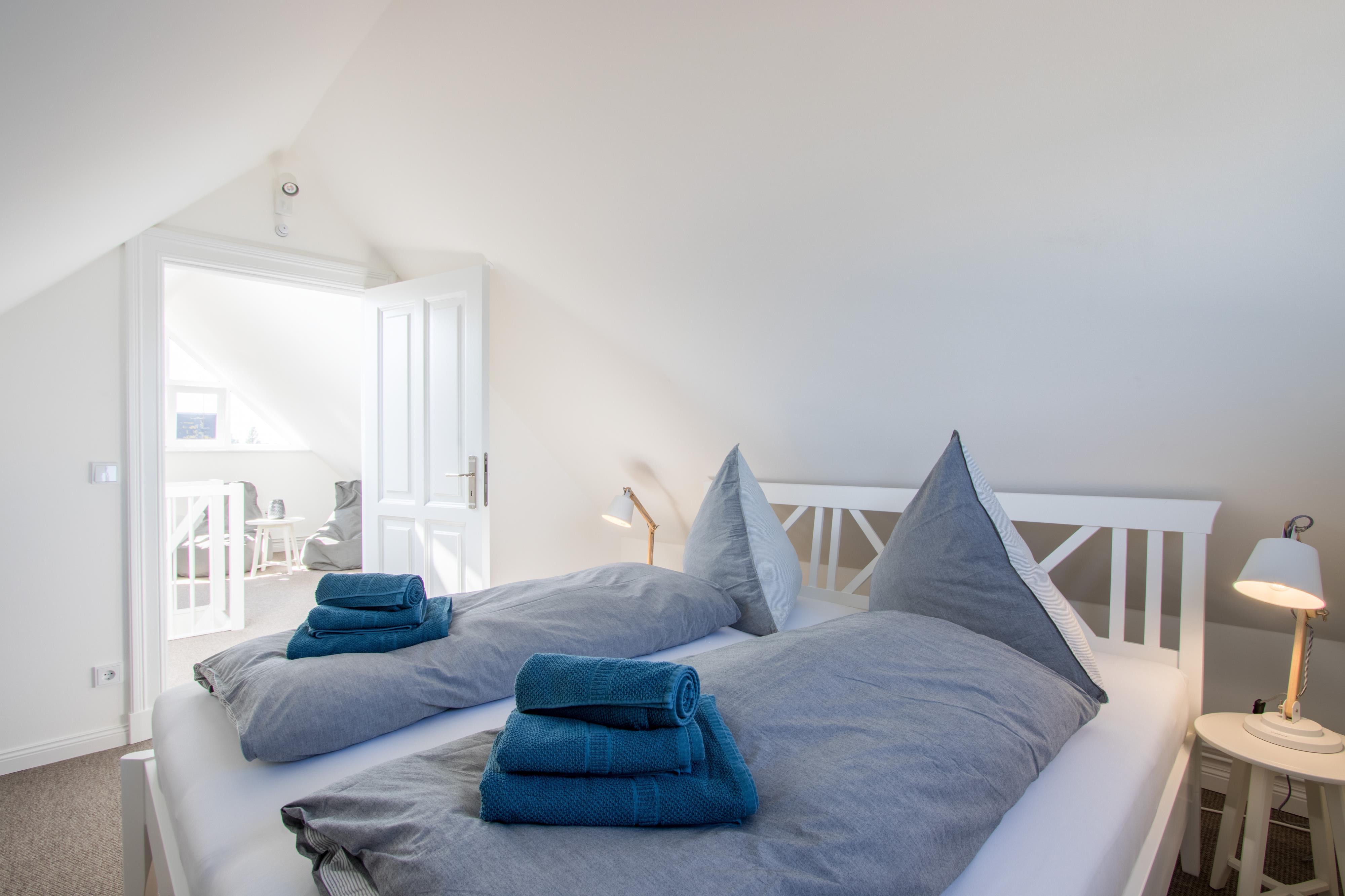 Über die Treppe im Flur gelangen Sie zur Galerie mit Loungemöbeln im Obergeschoss und zum 2. Schlafzimmer mit großem Doppelbett und Meerblick. Die Wohnung ist nicht geeignet für Familien mit kleinen Kindern.