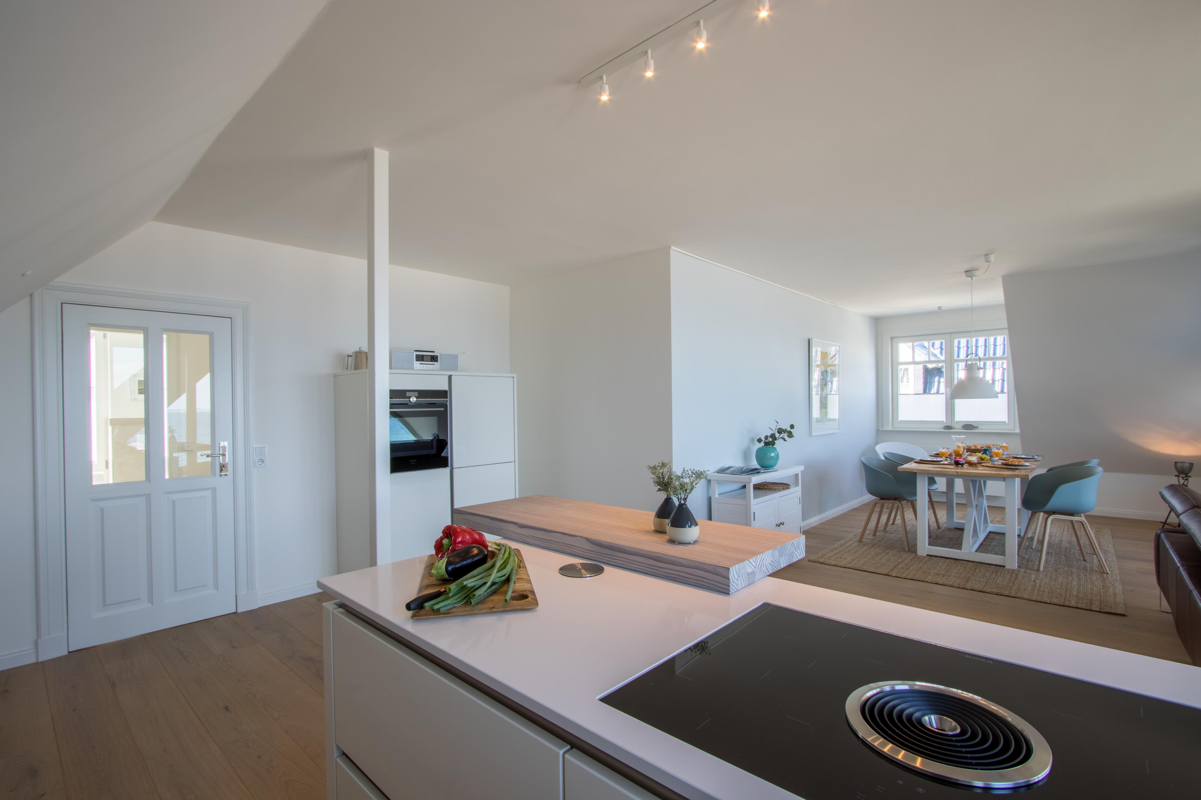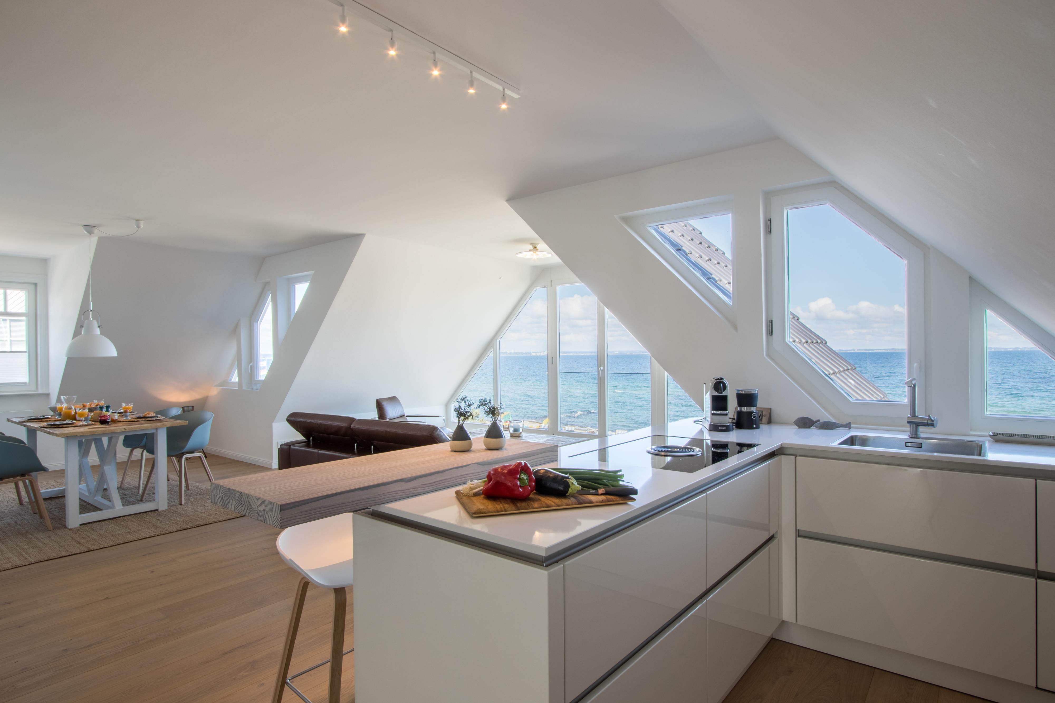Auf der unteren Ebene liegen das Masterschlafzimmer mit TV und kleinem Duschbad sowie ein weiteres geräumiges Duschbad. Das Zentrum ist unzweifelhaft der großzügige Wohn-/Essbereich mit gemütlichem Ledersofa und endlosem Meerblick! Bei geöffneter Terrassentür sehen Sie die Möwen vorbeifliegen und hören das Rauschen der Wellen. Ein großer LOEWE-Fernseher, eine SONORO-Musikanlage sowie schnelles WLAN sorgen für Ihre Unterhaltung. Auch vom Esstisch von Riviera Maison mit gemütlichen HAY-Stühlen genießen Sie den Blick aufs Meer. Die moderne Küche in Hochglanzoptik mit Tresen und Barhockern ist hochwertig ausgestattet: Induktionsherd, integrierte Dunstabsaugung, Geschirrspüler, Backofen, Mikrowelle, Nespresso-, Filterkaffee- & Küchenmaschinen - und natürlich mit Meerblick.