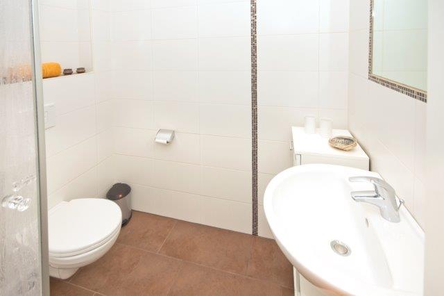 Das schöne Badezimmer bietet Ihnen: WC, Dusche, Föhn, eine moderne Waschbeckenkombination, viele Ablagemöglichkeiten sowie eine Fussbodenheizung und einen Handtuchtrockner.