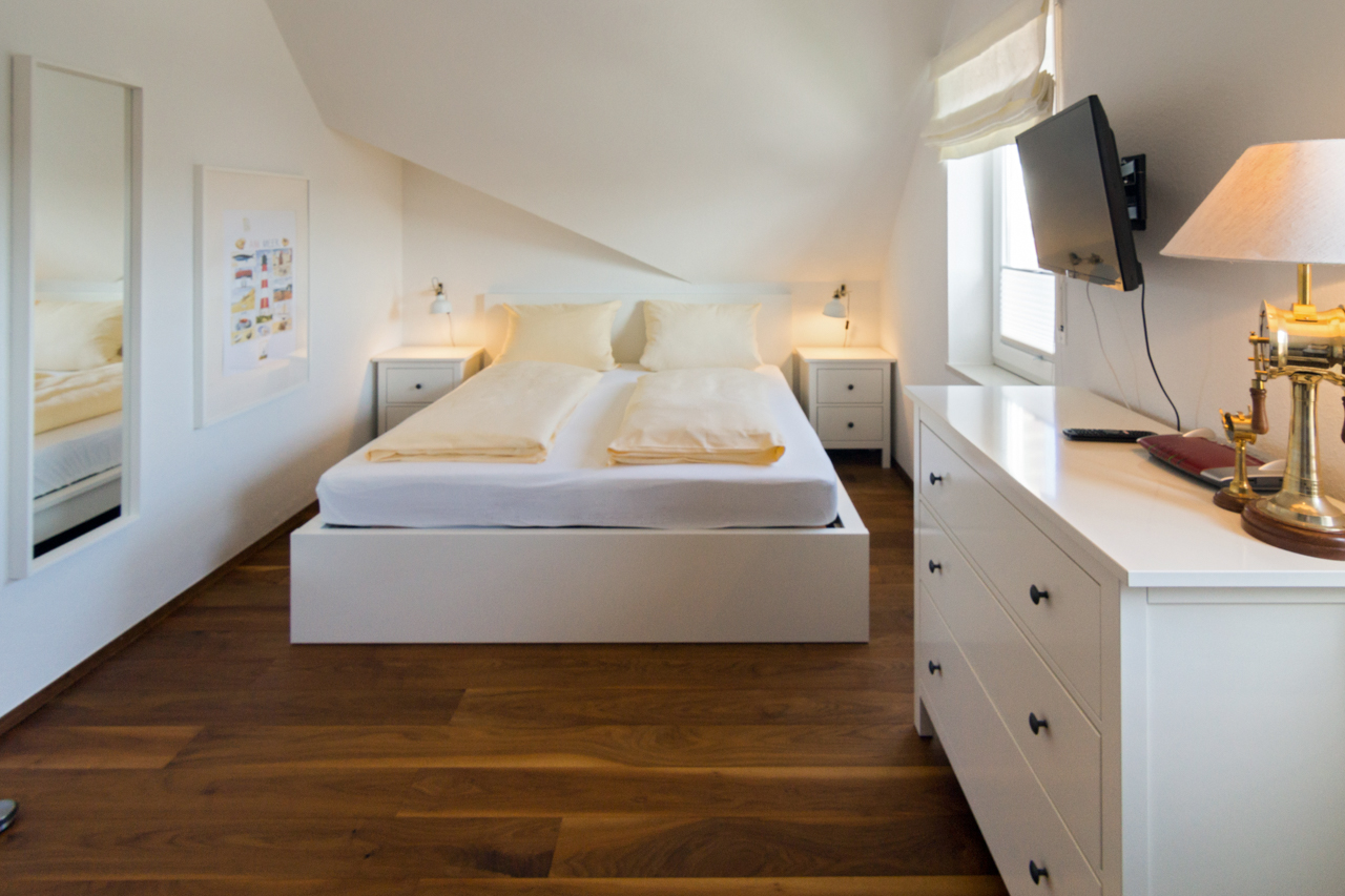 Zwei Personen finden in dem großzügigen Elternschlafzimmer mit dem hohen Doppelbett Platz. Wie auch der Wohnbereich ist dieser Raum mit einem modernen Flat-TV ausgestattet. In einem weiteren Beistellbett kann auch ein Kind zusätzliche seine Nachtruhe finden. Zudem besitzt das Loft einen ausgebauten Spitzgiebel, in dem sich ein unkonventionelles Matratzenlager befindet – ideal für ältere Kinder, die gerne in den Sternenhimmel hinausschauen möchten.
