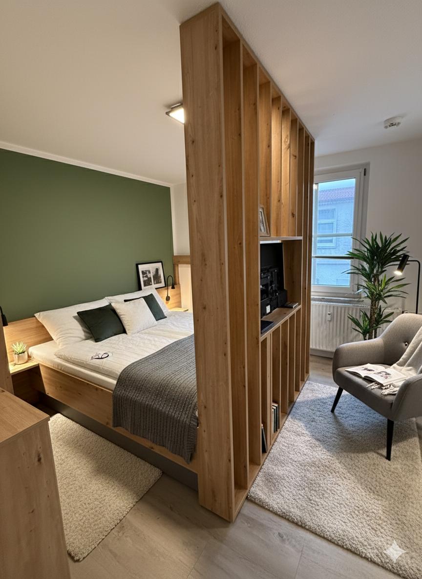 Wohn- und Schlafraum mit stilvoller Einrichtung und gemütlicher Sitzecke – perfekt für eine Tasse Tee oder Kaffee zwischendurch