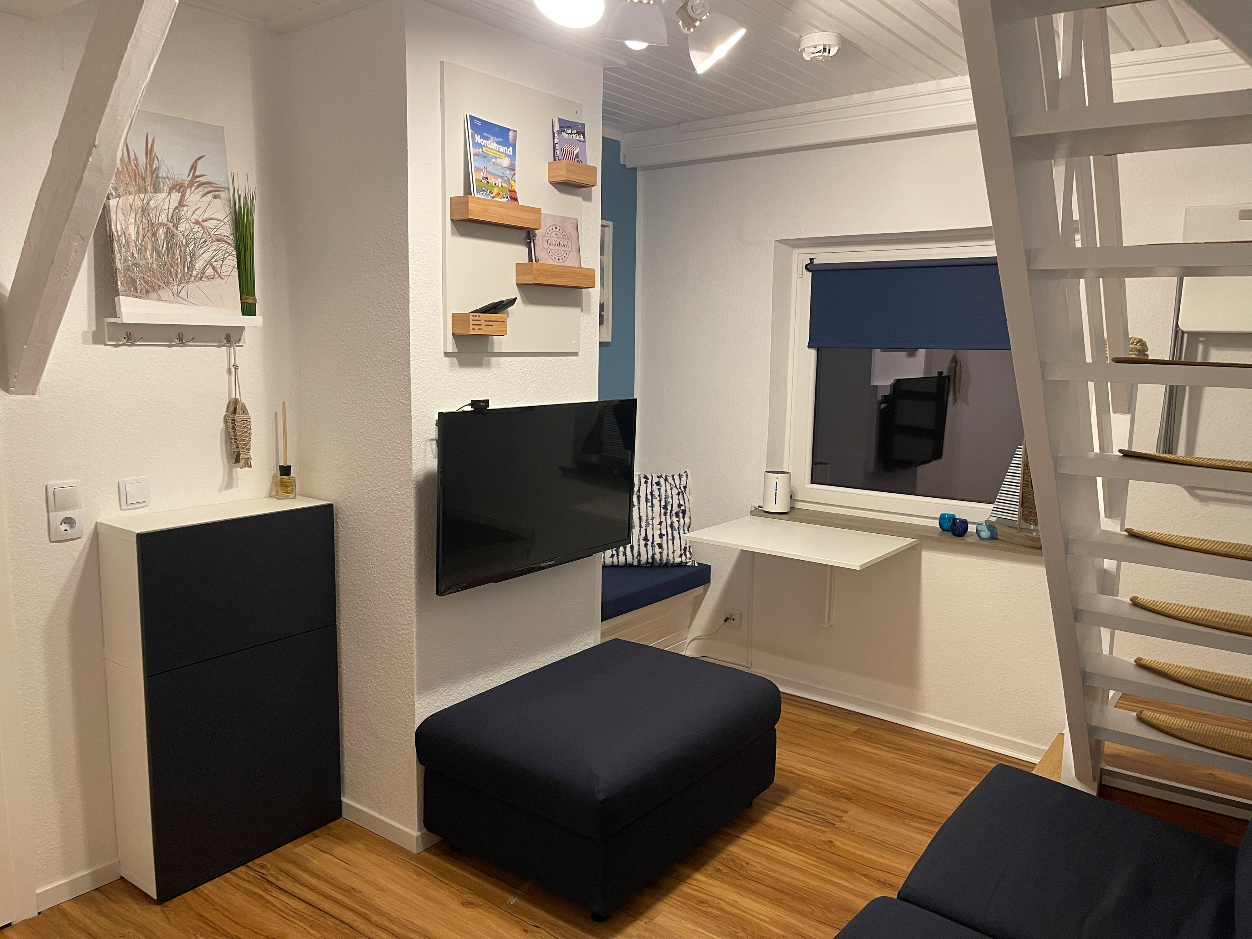 Die kleine (30m2), maritim eingerichtete Maisonette-Wohnung befindet sich im Ober- und Dachgeschoss des Bolshauses und ist für 2 Personen ausgestattet. Zudem verfügt Sie über einen 10m2 großen Balkon.
