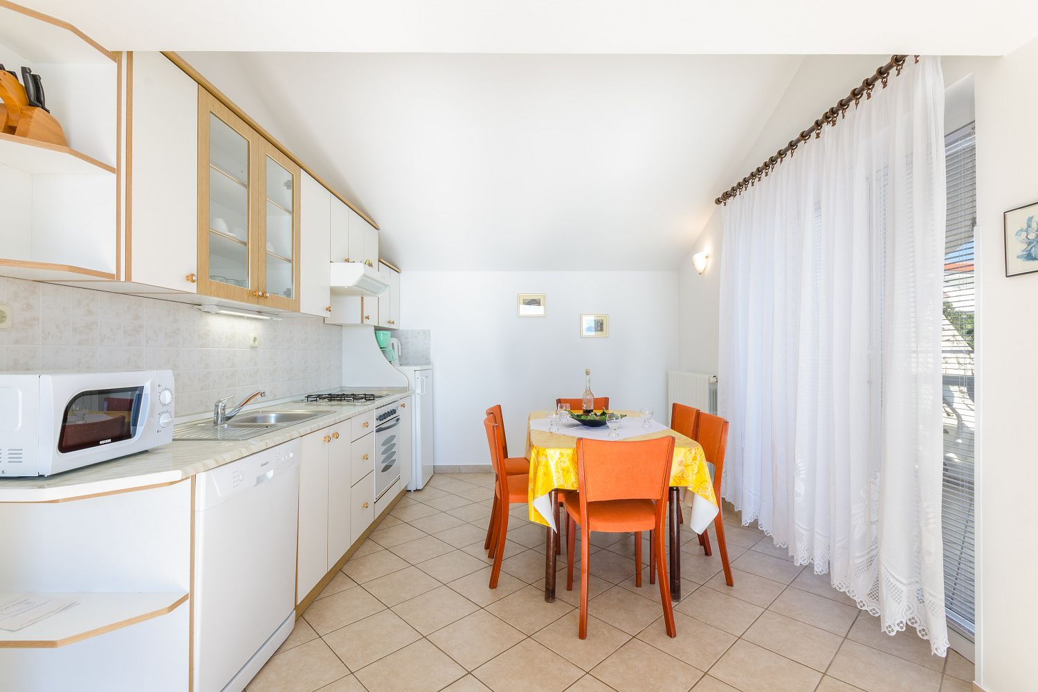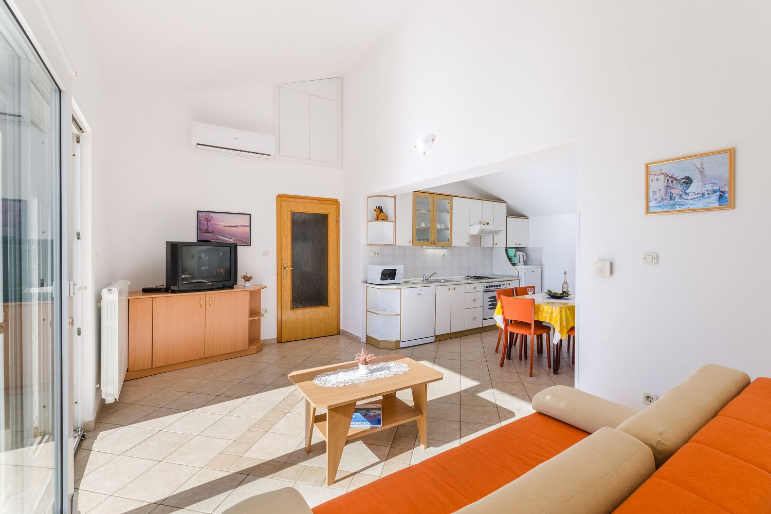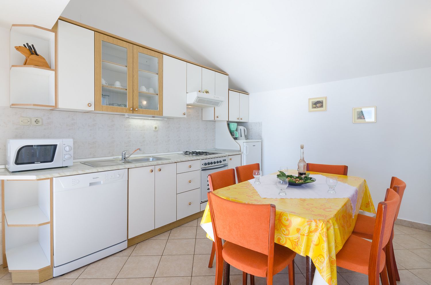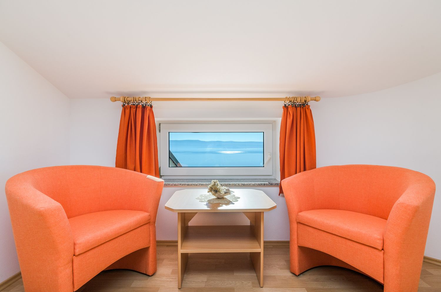 Diese Ferienwohnung für maximal sechs Personen liegt über den Dächern von Novi Vinodolski. Die 75 m² große Erdgeschosswohnung verfügt über eine komfortable Wohnküche, zwei Schlafzimmer, ein Badezimmer und eine überdachte, möblierte Terrasse mit einem grandiosen Meerblick. Im Wohnzimmer befindet sich eine Schlafcouch für zwei weitere Personen. Hinter dem Haus befindet sich ein reservierter Parkplatz. Die Gäste können auch den Grill frei benutzen.