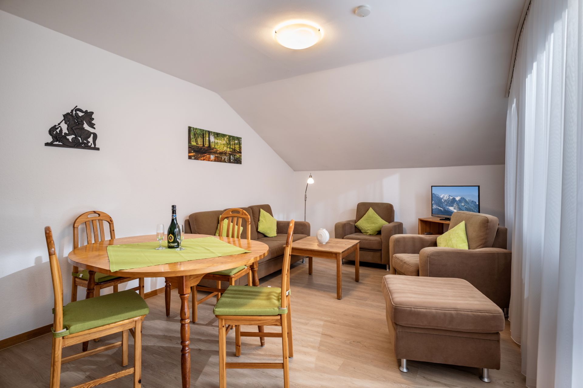 Gemütlich Dreizimmerwohnung mit Blick nach Süden auf das Kaisergebirge (56 qm, 2 bis 4 Personen) mit gemütlicher Eckbank und einer Schlafcouch. Wohnzimmer mit Eckbank, Schlafcouch und Fernseher. 1 Schlafzimmer mit Doppelbett. 1 Schlafzimmer mit zwei Einzelbetten und Kleiderschrank. Bad mit WC und Wanne. Küche mit 4 Plattenherd, Kühlschrank, Mikrowelle, Kaffeemaschine und Toaster. Nach einem ereignisreichen Tag lädt der Balkon zum Entspannen ein. Handtücher und Bettwäsche sind vorhanden. Zur Wohnung gehört eine Tiefgarage.