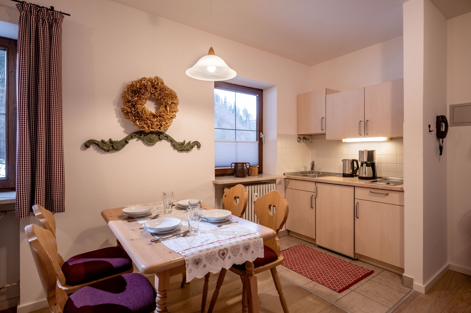 Ausgestattet ist diese charmante gepflegte 2-Zimmer Ferienwohnung mit einem Schlafzimmer, Eßzimmer, Wohnzimmer mit einer Ausziehcouch für 2 Personen, Küchenzeile mit einem Bad mit Badewanne, Toilette separat und einem Balkon. Bettwäsche, Handtücher und Geschirrtücher sind inkusive. Im Haus sind: Sauna, Spielzimmer und ein Skikeller. In der Pension Lavendel können Sie sich mit einem guten Frühstück verwöhnen lassen, nur mit Reservierung am Vortag.