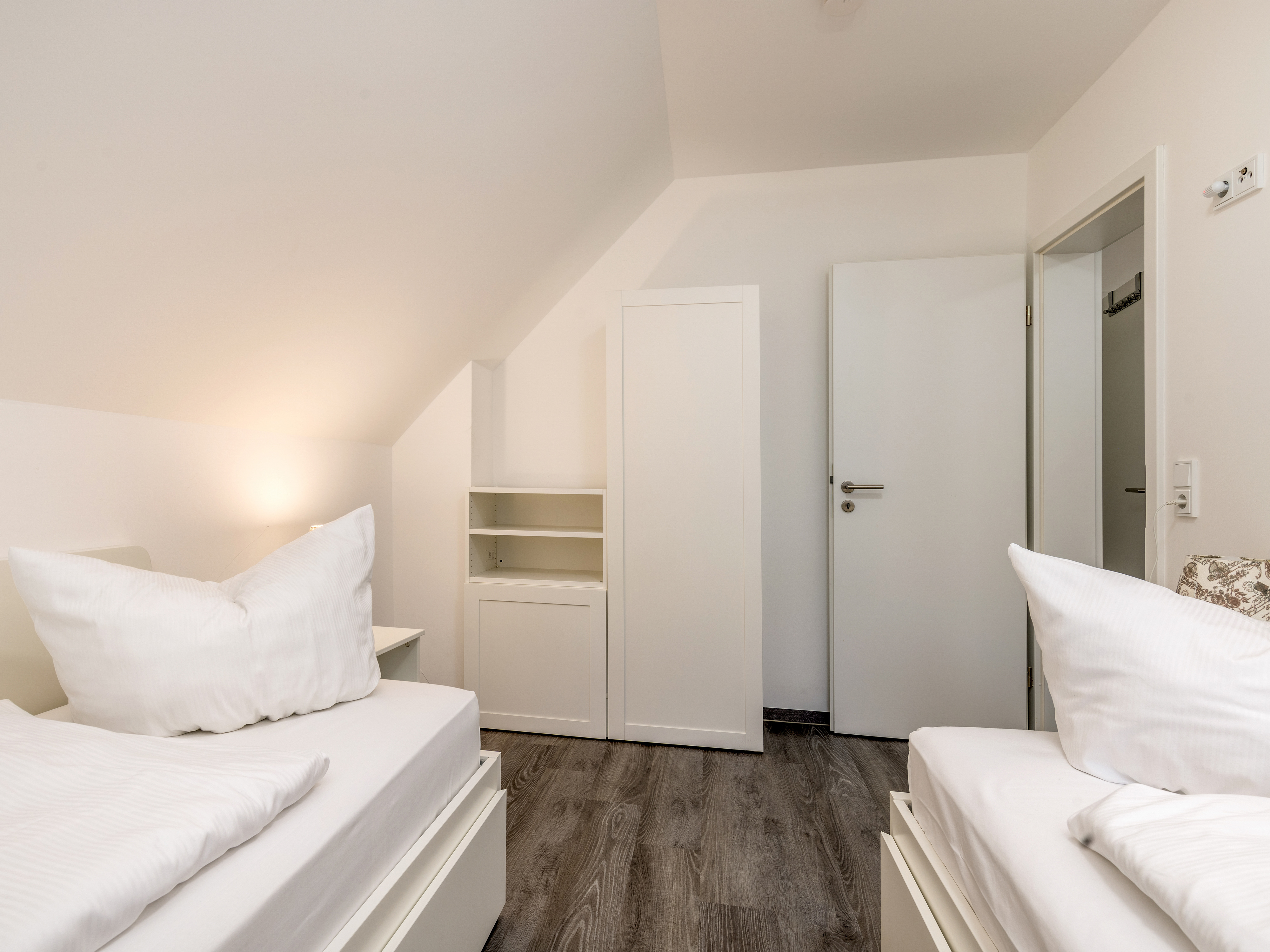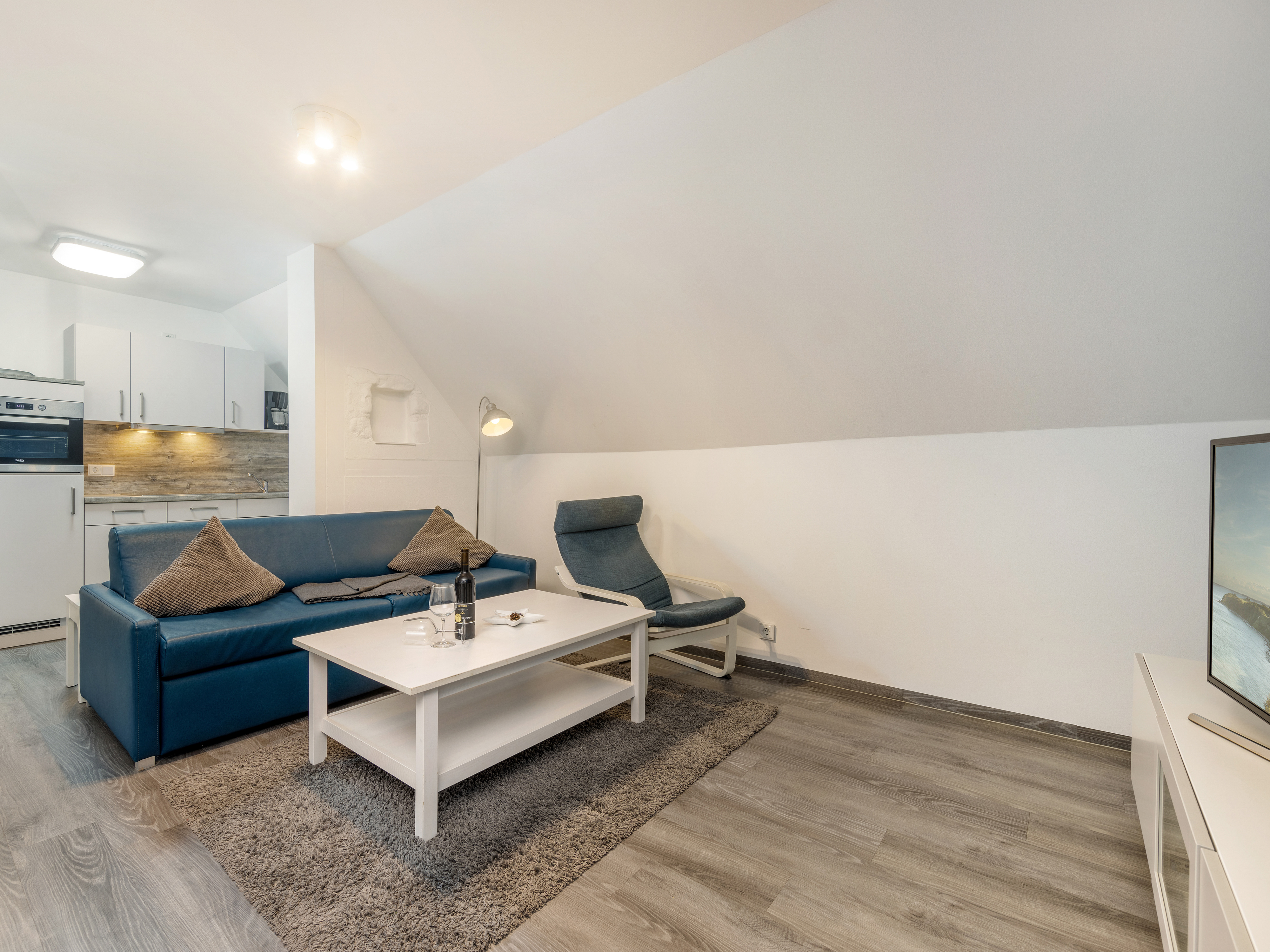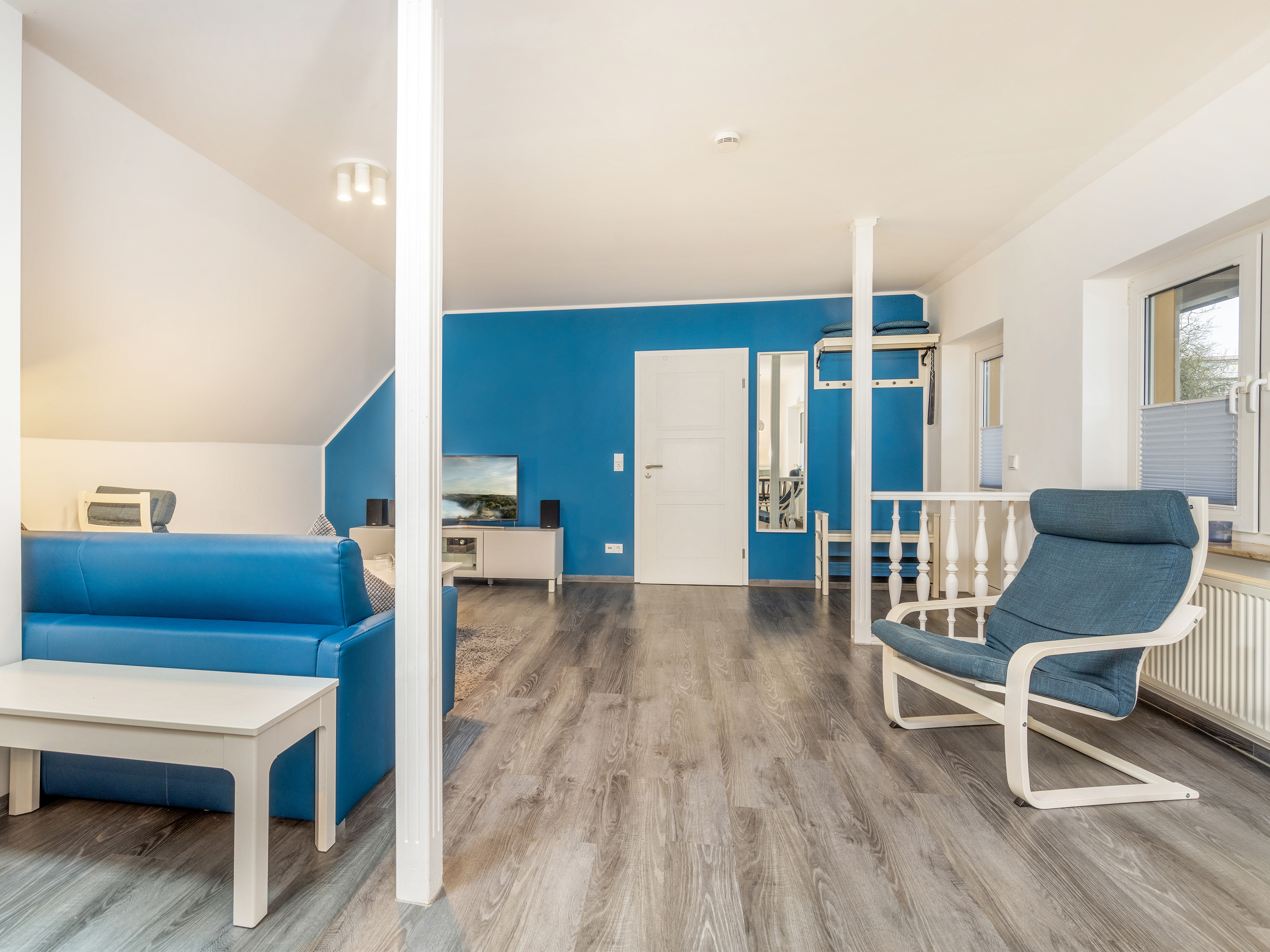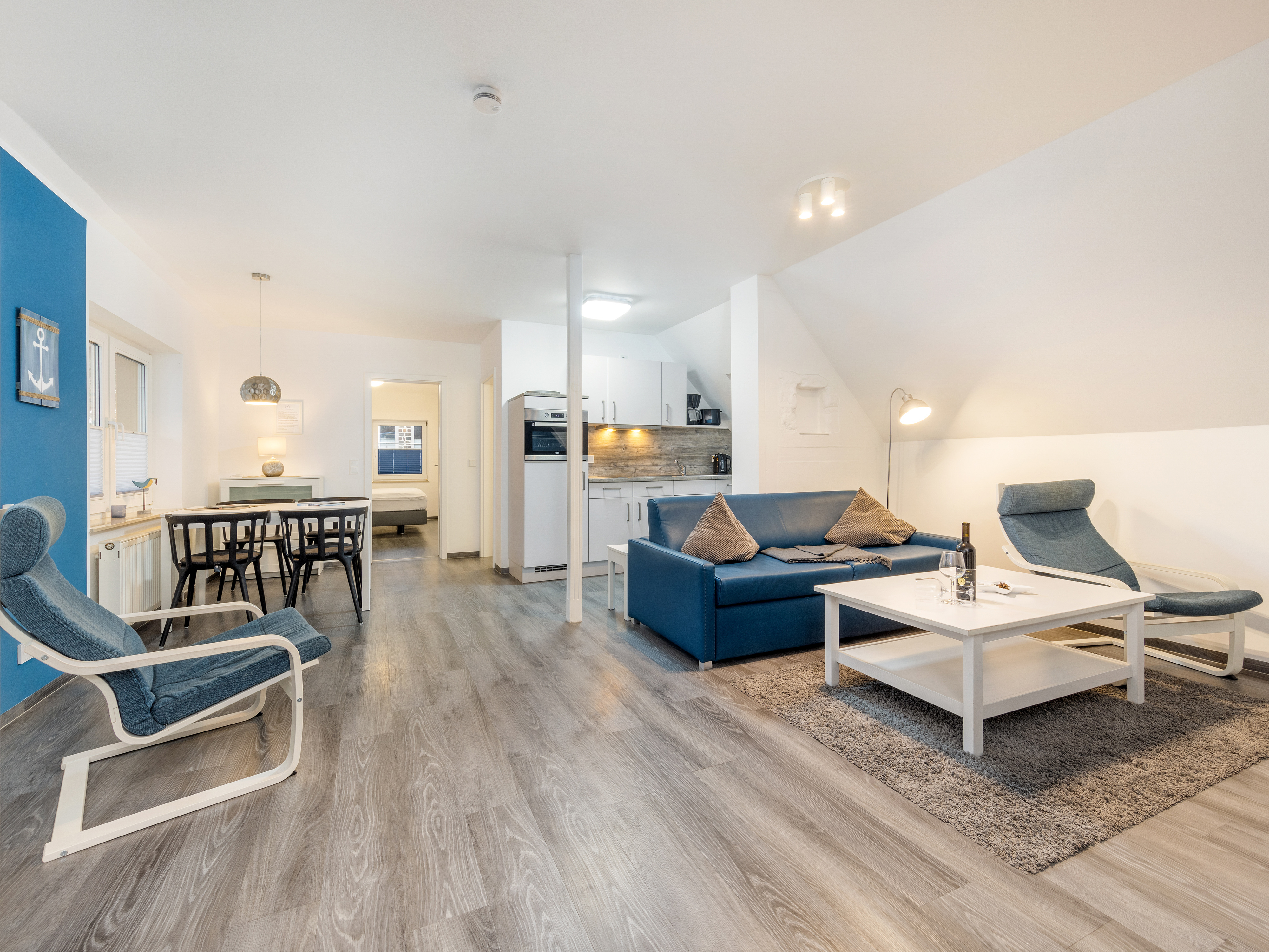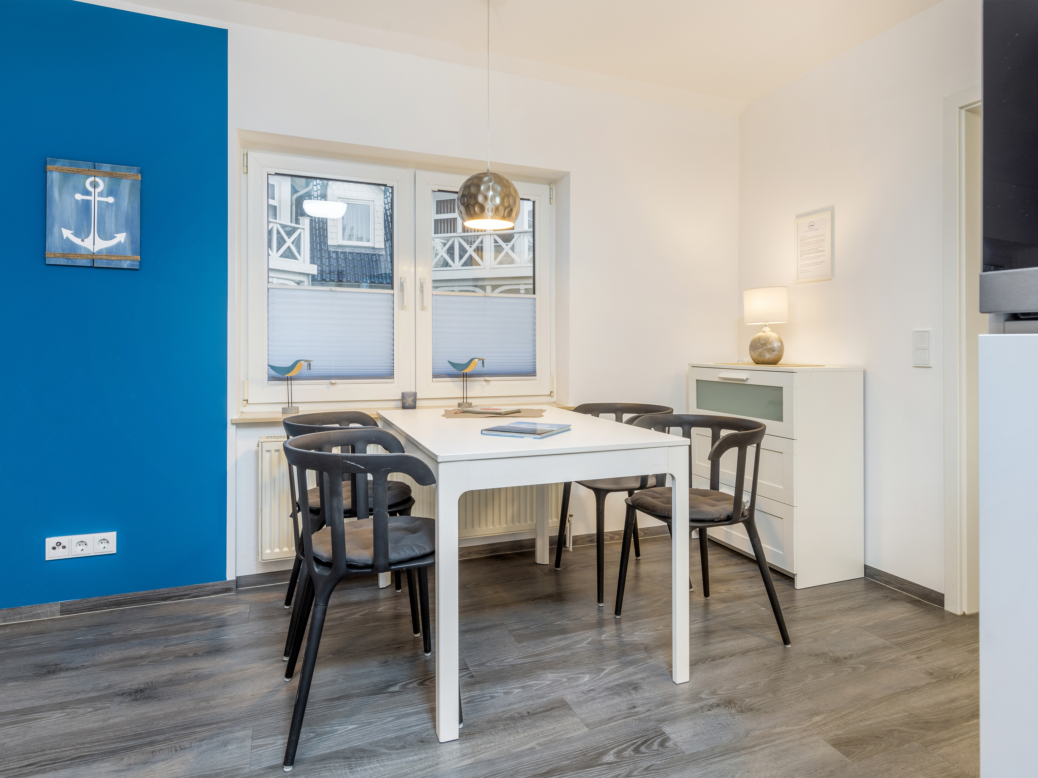 Im 1. Obergeschoss liegt die helle und freundliche Ferienwohnung Meeresbrise mit ca. 55 m² für 4 Personen. Sie verfügt über zwei Schlafzimmer, ein Wohnzimmer mit komplett ausgestatteter Küche, ein Badezimmer mit Dusche und einen Balkon.