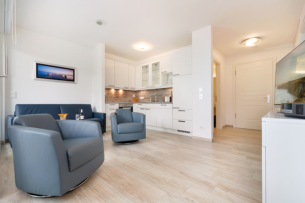 Der offene Wohn- und Kochbereich ist modern und stilvoll eingerichtet. Die voll ausgestattete Küche mit Miele-Geräten bietet alles, was Sie für Ihren Aufenthalt benötigen, darunter Kühlschrank, Geschirrspüler, Mikrowelle und weitere hochwertige Ausstattungsmerkmale.