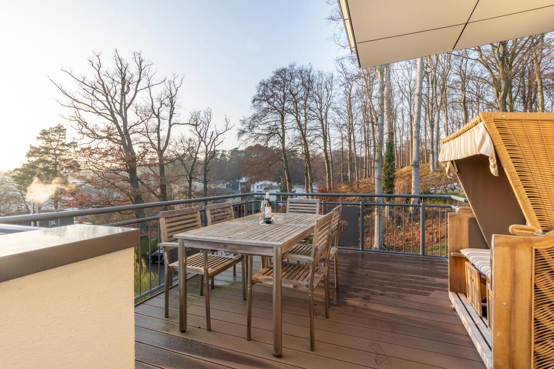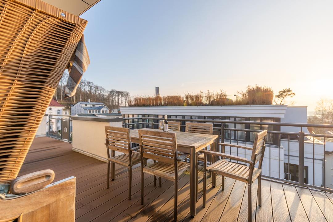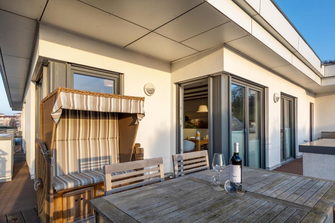 Ein besonderes Highlight ist die möblierte Dachterrasse mit Esstisch für 6 Personen und Strandkorb. Dank der Süd-Südwest-Lage genießen Sie hier viele Sonnenstunden und entspannte Abende in absolut ruhiger Umgebung.