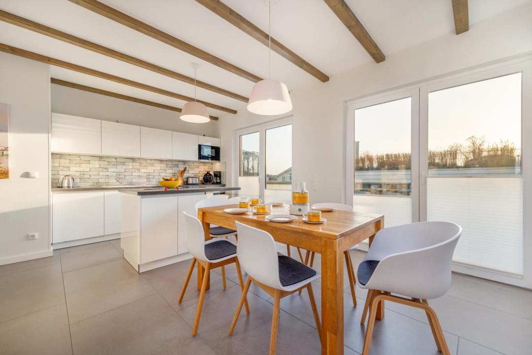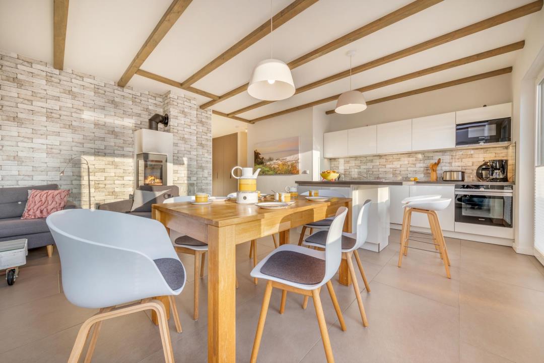 Die hochwertige Designküche mit Kochinsel ist mit Miele-Markengeräten ausgestattet und lässt keine Wünsche offen – inklusive Espressomaschine, Kaffeemaschine, Waffeleisen und vielem mehr. Der große Eichenholz-Esstisch bietet Platz für gemeinsame Mahlzeiten.