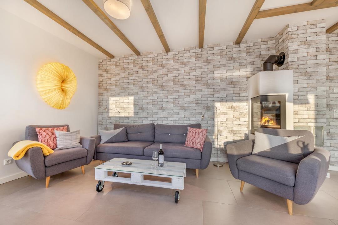 Wohnen & GenießenDer lichtdurchflutete Wohn- und Essbereich mit großen Fensterflächen schafft eine offene, freundliche Atmosphäre. Eine gemütliche Sitzgarnitur, eine ausziehbare Couch, der moderne Kaminofen sowie ein Smart-TV mit Soundbar sorgen für entspannte Abende.