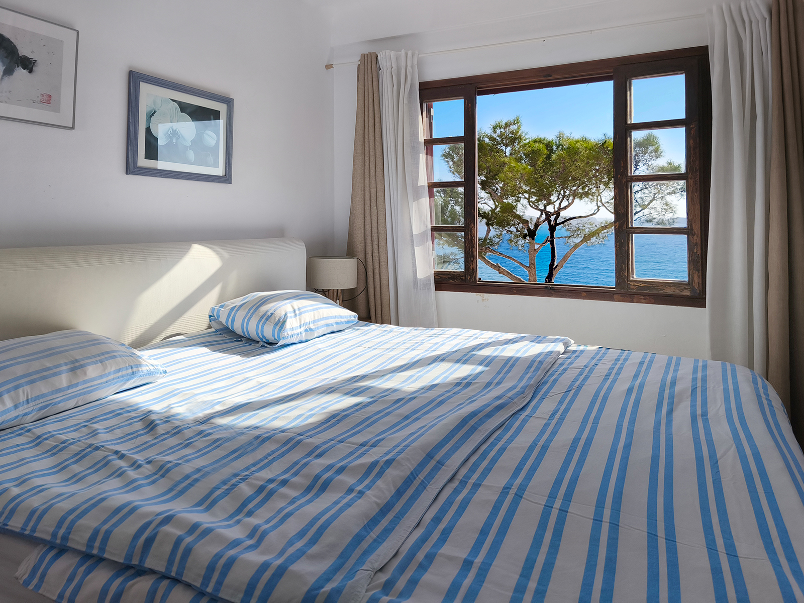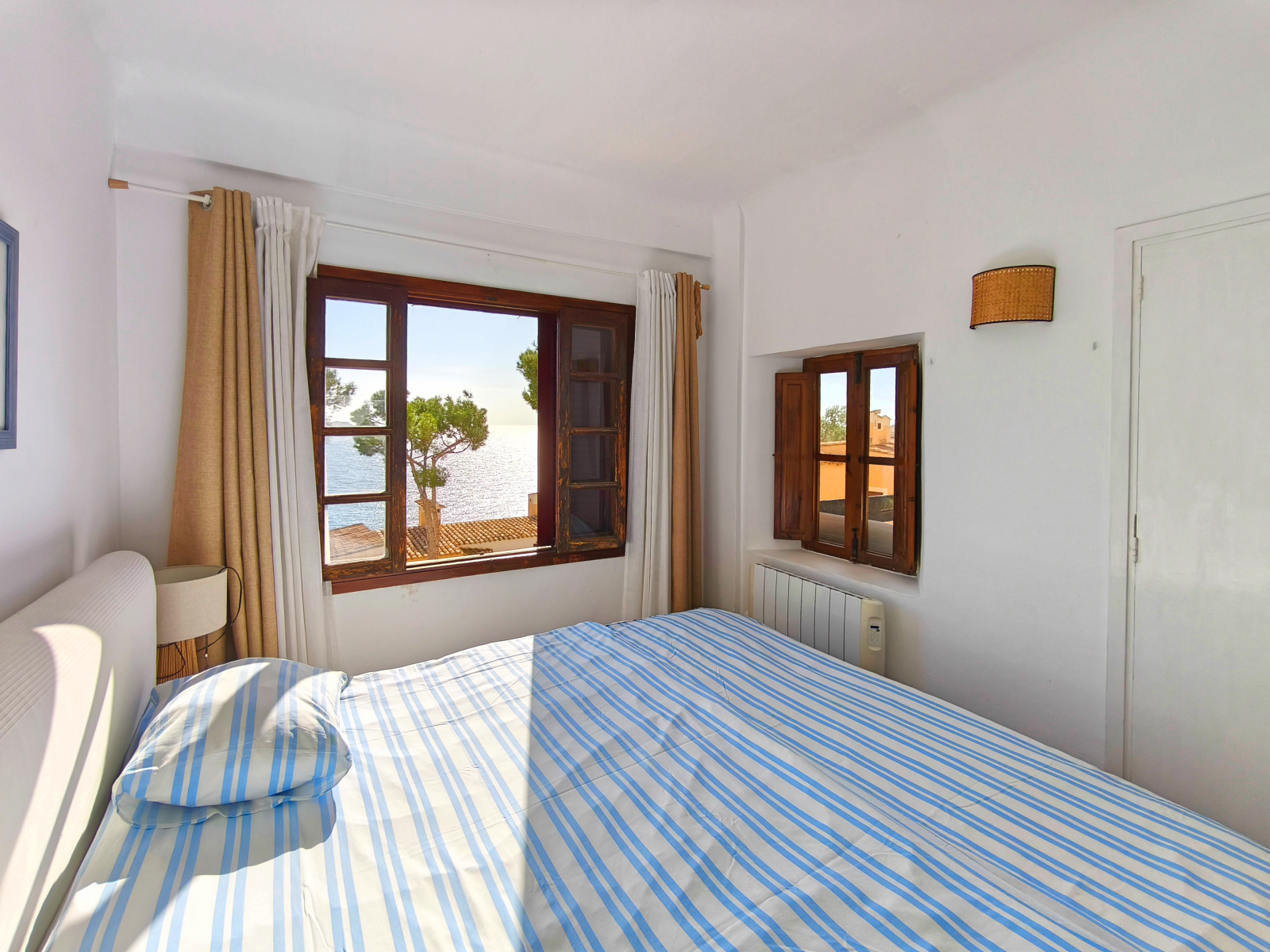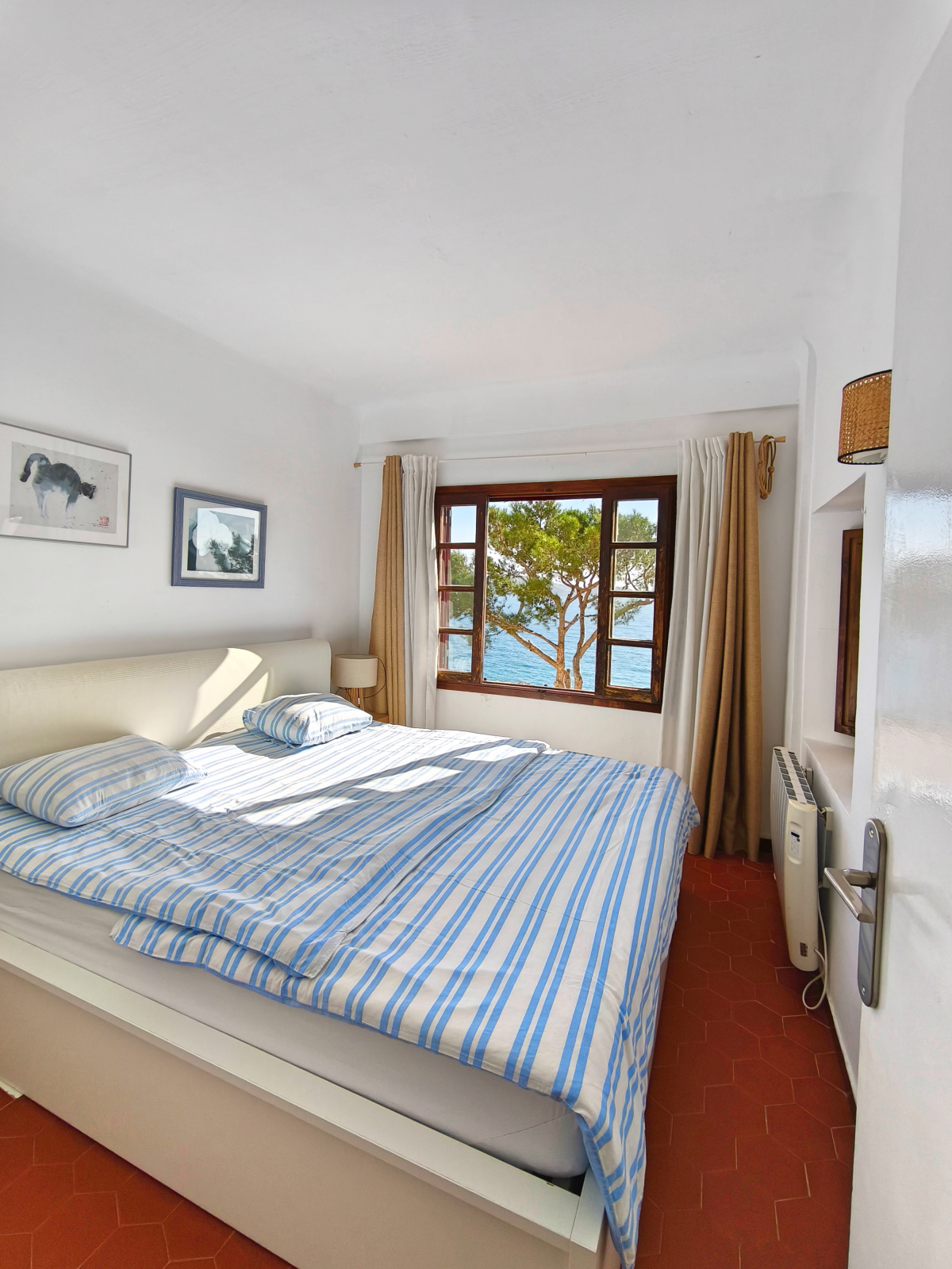 Das gemütliche Schlafzimmer mit Doppelbett schenkt Ihnen ebenfalls den fantastischen Blick auf das glitzernde Mittelmeer. Die Lage im 1. Stock ist ideal für Gäste, die nur wenige Stufen zurücklegen möchten. Die hervorragende Infrastruktur der Anlage liegt in unmittelbarer Reichweite: Genießen Sie den direkten Meerzugang für ein erfrischendes Bad oder entspannen Sie am Gemeinschaftspool, der von einem Restaurant mit fantastischem Meerblick gesäumt wird. Zur komfortellen Ausstattung gehören zudem zwei weitere Restaurants sowie ein gut sortierter Lebensmittelladen für den spontanen Bedarf – in den Wintermonaten von November bis März jedoch geschlossen. Die ideale Lage zeigt sich ebenso in der näheren Umgebung: Die traumhaften Sandstrände von Paguera ebenso wie die reizende Kiesbucht von Cala Fornells erreichen Sie in einem kurzen Spaziergang, genau wie die lebendige Ortsmitte mit ihrer abwechslungsreichen Gastronomie und ihren zahlreichen Einkaufsmöglichkeiten. Ihre Vorteile auf einen Blick: ???? Traum-Meerblick aus der Wohnung und von der Terrasse ???? Überdachte Terrasse (ca. 10 m²) als gemütlicher Wohnraum im Freien ???? Kostenfreie Parkmöglichkeit an der Straße vor der Anlage ???? Gemeinschaftspool mit Restaurantanschluss & direkter Meerzugang via Leiter ???? Umfangreiche Infrastruktur: 3 Restaurants, Lebensmittelgeschäft und Eisdiele direkt in der Anlage (Winter: ggf. eingeschränkt), weitere fußläufig im Ort. ???? Ideale Lage: Kurze Wege zu den Sandstränden von Paguera, der Bucht von Cala Fornells sowie Geschäften und Restaurants im Ort.