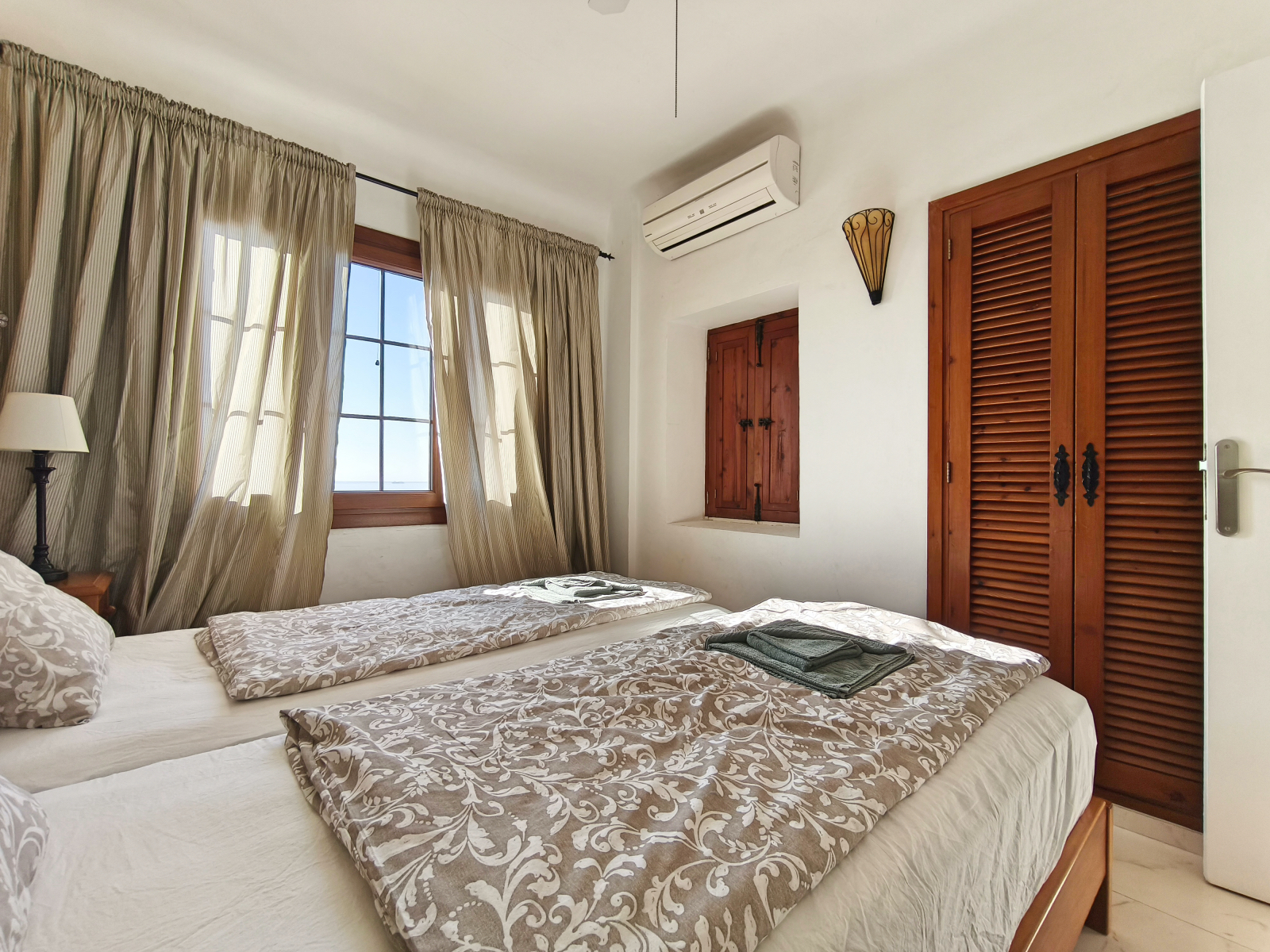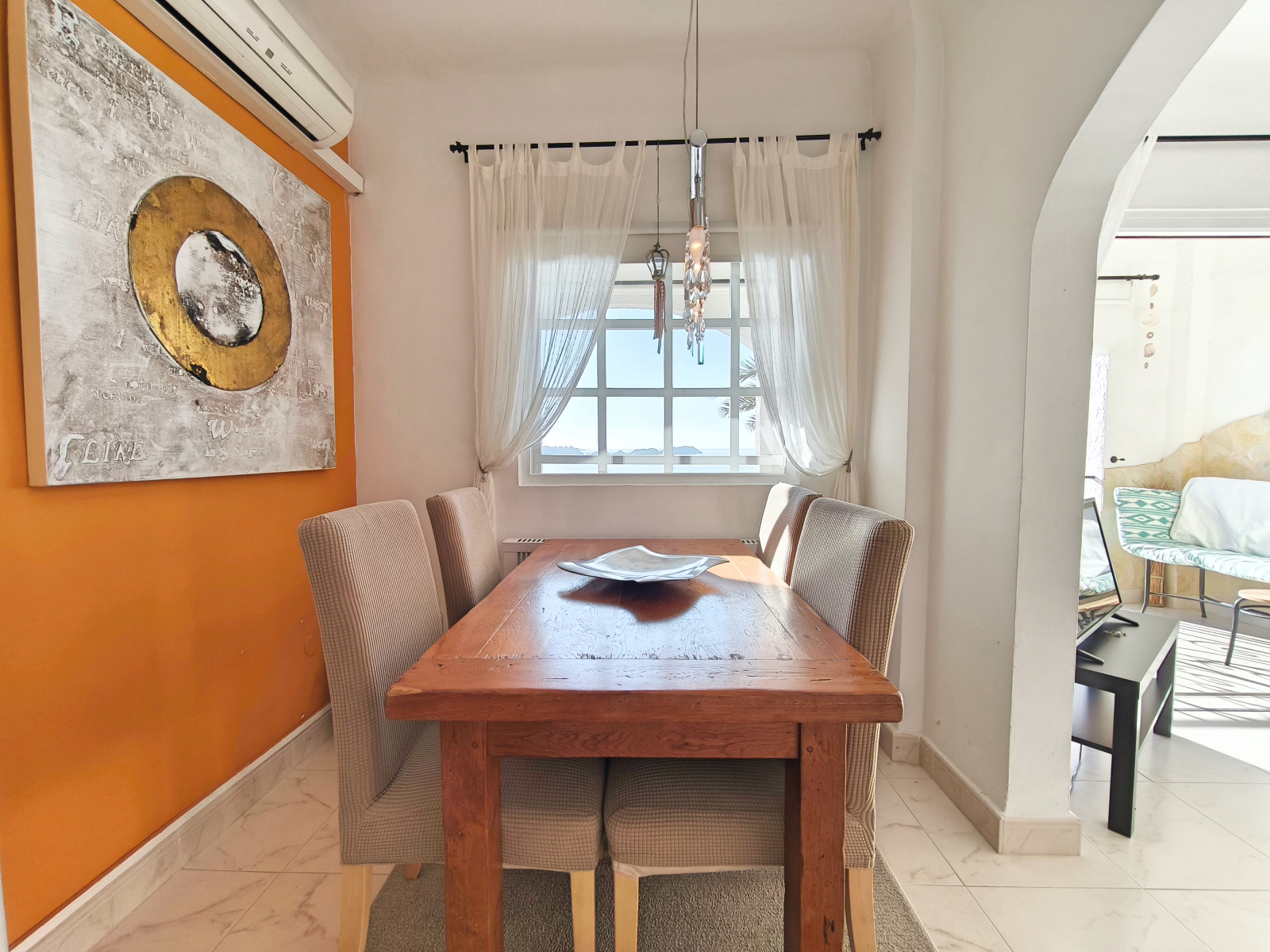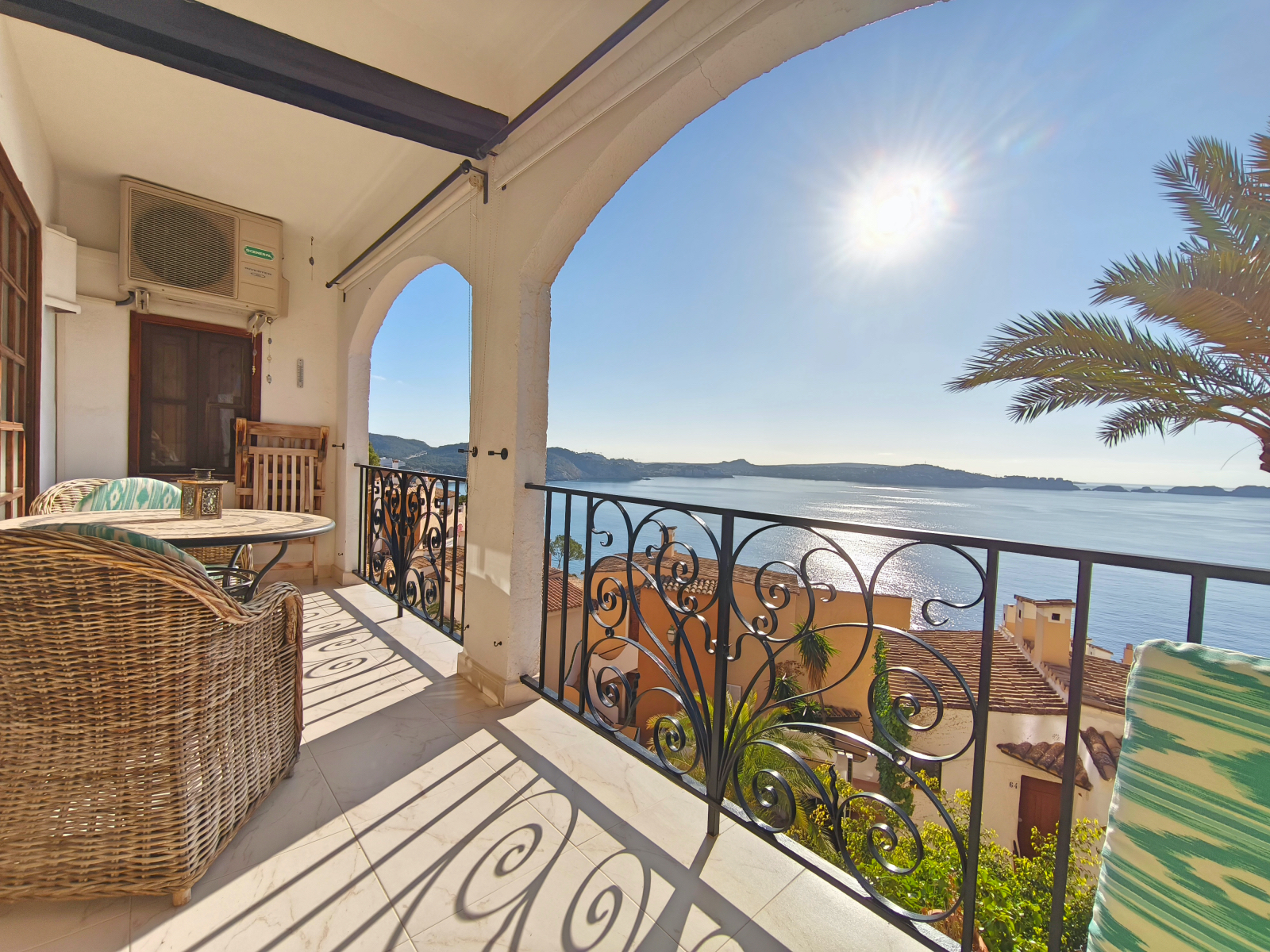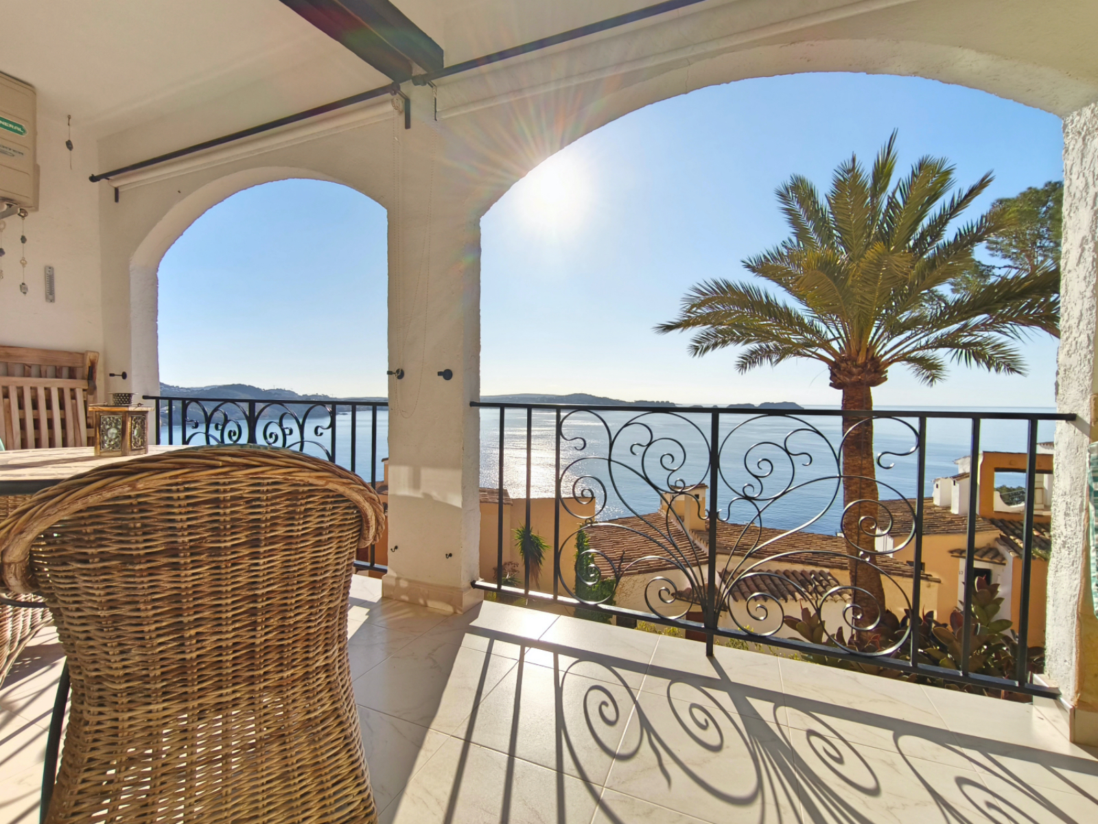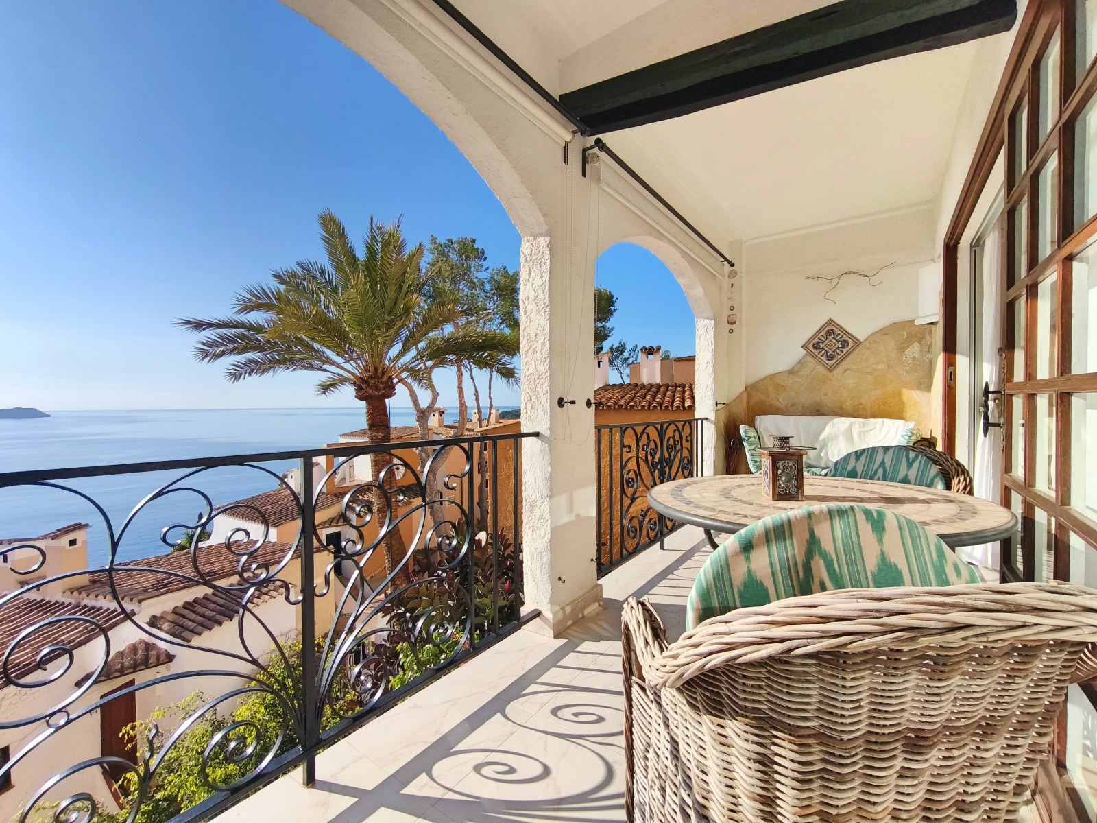 Der offene Wohn- und Essbereich in warmen Farben schafft sofort eine wohnliche Atmosphäre. Durch eine große, bodentiefe Schiebetür gelangen Sie auf Ihre private, überdachte 8 m² große Terrasse – der ideale Ort, um den Tag mit einem Frühstück mit Meerblick zu beginnen oder bei einem Glas Wein und Tapas ausklingen zu lassen. Das Schlafzimmer mit komfortablem Doppelbett bietet ebenfalls diesen fantastischen Blick. Für zwei weitere Gäste steht gegen Aufpreis ein Schlafsofa zur Verfügung.