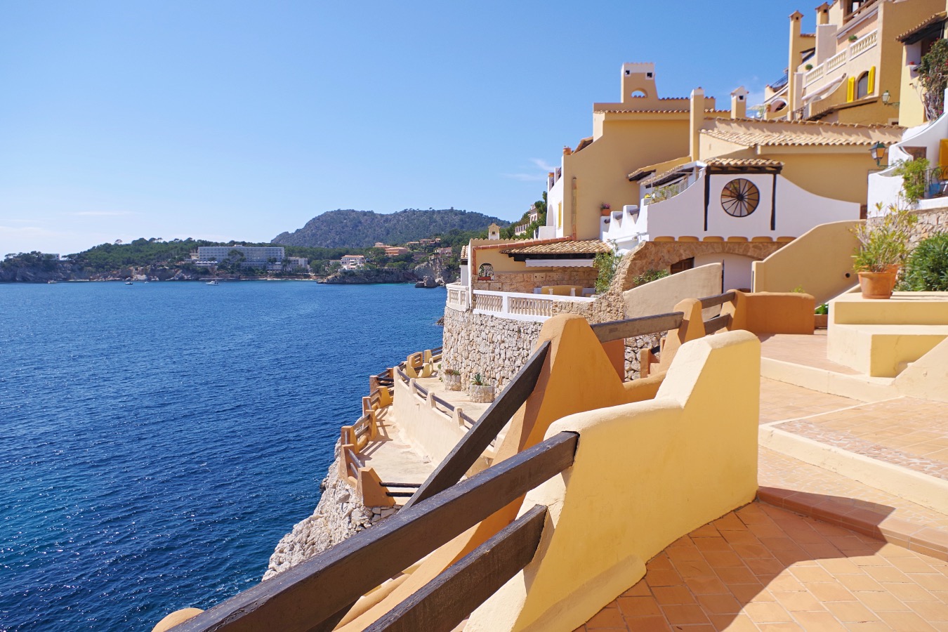 Die Wohnung liegt nur ca. 16 Stufen vom Eingang entfernt. Der Gemeinschaftspool, der spektakulär direkt über dem Meer liegt, ist über einen Treppenweg durch die Anlage oder eine Zufahrtsstraße bequem erreichbar. Direkt am Pool lädt ein Restaurant zur Stärkung ein. Über Treppen gelangen Sie zudem zu einem Meerzugang mit Leiter und weiteren Sonnenterrassen. Die Anlage selbst bietet mit drei Restaurants, einem Lebensmittelladen und einer Eisdiele alles für einen rundum sorglosen Aufenthalt (saisonal geöffnet).