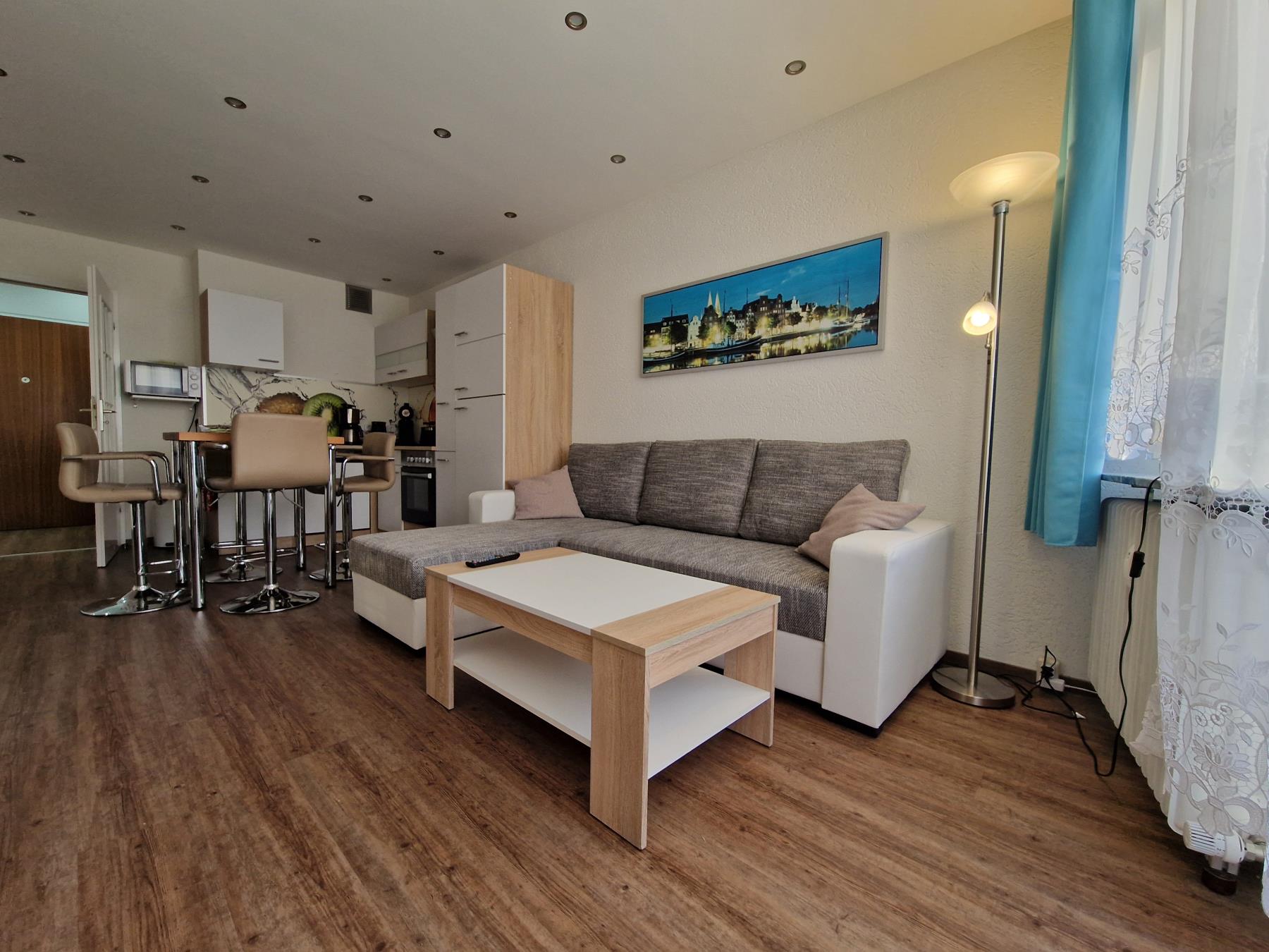 Der Fußboden des Appartements ist komplett mit hochwertigen Designerplanken belegt. Im Wohnzimmer befindet sich eine moderne Einbauküche, die keine Wünsche offen läßt: mit Essplatz (Der Tisch ist auf ein fast "normales" Mass eingekürzt worden, die Stühle sind entsprechend verstellbar!!), Geschirrspüler, Backofen, 4-Zonen-Ceranfeld, Kühlschrank mit Gefrierfach, Dunstabzugshaube, Kaffeemaschine, Wasserkocher, Eierkocher, Toaster sowie ausreichend Geschirr, Bestecke, Töpfe usw.