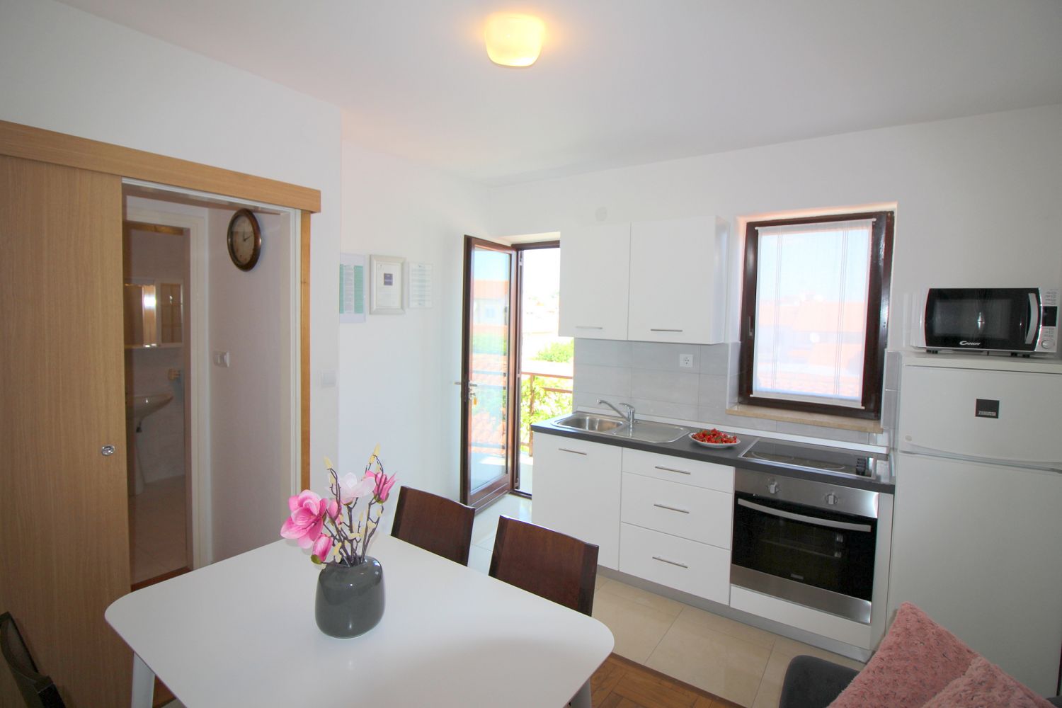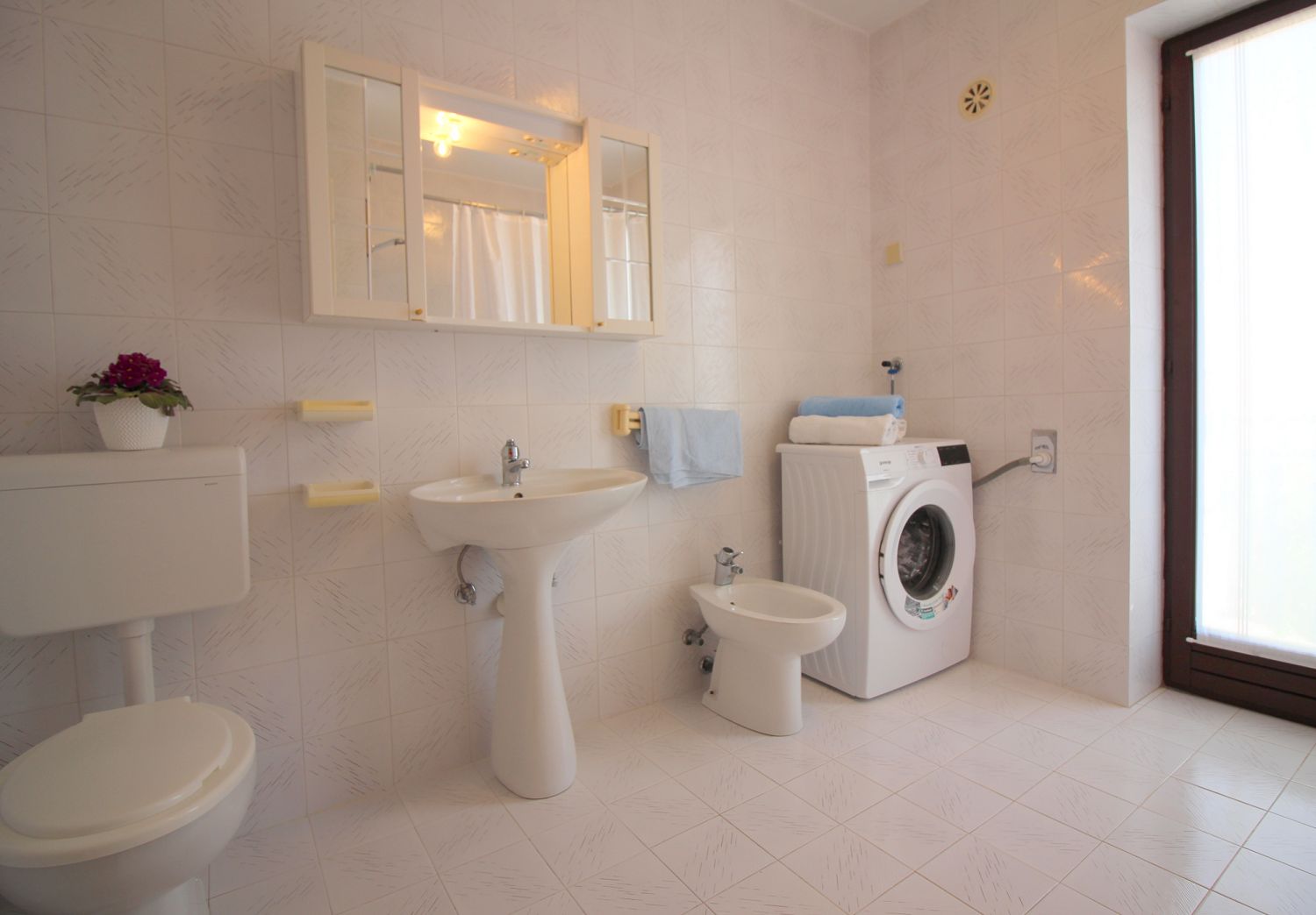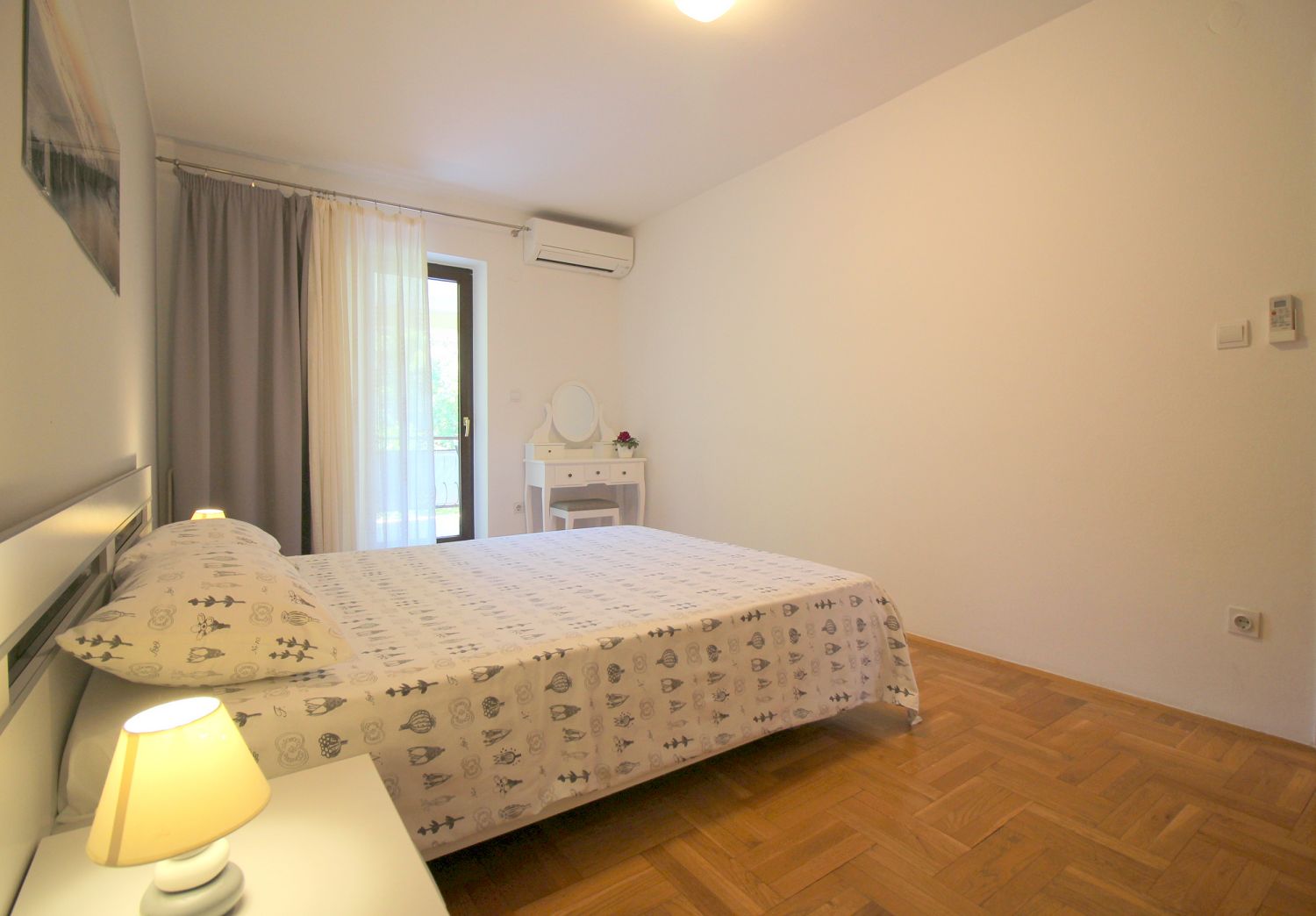 Die Ferienwohnungen befinden sich im Ortsteil Novo Naselje, nur 400 Meter vom Strand Brulo sowie von Sportmöglichkeiten und Restaurants entfernt. Die Altstadt von Porec ist in nur 15 Minuten zu Fuß erreichbar. Im Haus werden insgesamt zwei Ferienwohnungen vermietet, der Vermieter wohnt im Erdgeschoss. Ein überdachter Parkplatz für zwei Autos steht vor dem Haus zur Verfügung. Die Ferienwohnung für vier Personen liegt im ersten Stock auf einer Fläche von 60 m². Sie verfügt über einen Wohnraum mit Esstisch, Küche und Sat-TV, ein Bad mit Wanne/WC im Flur sowie zwei Doppelbettschlafzimmer, beide mit Ausgang zur großen, überdachten Terrasse mit Meerblick und Gartenmöbeln. Eine Klimaanlage und WLAN sind vorhanden und im Preis inbegriffen.