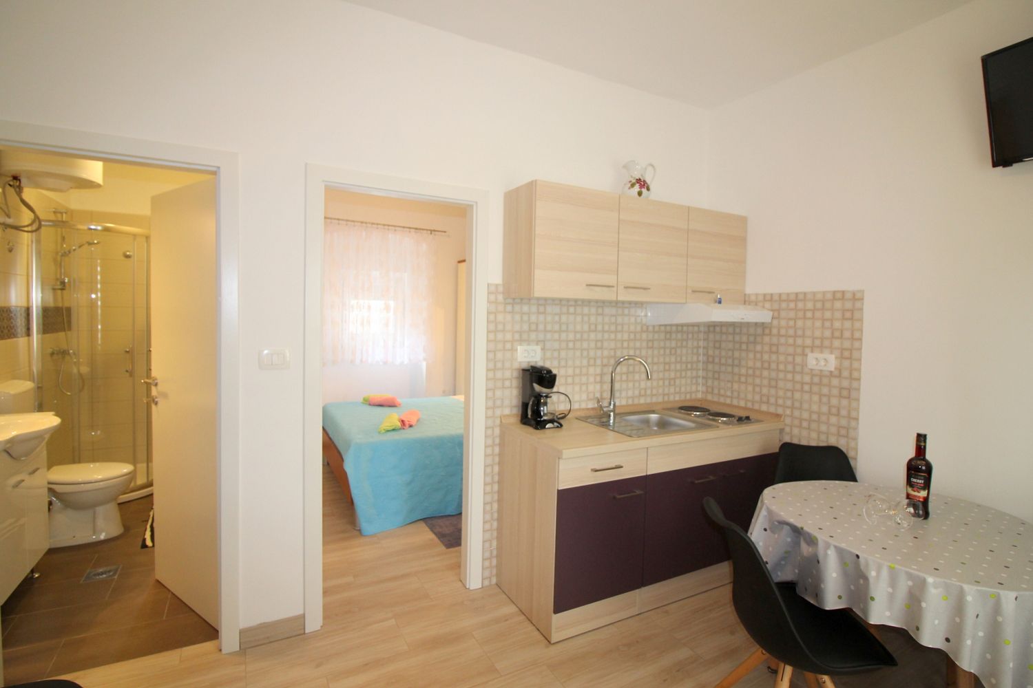 Die Ferienwohnung liegt im Stadtzentrum in unmittelbarer Nähe zu Restaurants und Geschäften. Der nächste Strand ist ca. 400 m entfernt. Ein Parkplatz für ein Auto ist auf dem öffentlichen Parkplatz in Porec, nur 300 m von der Ferienwohnung entfernt, verfügbar. Die geschmackvoll eingerichtete Ferienwohnung bietet auf 26 m² Platz für zwei bis drei Personen. Sie befindet sich im Erdgeschoss und besteht aus einer Essküche mit Schlafcouch, einem Schlafzimmer mit Doppelbett und einem Bad mit Dusche und WC. WLAN und Klimaanlage sind vorhanden und im Preis inbegriffen.