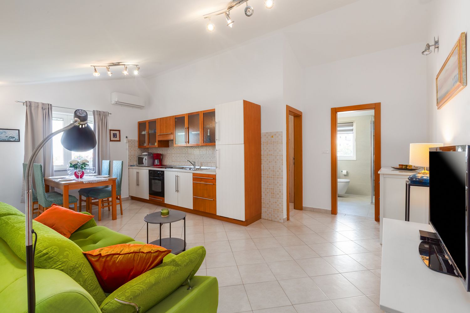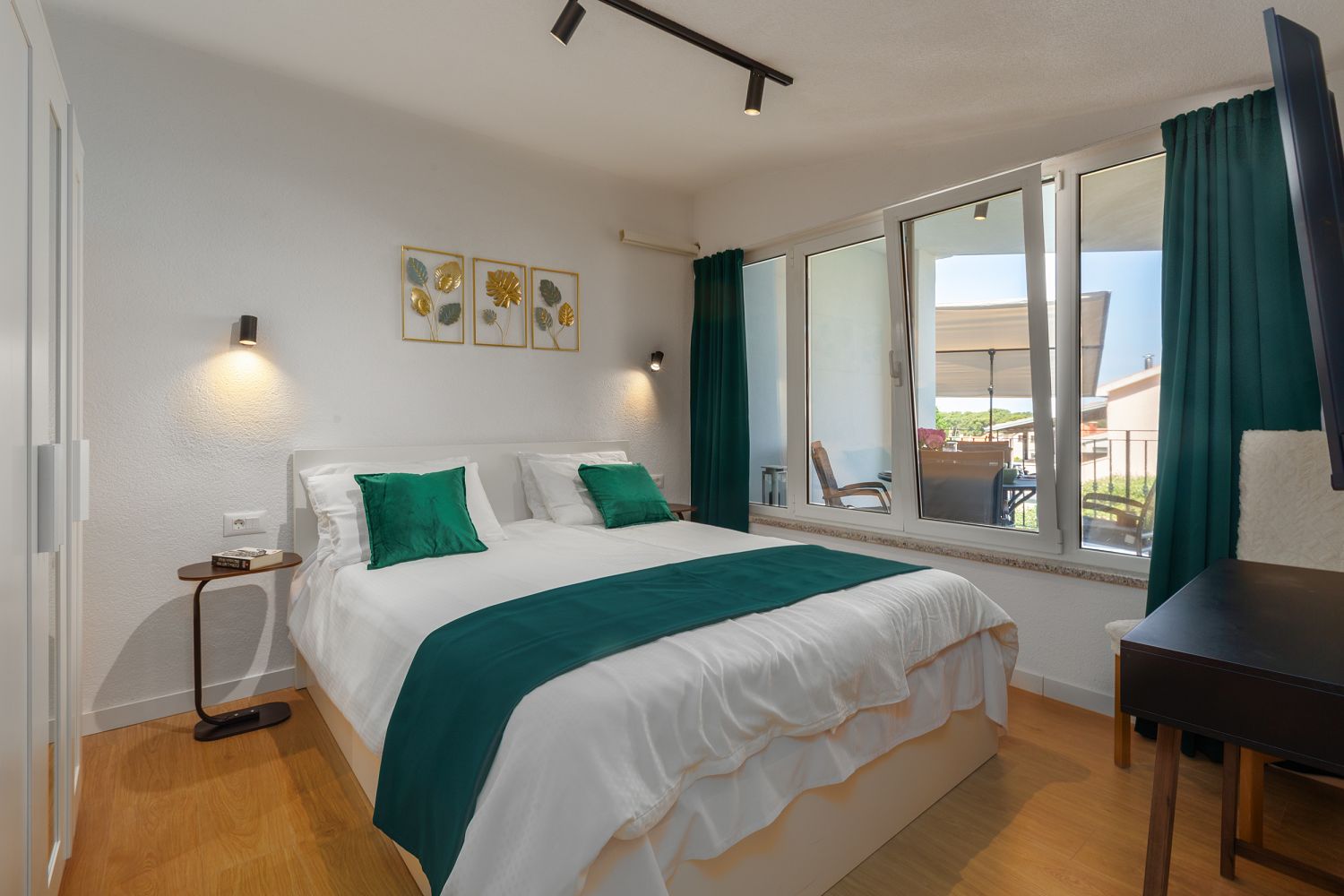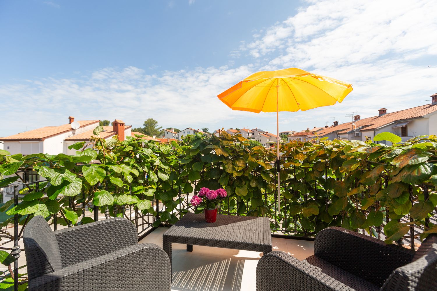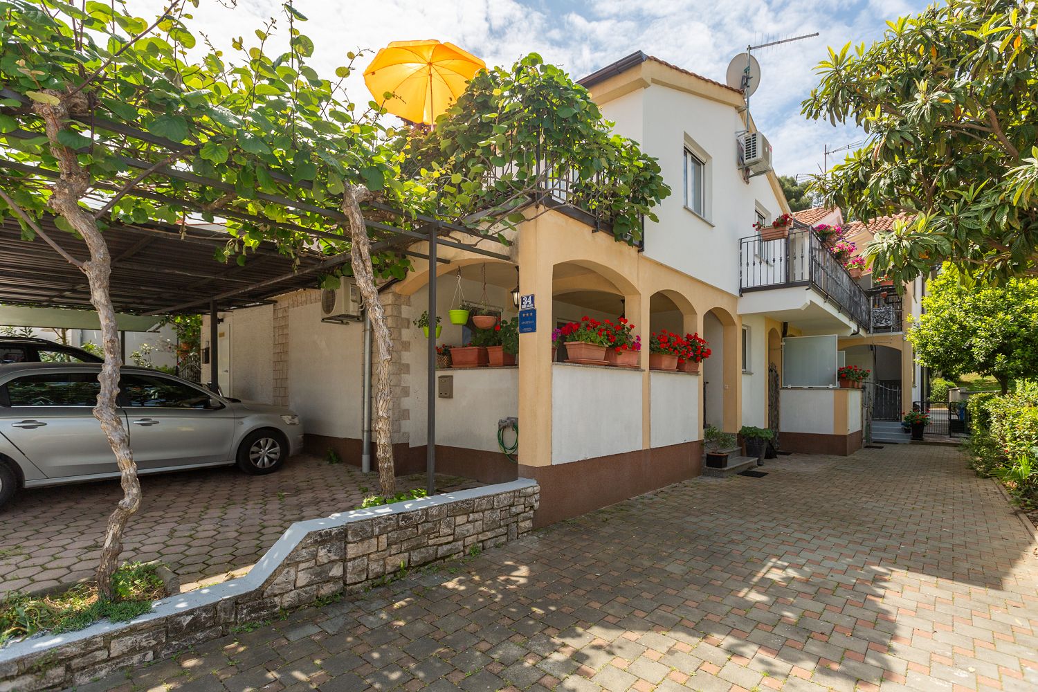 Die Ferienwohnungen befinden sich in einem ruhigen Ortsteil von Porec namens Novo Naselje, nur wenige Minuten zu Fuß durch den Pinienwald vom Strand Brulo entfernt. Einkaufsmöglichkeiten und Restaurants sind ebenfalls in der Nähe und zur Altstadt sind es ca. 700 m. Der Hausbesitzer wohnt im Haus, ein Parkplatz auf dem Grundstück steht zur Verfügung. Insgesamt werden drei Ferienwohnungen im Haus vermietet. Die Ferienwohnung befindet sich im ersten Stock des Hauses und ist mit modernen Möbeln ausgestattet. Die für zwei bis vier Personen geeignete Ferienwohnung hat eine Wohnfläche von 65 m² und besteht aus einer klimatisierten Wohnküche mit Couch und Essbereich, Dusche/WC, zwei Doppelbettschlafzimmern, eines davon mit Sat-TV und einem Balkon mit teilweise Meerblick. Beim Eingang steht eine schöne, überdachte Terrasse mit Sitzgarnitur zur Verfügung. Klimaanlage und WLAN sind vorhanden und im Preis inbegriffen.