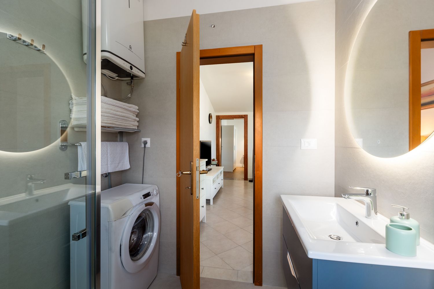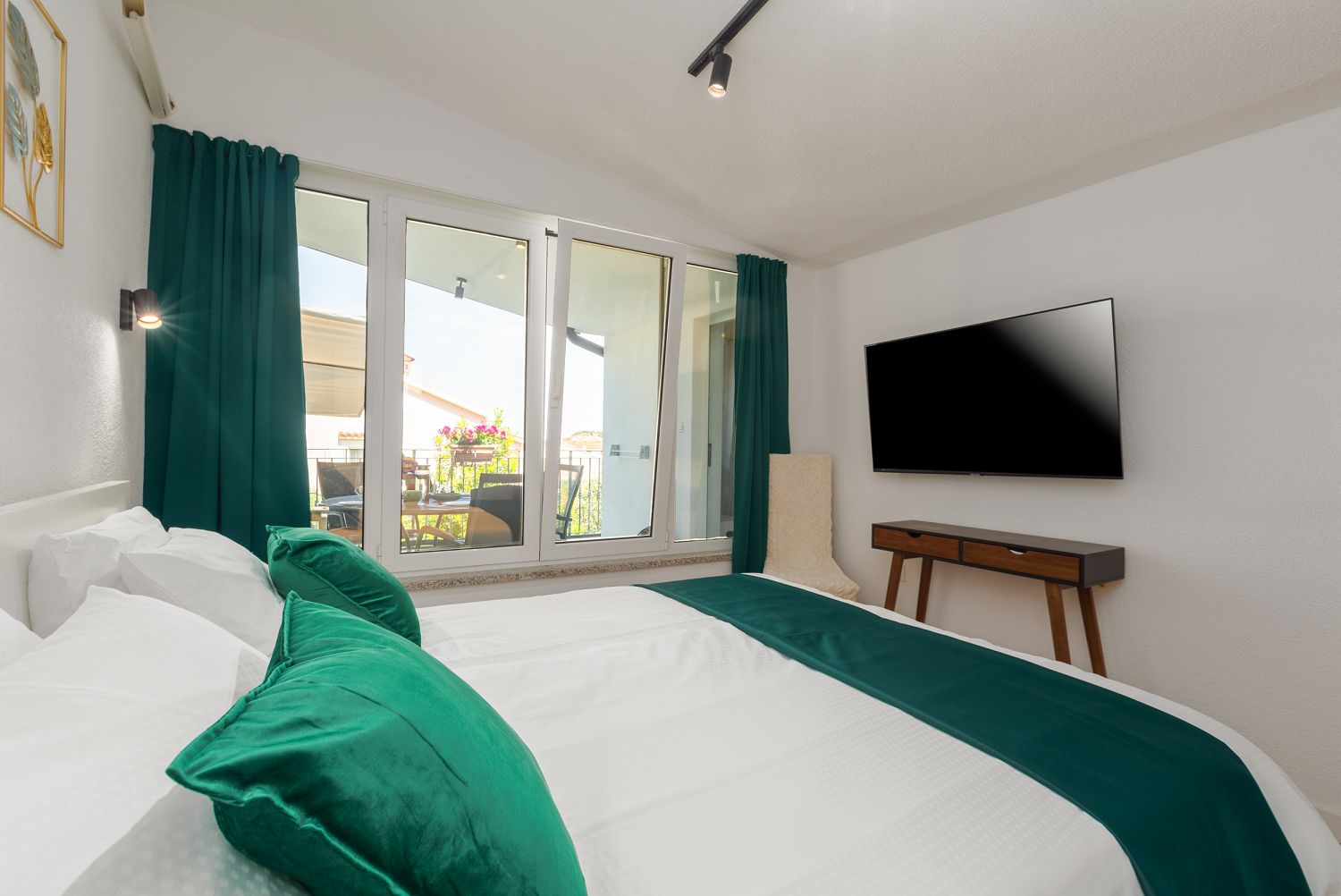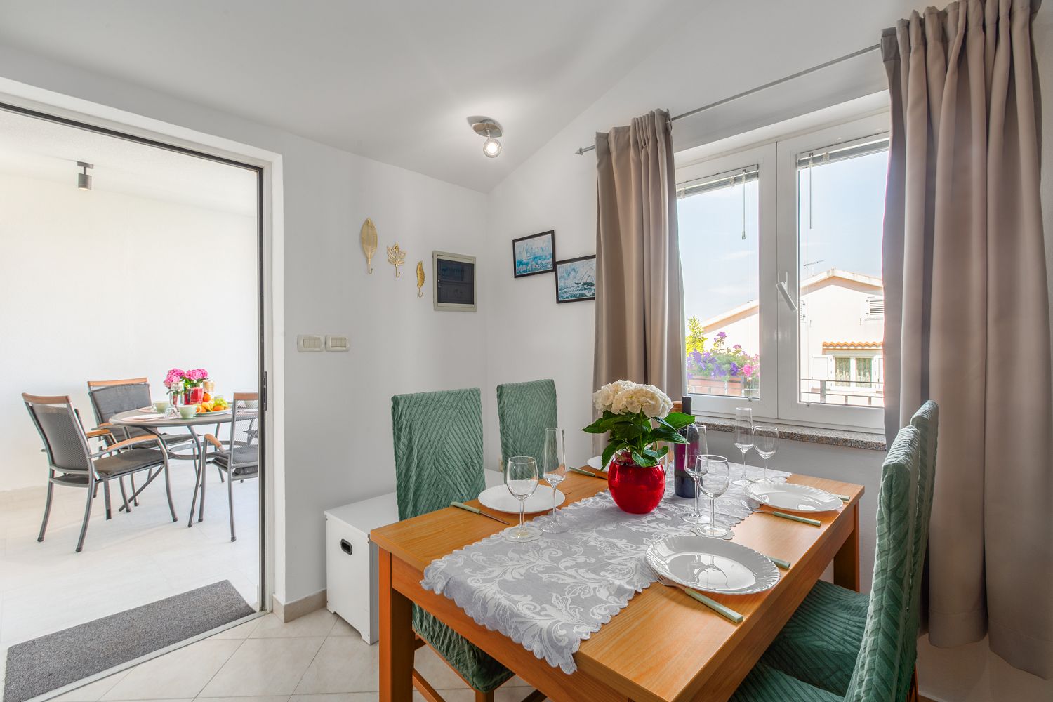 Die Ferienwohnungen befinden sich in einem ruhigen Ortsteil von Porec namens Novo Naselje, nur wenige Minuten zu Fuß durch den Pinienwald vom Strand Brulo entfernt. Einkaufsmöglichkeiten und Restaurants sind ebenfalls in der Nähe und zur Altstadt sind es ca. 700 m. Der Hausbesitzer wohnt im Haus, ein Parkplatz auf dem Grundstück steht zur Verfügung. Insgesamt werden drei Ferienwohnungen im Haus vermietet. Die Ferienwohnung befindet sich im ersten Stock des Hauses und ist mit modernen Möbeln ausgestattet. Die für zwei bis vier Personen geeignete Ferienwohnung hat eine Wohnfläche von 65 m² und besteht aus einer klimatisierten Wohnküche mit Couch und Essbereich, Dusche/WC, zwei Doppelbettschlafzimmern, eines davon mit Sat-TV und einem Balkon mit teilweise Meerblick. Beim Eingang steht eine schöne, überdachte Terrasse mit Sitzgarnitur zur Verfügung. Klimaanlage und WLAN sind vorhanden und im Preis inbegriffen.